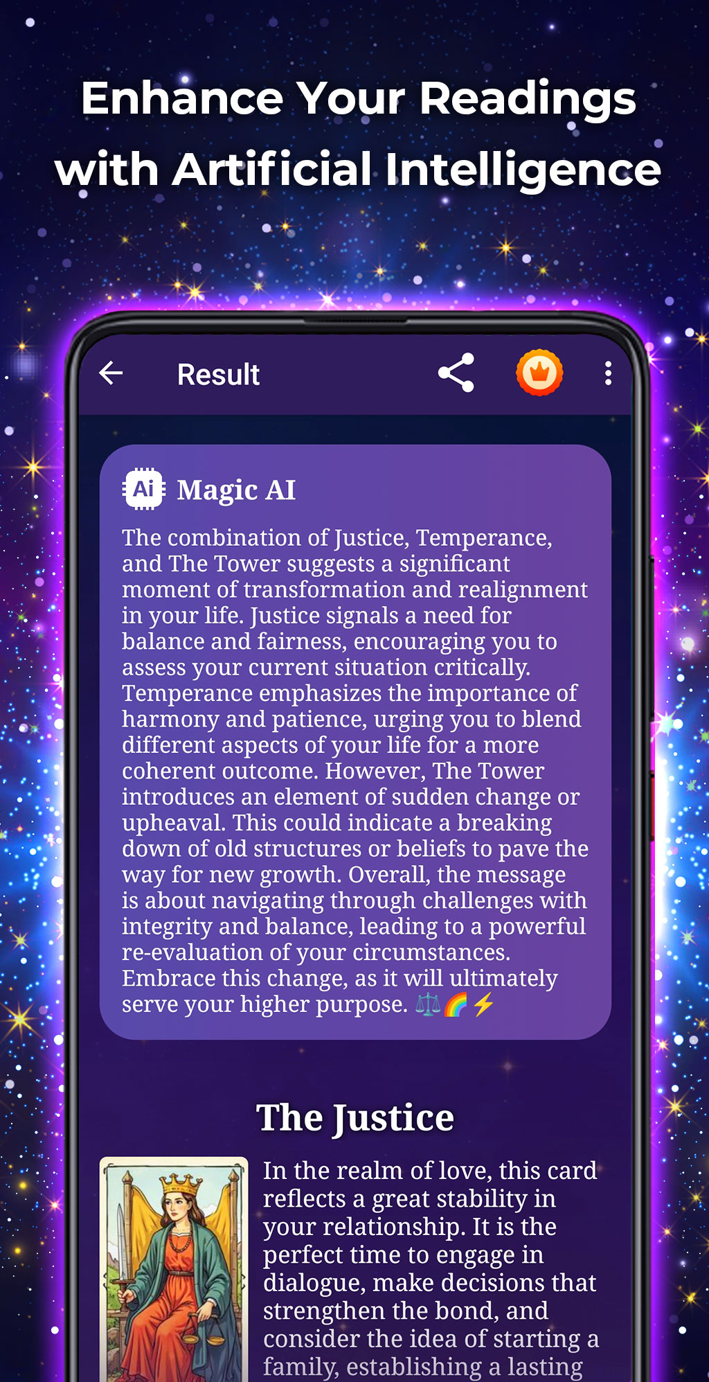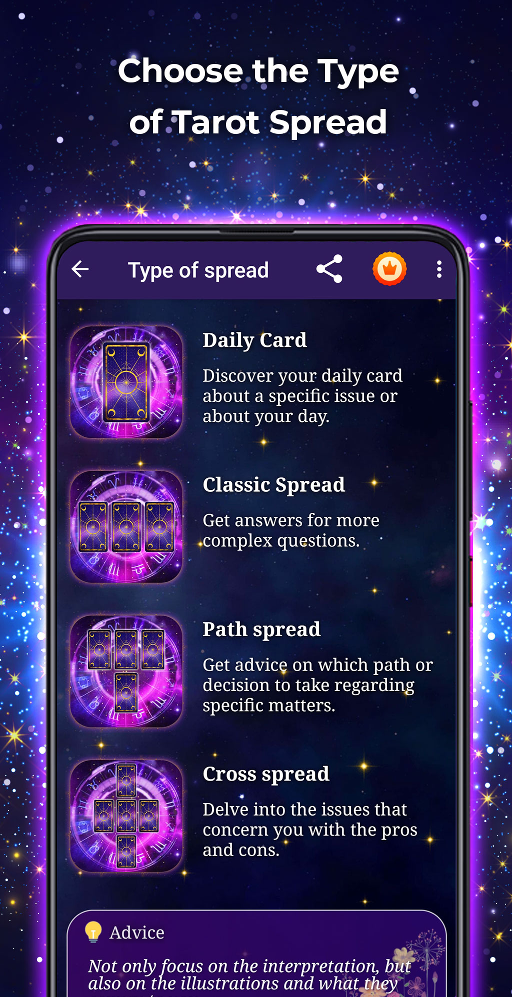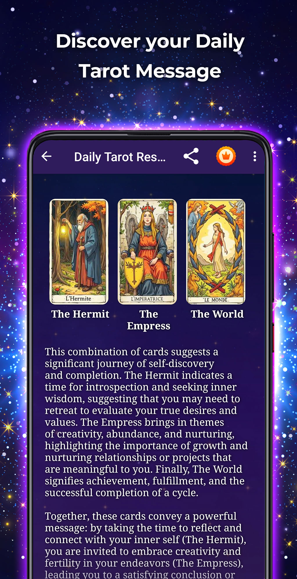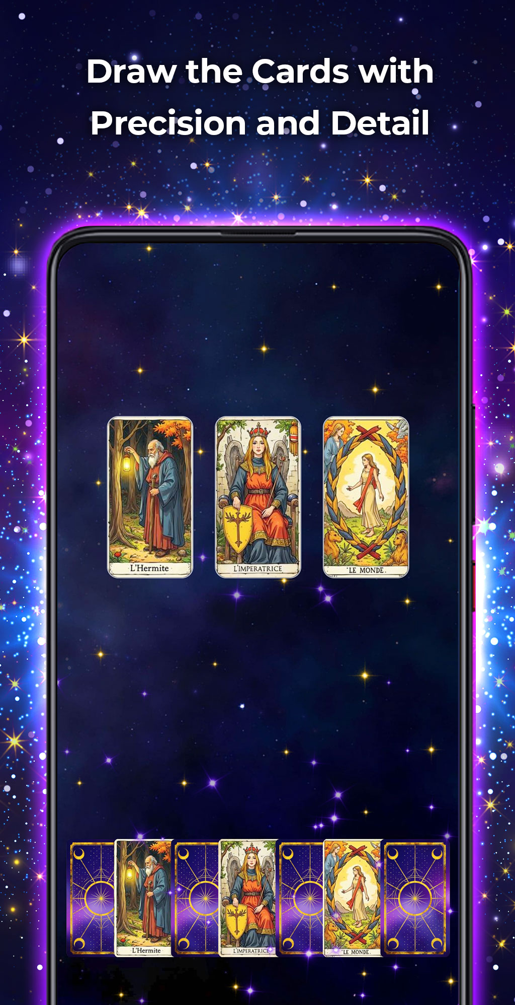 Wir haben hart gearbeitet, um Ihnen die beste Erfahrung des Kartenlegens zu bieten, eine Erfahrung, die so nah wie möglich an einer echten Sitzung mit einem Tarot-Leser ist. Unabhängig von Ihrer Erfahrung, dank der Interpretation der Karten, ist die App für Anfänger und Experten geeignet.
