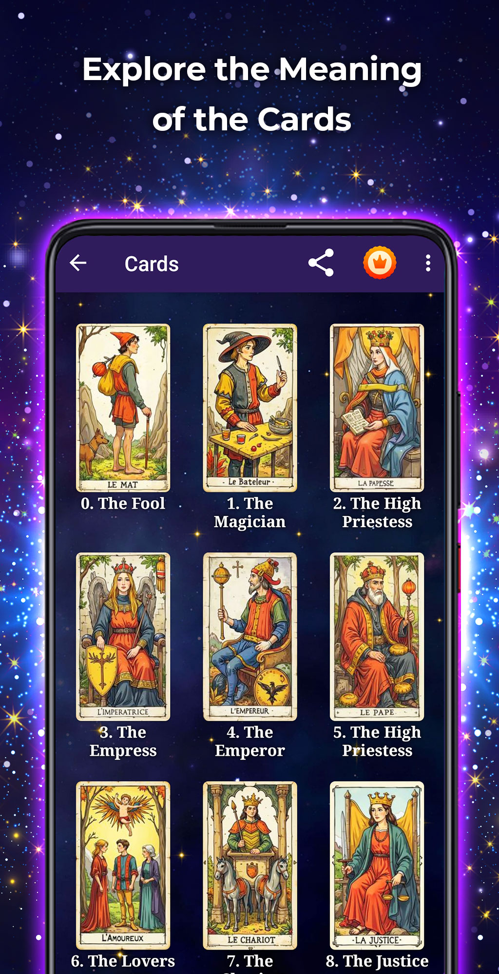 - Greifen Sie auf die Bedeutung aller Karten zu. So können Sie die Anwendung als Ergänzung zu Legesystemen mit echten Karten oder einfach zum Lernen verwenden.