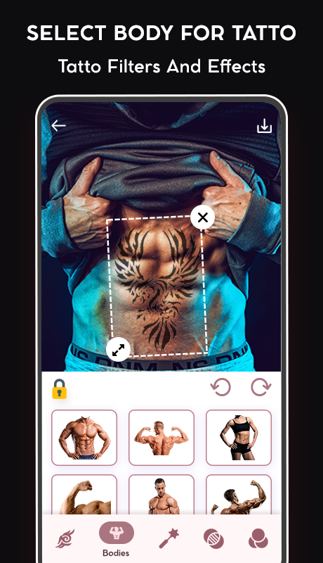3. Anpassungsoptionen: Sobald ein virtuelles Tattoo aufgetragen wurde, können Benutzer es weiter an ihre Vorlieben anpassen. Sie können die Größe des Tattoos ändern, es drehen und neu positionieren, um sicherzustellen, dass es perfekt auf den von Ihnen gewählten Körperteil passt. Die App bietet außerdem Optionen zum Anpassen der Farbintensität und Deckkraft des Tattoos für ein realistischeres Erscheinungsbild.
