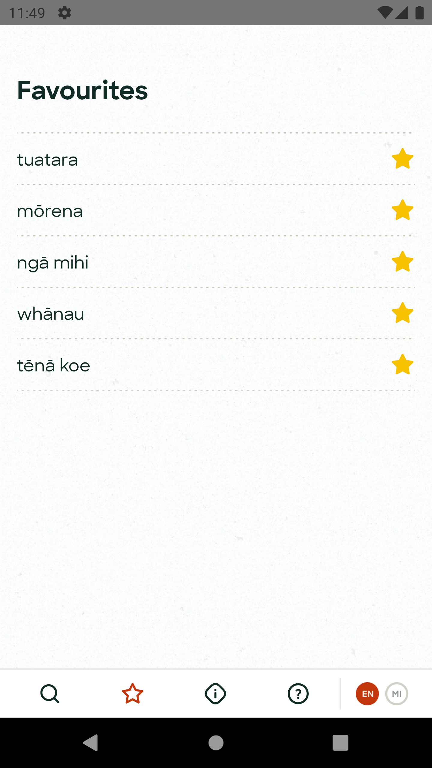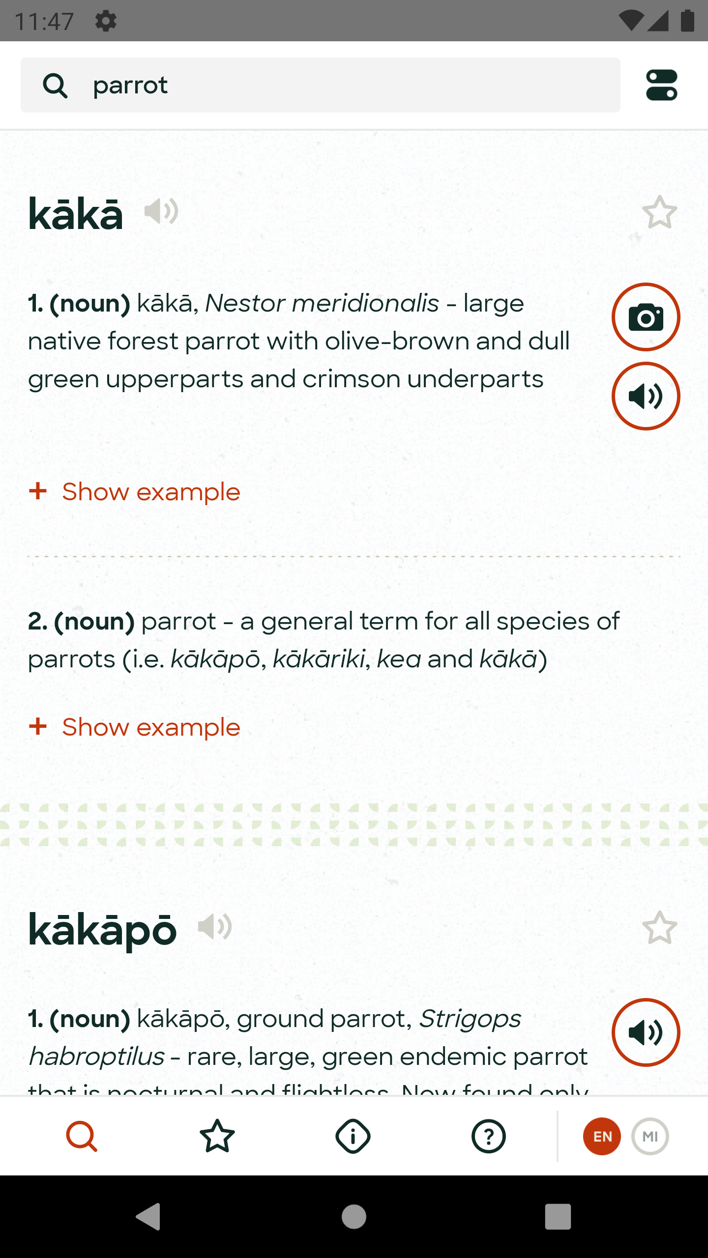 Te Aka ist ein Māori-Sprachwörterbuch, das einfach zu verwenden ist, indem Sie nach Māori- oder englischen Wörtern suchen. Es beinhaltet die Möglichkeit, Suchergebnisse zu filtern und Definitionen in einer Favoritenliste zu speichern. Derzeit befinden sich über 24.000 Māori-Stichworteinträge in der Datenbank, die im Laufe der Zeit erweitert wird. Ein Offline-Wörterbuch wurde auch hinzugefügt, wenn keine Internetverbindung verfügbar ist. Neben englischen Bedeutungen enthält es Beispielsätze mit Übersetzungen für viele Einträge. Es enthält sogar Fotos und Audioclips für die einheimische Fauna von Aotearoa/Neuseeland und Fotos von Flora, wichtigen Personen und anderen Gegenständen, bei denen ein Foto zum Verständnis beiträgt. Zusätzlich zu den Wörtern, die man in einem traditionellen Wörterbuch erwarten würde, enthält es auch enzyklopädische Einträge, die wichtige Informationen über Pflanzen, Tiere, Sterne, Planeten, Himmelskörper, wichtige Māori-Leute, wichtige Vorfahren traditioneller Erzählungen, Stammesgruppen und Ahnenkanus enthalten , Liedtypen, Musikinstrumente, Māori-Namen für Institutionen, Ländernamen, Ortsnamen und andere Eigennamen. Es gibt auch detaillierte Erklärungen von Schlüsselkonzepten, die für die Māori-Kultur von zentraler Bedeutung sind. Umfassende Erläuterungen zu grammatikalischen Elementen mit Anwendungsbeispielen sind ebenso enthalten wie Redewendungen und umgangssprachliche Ausdrücke mit ihren Bedeutungen und Beispielen. Die Te Aka Maori-App ist der Begleiter der beliebten Website www.maoridictionary.co.nz und Teil der Te Whanake Māori-Sprachlernserie.