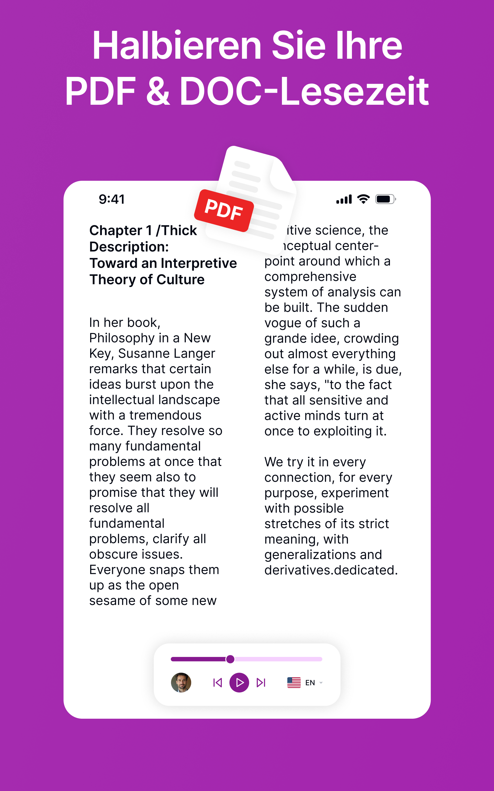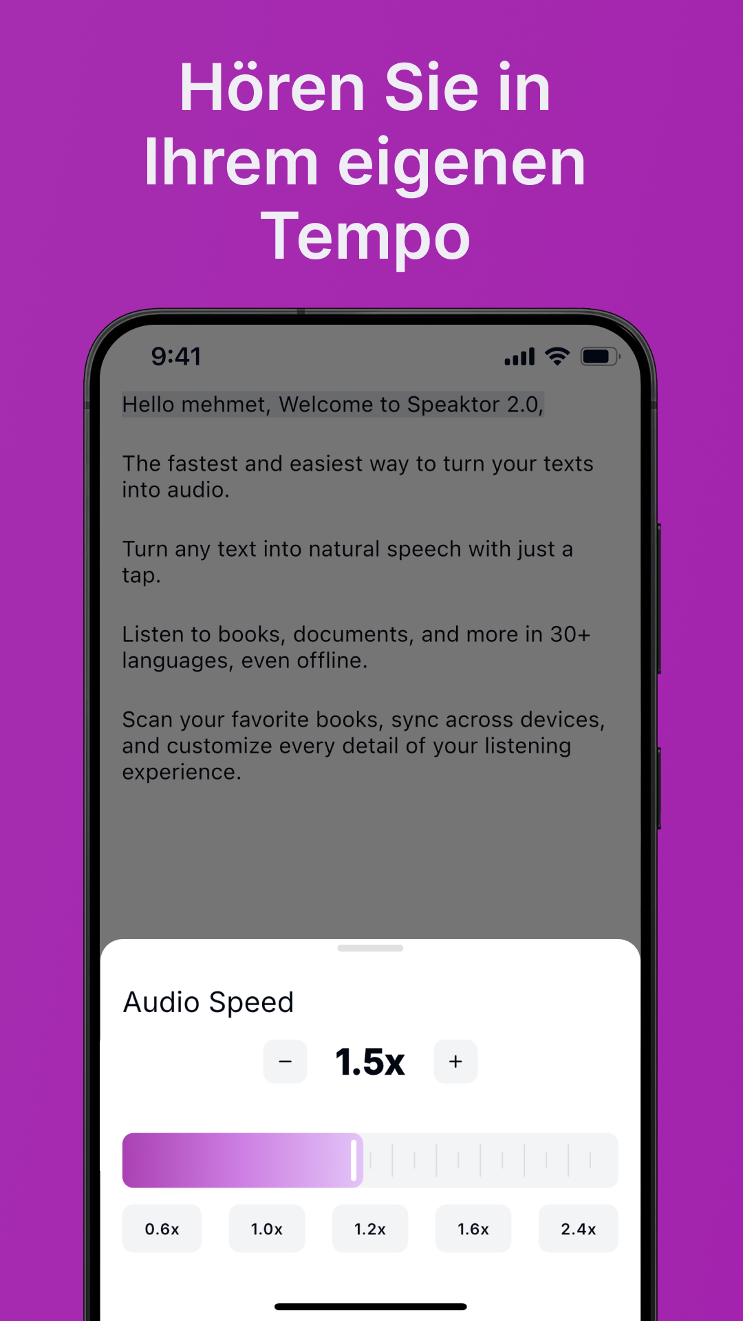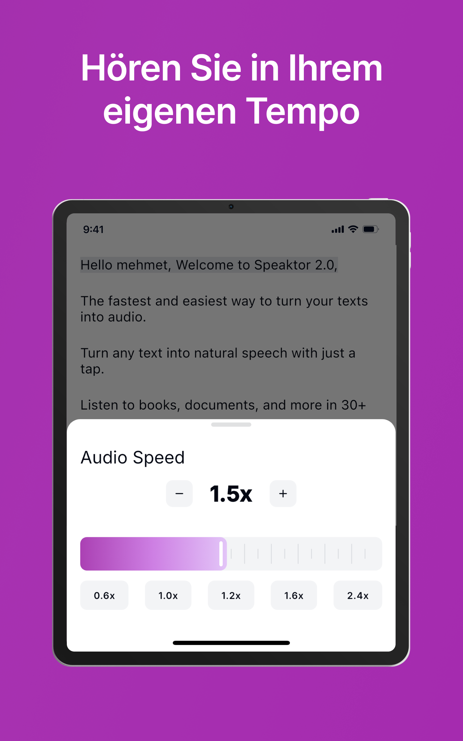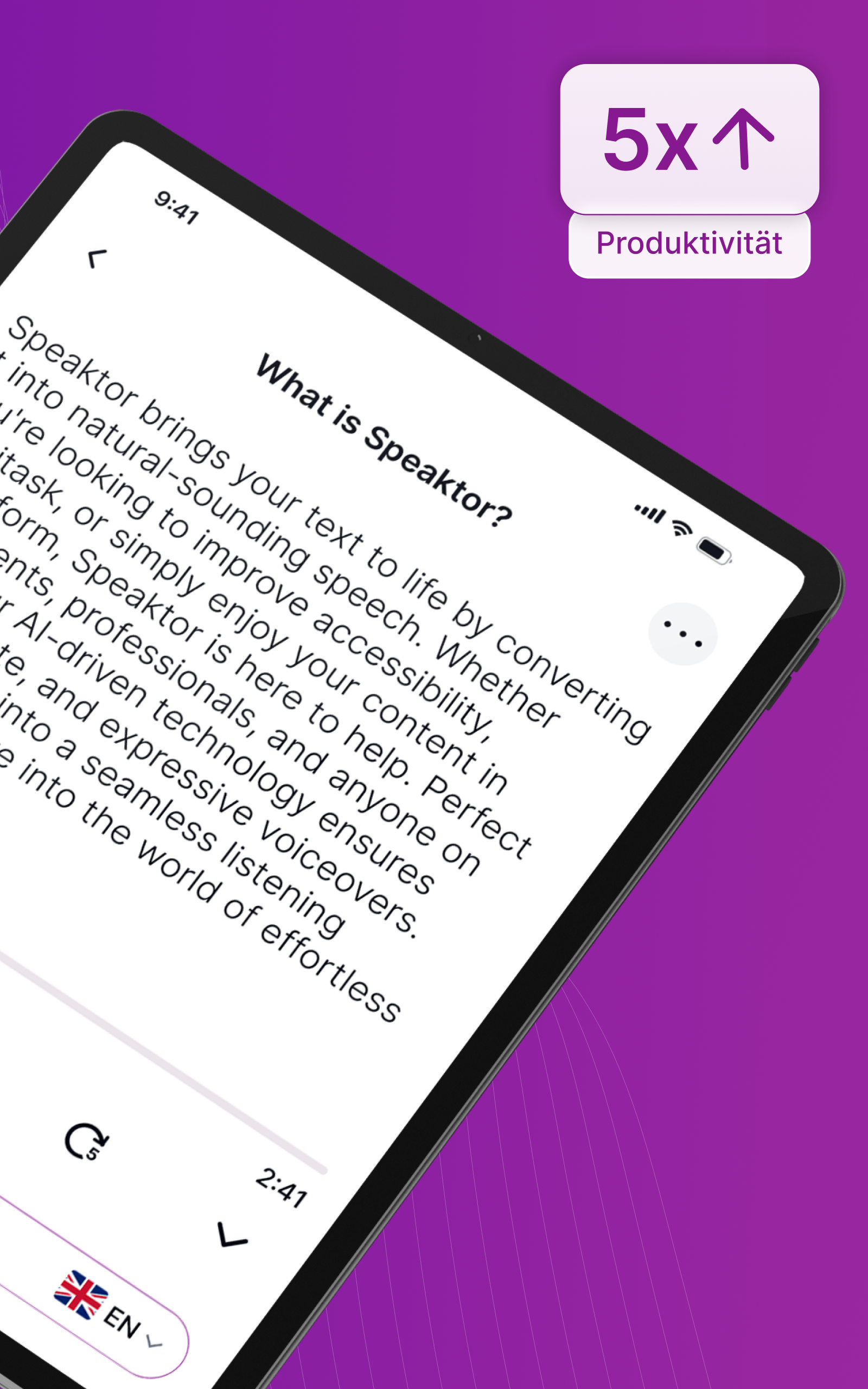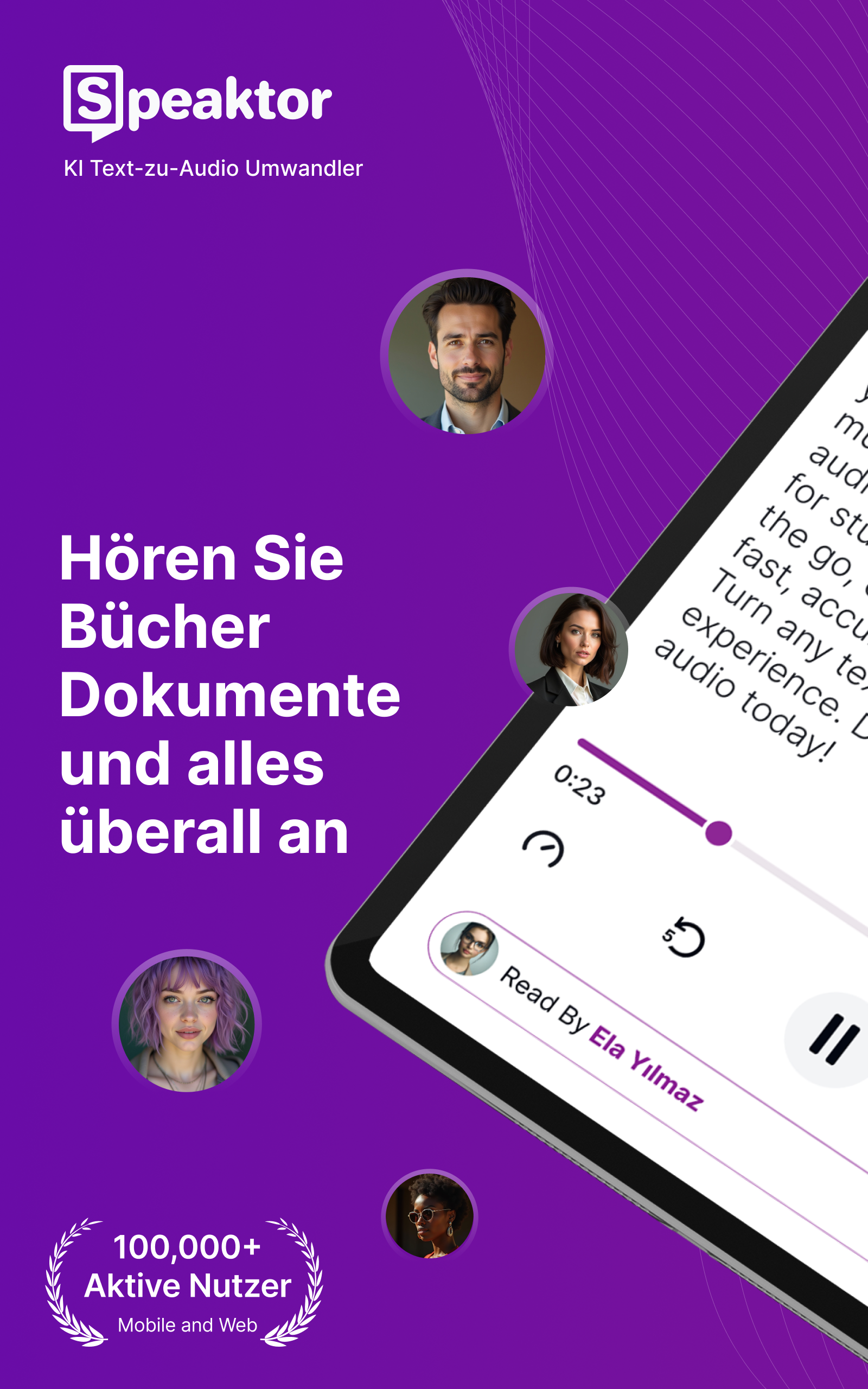 Was ist SPEAKTOR? SPEAKTOR ist ein Text-zu-Sprache-Konverter, der jede Textdatei in eine Rede umwandelt und sie Ihnen vorliest. Diese KI-gestützte Text-to-Speech-App wandelt jedes Wort in eine Sprache um. SPEAKTOR hat den Text-zu-Sprache-Konverter für alle einfacher gemacht, von Forschern bis hin zu Reisenden. Es gibt mehrere Vorteile der Text-to-Speak-Kommunikation. Warum lieben Menschen SPEAKTOR, um Text in Sprache umzuwandeln? ★ Lassen Sie sich den Sprachsynthesizer vorlesen ★ Konvertieren Sie Text in Sprache auf Deutsch, um produktiver zu sein ★ Konvertieren Sie Text innerhalb von Minuten automatisch in Sprache mit dem natürlichen Lesegerät ★ Arbeiten Sie schneller in der Schule und arbeiten Sie mit dem Text-zu-Sprache-Konverter ★ SPEAKTORS Textleser kann Ihnen helfen, jeden Artikel laut vorzulesen ★ Hören Sie sich Lektionen und Bücher mit Text-zu-Sprache-Konverter an ★ Scannen Sie ein Buch und sehen Sie zu, wie SPEAKTOR laut vorliest ★ Hat einen eingebauten Bildschirmleser ★ SPEAKTOR benötigt nur wenige Minuten, um Text zu scannen und zu lesen Ich möchte, dass mir eine App vorliest! Sie möchten unterwegs ein Buch hören, haben aber keine Zeit oder lesen einfach nicht gerne? Haben Sie jemals gedacht: „Ich wünschte, jemand würde mir vorlesen“? Dann ist SPEAKTOR genau das Richtige für Sie. Mit SPEAKTOR können Sie Geschichten und Artikel genießen, indem Sie sie anhören. Es liest jeden Text, Inhalt, jedes Dokument oder Buch, das ihm gegeben wird, laut vor, was es jedem ermöglicht, der nicht lesen kann oder möglicherweise nicht gut laut lesen kann. Mit der Sprachsynthesizer-Technologie wird Ihnen Ihr Hörbuch nie wieder langweilig. Wie lesen mir TTS-Apps vor? Dieser Textleser erfasst nicht nur den Rhythmus und die Geschwindigkeit, sondern auch den Ton, in dem jemand Wörter aussprechen würde. SPEAKTOR klingt derzeit anders als alle anderen Textleser auf dem Markt. Mit innovativen Fortschritten in der Sprachsynthesetechnologie können Sie Texte in Audio umwandeln, die Sie sich überall anhören können. Nutzen Sie einfach diesen neuen Textlesedienst. Sie brauchen nichts Besonderes, um auf SPEAKTOR zuzugreifen. Laden Sie einfach einen Text oder ein Buch hoch, das vorgelesen wird, wo und wann immer Sie wollen. Speaktor ist ein natürlicher Leser. Es ist der beste Screenreader auf dem Markt. Manche Leute ziehen es vor, ihre Telefone laut vorlesen zu lassen; Diese Art von Textlesetechnologie wird oft als „Text-to-Voice-App“ bezeichnet. Es ermöglicht denjenigen, die nicht auf einem Bildschirm tippen können, die Wörter vor ihnen zu hören und notwendige Änderungen vorzunehmen. Dieser Inhaltskonsummodus wurde für Personen in Betracht gezogen, die ihre Augen nicht in großem Umfang verwenden möchten. SPEAKTOR bietet deutschen Text zum Sprechen und eine Lesegeschwindigkeitskontrolle. SPEAKTOR kann Ihr Begleiter sein und Ihnen dabei helfen, Websites viel schneller zu sprechen, wenn Sie es eilig haben. Ein deutsches TTS-Programm mit Screenreader-Funktion Lassen Sie SPEAKTOR Ihre Texte sprechen - es wandelt Text in Sprache in Deutsch und mehr als 40 Sprachen um. Mit SPEAKTOR können Sie Inhalte in jedem Themenbereich und Format hören und hören, als ob Sie laut lesen würden. Dieses TTS-Tool kann als Screenreader für Online-Textinhalte verwendet werden, die schwer zu scannen und zu lesen sind. Der Text-zu-Sprache-Konverter (TTS) überwindet die Probleme der Bildschirmermüdung. Wenn Sie ein Buchfoto machen, scannt der Sprachsynthesizer von SPEAKTOR und liest es Ihnen in nur wenigen Minuten vor. SPEAKTOR hat auch TTS für Unternehmen und Organisationen eingeführt, damit sie Text in Sprache umwandeln können, die für alle zugänglicher ist. Text in Sprache umwandeln