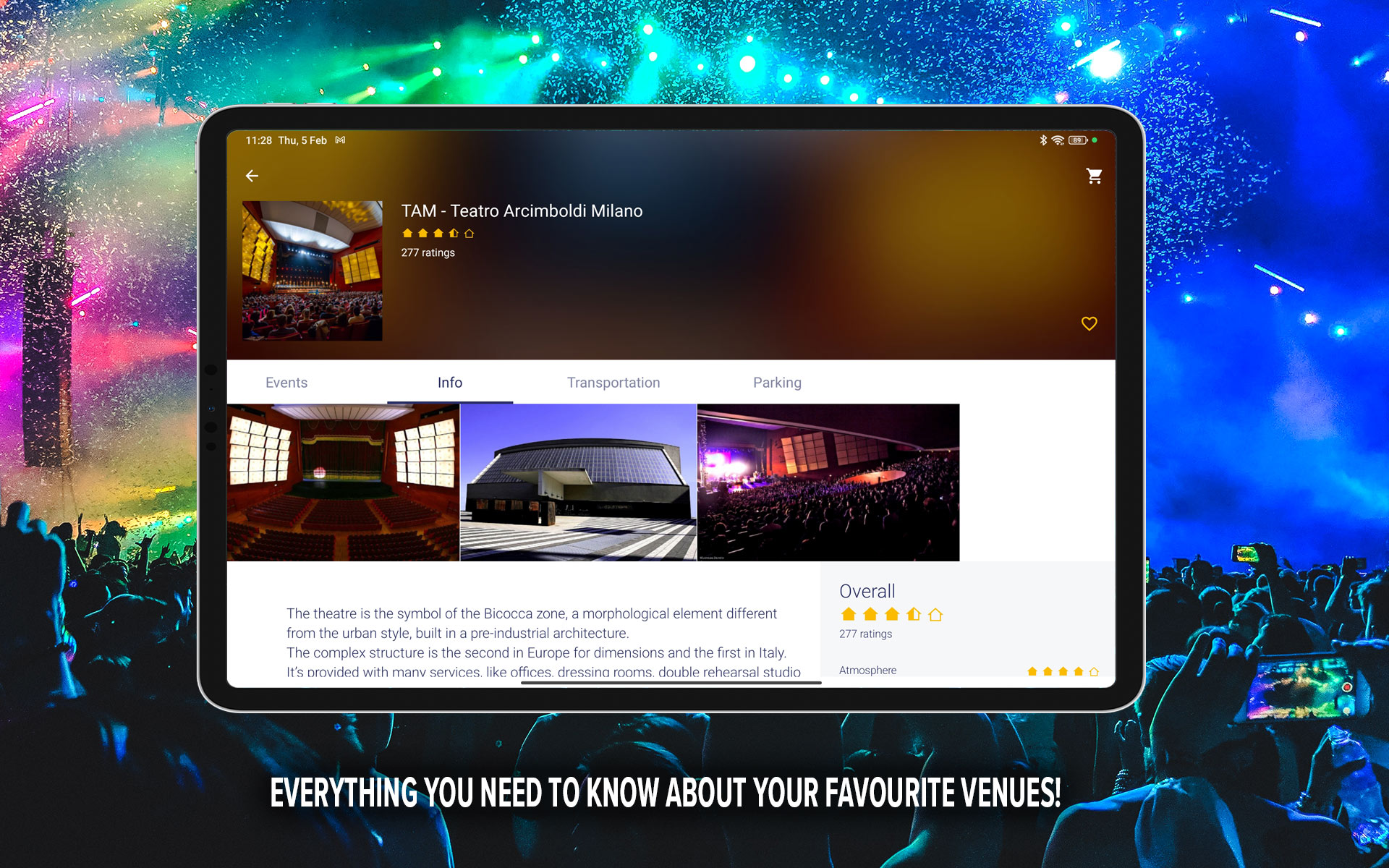 Mit der TicketOne App hast du alle Top-Events immer griffbereit! Entdecke Konzerte deiner Lieblingskünstler, Shows in deiner Stadt und die neuesten Entertainment-News. Termine, Uhrzeiten, Veranstaltungsorte und nützliche Infos – alles, was du brauchst, in einer einfachen, schnellen und benutzerfreundlichen App. Verpasse nie wieder ein Event: Kaufe deine Tickets direkt in der App, jederzeit und überall, mit nur wenigen Klicks. Hauptfunktionen: - Kombinierte Eventsuche nach Datum, Ort und Interessen - Erstelle deine Liste mit Lieblingskünstlern und -events mithilfe der App-Tipps - Ticketbenachrichtigungen und Favoritenliste: Erhalte Neuigkeiten zu Künstlern aus deiner Musikbibliothek oder zu Künstlern, die du mit dem Herzsymbol markiert hast - Schneller und einfacher Kaufprozess, optimiert für dein Smartphone, inklusive Auswahl über eine Karte Verbindungs- und Sharing-Funktion mit sozialen Medien und anderen Apps, damit du deine Leidenschaft mit deinen Freunden teilen kannst - Vorschau auf das neue exklusive FanTicket Gezieltere Benachrichtigungen, damit du über deine Lieblingsevents und -interessen immer auf dem Laufenden bist Seiten mit allen Details zu Künstlern und Veranstaltungsorten Lade print@home-Tickets direkt auf dein Smartphone herunter Menü zur besseren Verwaltung deines Profils und zur individuellen Anpassung der App Vielen Dank, dass du die TicketOne App nutzt. Deine Kommentare, Vorschläge und dein Feedback helfen uns, unseren Service täglich weiterzuentwickeln und zu verbessern. Viel Spaß beim Stöbern und Entdecken mit TicketOne.it!