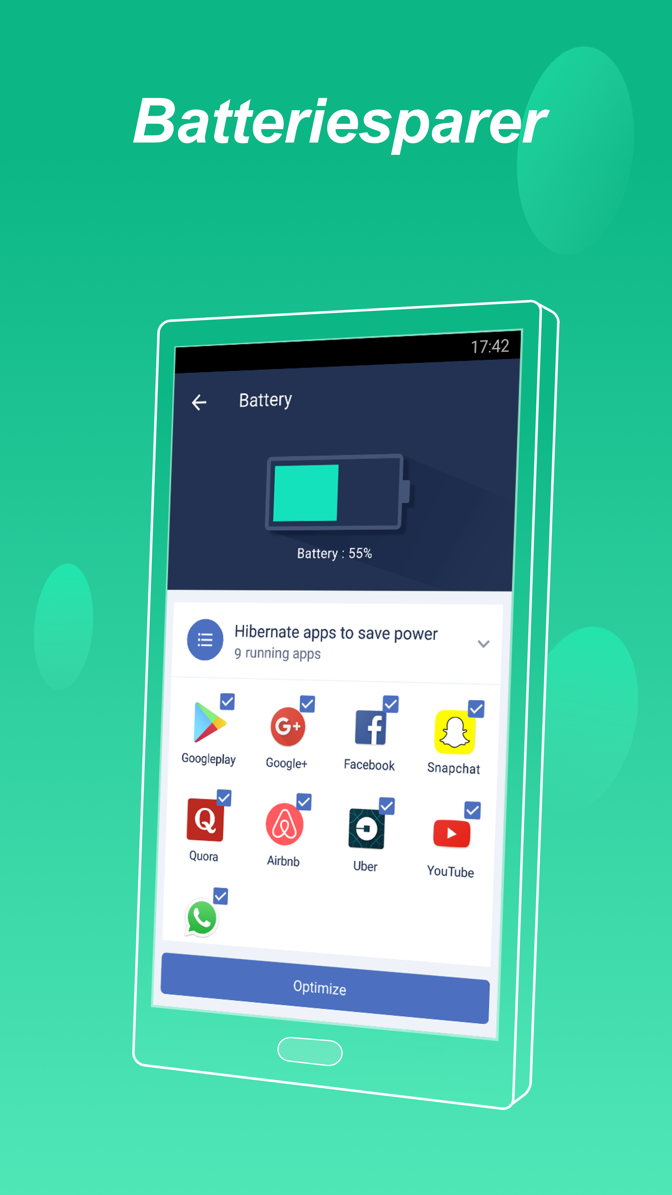 Akkulaufzeit sparen Aufgrund der laufenden Apps im Hintergrund kann der Akku des Telefons stark entladen werden. Mit dem Cleaner-Batterieschoner können Sie diese ungewöhnlich verwendeten Apps mit einem Klick stoppen, was sehr hilfreich sein kann, um Batterieprobleme wie z. Batterieentladung, langsame Aufladung, baldige Abschaltung und kurze Lebensdauer der Batterie.