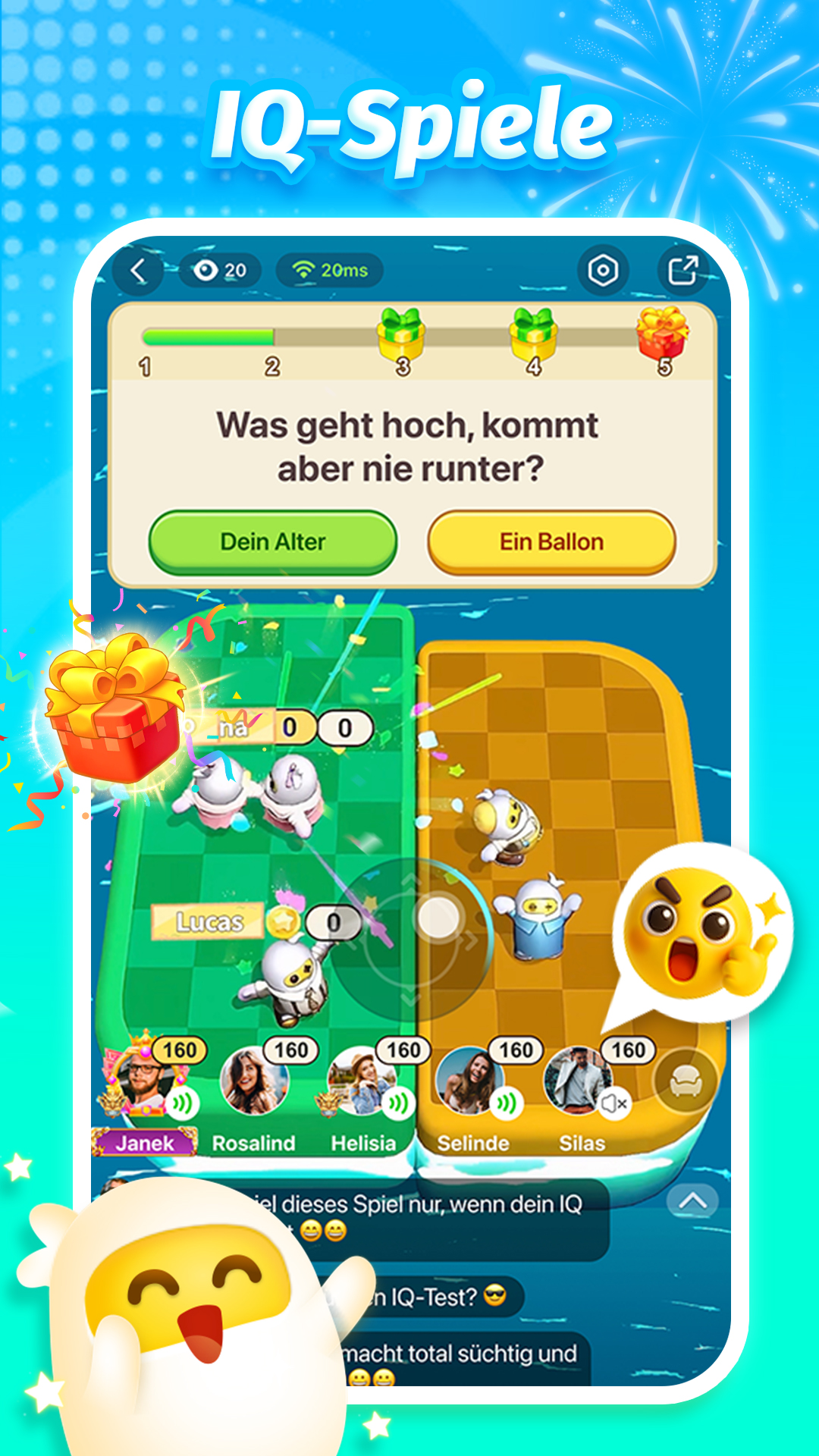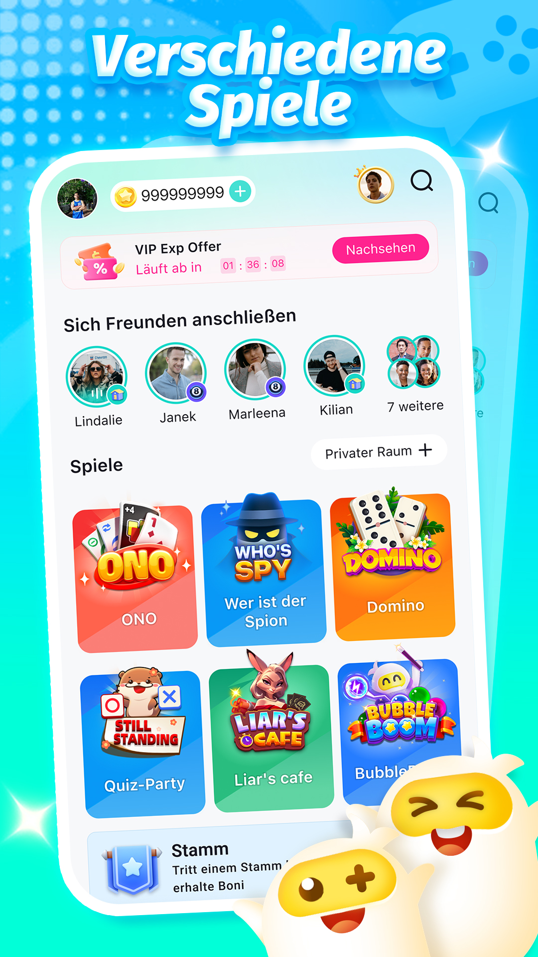 🎮 Endloser Spielspaß in einer App! 🎮 Willkommen bei TopTop – der ultimativen Social-Gaming-App, wo Spaß auf Freundschaft trifft! Vollgepackt mit süchtig machenden Mehrspieler-Spielen und aufregenden Möglichkeiten zu connecten, ist TopTop dein Anlaufpunkt für unendliche Unterhaltung und Echtzeit-Interaktion. Spiele beliebte Games wie: Wer ist der Spion? 🕵️♂️, Toppy Park 🔑, Lügen-Bar🃏, Ludo 🎲, ONO🔄, IQ-Spiele 🧠 und mehr! Ob du nur Zeit vertreibst oder mit alten und neuen Freunden in Kontakt kommen möchtest – TopTop verbindet Menschen durch Spiele, und wir fügen ständig weitere hinzu! 🔑 Toppy Park Bilde Teams für Chaos und Kooperation in diesem Multiplayer-Puzzle-Spiel für 2–8 Spieler! Bei Toppy Park ist Teamwork der einzige Weg zum Sieg. Arbeitet zusammen, um knifflige Rätsel zu lösen und alle Schlüssel zu sammeln. Spiele jederzeit, überall – online oder lokal – und mach dich bereit für Lacher, Überraschungen und unvergessliche Team-Momente 🕵️♂️ Wer ist der Spion? Ein Spiel mit Witz, Bluff und urkomischer Täuschung! Sammle deine Freunde online oder offline, nimm Rollen als Unschuldige, der schlaue Spion oder der ahnungslose Mr. White an. Beschreibe dein geheimes Wort, ohne es zu verraten. Kannst du den Spion entlarven, bevor es zu spät ist? Genieße Tausende KOSTENLOSE Wortpakete und lustige Themen! Unterstützt 4–8 Spieler, perfekt für Online-Team-Battles und Offline-Partys 🧠 IQ-Spiele Wer ist der wahre König des Wissens? Tauche ein in spannende Quiz-Duelle in IQ-SPIELE! Fordere dich selbst mit jeder Menge unterhaltsamer und kniffliger Fragen, während du live gegen echte Gegner antrittst. Chatte mit deinem Gegner während des Spiels und teste nicht nur dein Wissen, sondern auch deine Schnelligkeit und Strategie. Mach mit und stelle dich der ultimativen Herausforderung für Verstand und Reflexe – wie weit schaffst du es? 🙌 Neue Freunde finden Mit TopTop kannst du beim Spielen leicht neue Leute kennenlernen. Tauche ein in Echtzeit-PK-Spiele, fordere Echtzeit-Gegner heraus und connecte dich mit Spielern, die deine Interessen teilen. Chatte, füge Freunde hinzu und lade sie jederzeit zu einer weiteren Runde ein! 🥳 Zusammen in Gruppen abhängen TopTop ist nicht nur zum Spielen da – es ist auch eine soziale Plattform! Tritt Sprachräumen bei und chatte mit Leuten aus der ganzen Welt. Egal, ob du auf Musik, Games, Sport stehst oder einfach nur gute Vibes suchst – hier ist ein Platz für dich. Du musst dein Gesicht nicht zeigen – sei einfach du selbst, rede frei und baue in einer lockeren, spaßigen Umgebung echte Verbindungen auf ✉ Kontaktiere uns Facebook : @toptop.germany TikTok : @toptop_de 🎉 Mach mit beim Spaß! Lade die App jetzt runter und spiele mit Millionen Spielern weltweit. Der Spaß hört nie auf!"