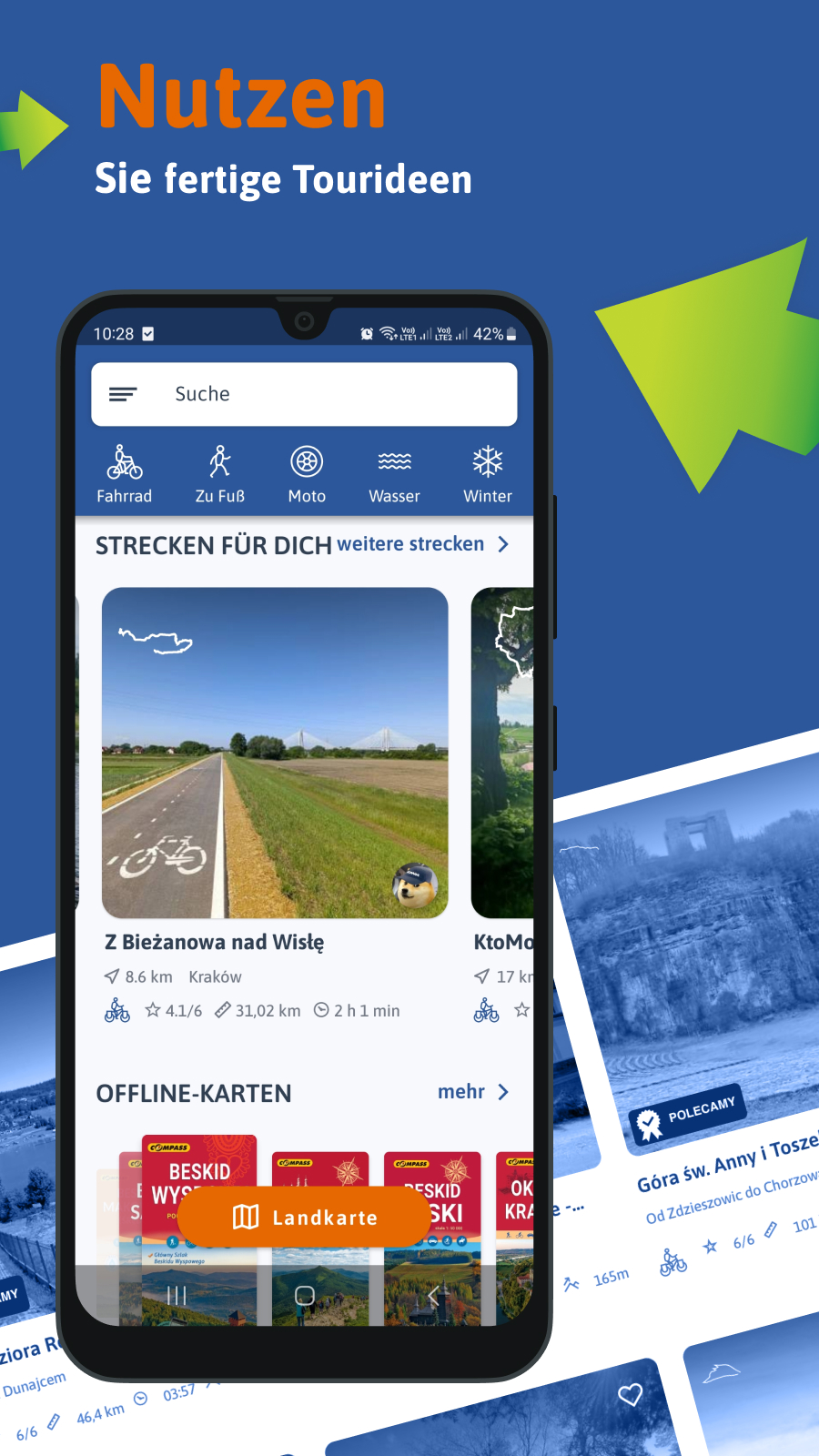 Die kostenlose App Traseo ist ein fortschrittlicher Routenplaner und eine Datenbank mit mehr als 200.000 fertigen touristischen Routen. Die Anwendung ermöglicht: - Karten und Routen offline nutzen - Planen von eigenen Routen und Anheften an Meine Karte - Navigieren entlang geplanter und heruntergeladener Routen oder zu einem beliebigen Punkt auf der Route - Routen aufzeichnen - Integration mit Garmin - Anzeige von Höhendiagrammen - Hinzufügen von POI mit Beschreibung und Foto - Speichern der Route in einer .gpx-Datei und Öffnen dieser Dateien - Kauf von professionellen Karten von polnischen und ausländischen Verlagen (z.B. touristische Karten Compass und Galileos) - Beobachtung von Statistiken - Platzierung von Routen auf Traseo.pl und deren Bereitstellung für Nutzer oder auf Ihrer eigenen Website, - in der Version Traseo PRO gibt es auch eine eigene Kartenunterlage mit touristischen Routen, eine 3D-Ansicht der Karte, Verkehrsdichte und Straßenbeläge auf der Strecke, Koordinaten und Höhe eines beliebigen Punktes auf der Karte, Dunkelmodus, Winterkartenunterlage und keine Werbung! Laden Sie und öffnen Sie gpx-Dateien Traseo umfasst auch die offiziellen thematischen Routen in Polen: Bernsteinstraße, Beskiden-Hauptwanderweg, Route der Adlerhorst-Burgen, Green Velo, Eisenbahn Fahrradroute (Żelazny Szlak Rowerowy). Laden Sie gpx-Routen der Strecken herunter oder heften Sie sie an Meine Karte und lassen Sie sich von der App führen! Sie können sie mit dem Garmin-Gerät integrieren. Nutzen Sie fertige Routenvorschläge - eine Datenbank mit über 200.000 Routen Wollen Sie eine Radtour in Pommern oder eine Wanderung in den Beskiden oder Sudeten unternehmen? Sind Sie im Gorce-Gebirge oder in Bory Tucholskie (Tucheler Heide) und möchten dort joggen oder Nordic Walking betreiben? Oder vielleicht besichtigen Sie Kraków, Warszawa, Wrocław oder Gdańsk - lassen Sie sich für Ihre Reise inspirieren! Die Routen werden nach der Entfernung vom Benutzer oder nach vorgegebenen Kriterien gesucht: Ort (z.B. Góry Stołowe (Heuscheuergebirge), Pieniny (Pieninen)), Länge oder Kategorie (Wander-, Rad- oder Kanurouten). Die Anwendung enthält auch eine Datenbank mit touristischen Attraktionen. Auf die Radwege und touristische Routen laden Wieliczka, Puszcza Niepołomicka (Niepołomicka-Heide), Sopot, Olsztyn und Szczecin, aber auch Zamość und die Region Lublin ein. Verwenden Sie Karten von Europa offline In der Traseo-App gibt es neben einer eigenen Kartenunterlage mit touristischen Routen, auch in der Winterversion, Kartenunterlagen von MapBox und zusätzlich kann man Karten von renommierten Verlagen aus Polen und Europa erwerben. Ausgewählte Karten können Sie offline nutzen. Genaue Karten auf Ihrem Telefon in Kombination mit gpx-Spuren und Standort ist ein großartiger Begleiter für jede Expedition. In der App kann man Karten von den folgenden Verlagen finden: Szarvas, Anavasi. Karten von Italien (Dolomiten), Karten von Ungarn, der Slowakei und Griechenland. Navigieren Sie auf der Strecke und überprüfen Sie den genauen Streckenverlauf einschließlich der Attraktionen In Traseo finden Sie eine Idee für einen Spaziergang oder ein Workout, das auf Ihre Erwartungen zugeschnitten ist. Sie können Ihre eigene Route planen und sie dann navigieren. Sie können auch auf den Routen anderer Personen oder zu einer ausgewählten touristischen Attraktion navigieren. In der Version PRO können Sie die Verkehrsdichte und den Straßenbelag auf Ihrer Route überprüfen. In der Traseo-App finden Sie nicht nur polnische Regionen: von Podhale, über Schlesien, Góry Świętokrzyskie (Heiligkreuzgebirge) Poznań, Lublin, Toruń bis nach Masuren und die Dreistadt. Es gibt auch Karten von: Niedere Tatra, Kleine Fatra, Slowakisches Paradies, Skalne Miasto (Felsenstadt). Finden Sie interessante Routen und Orte Den gesamten touristischen Reichtum Polens finden Sie an einem Ort. Sie können Ihre Route aufzeichnen und speichern.