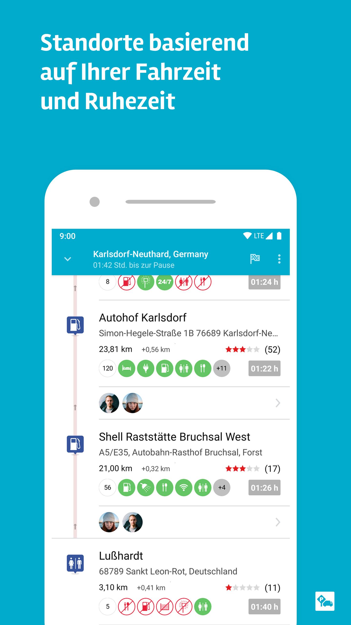 Wir haben Sie abgedeckt. Geben Sie einfach die Anzahl der Minuten ein, die Sie fahren dürfen, sowie Ihr Ziel. Wir kombinieren Ihren Standort mit der täglichen Lenkzeit und stellen Ihnen Parkmöglichkeiten, Rastplätze und Autohöfe zur Verfügung.