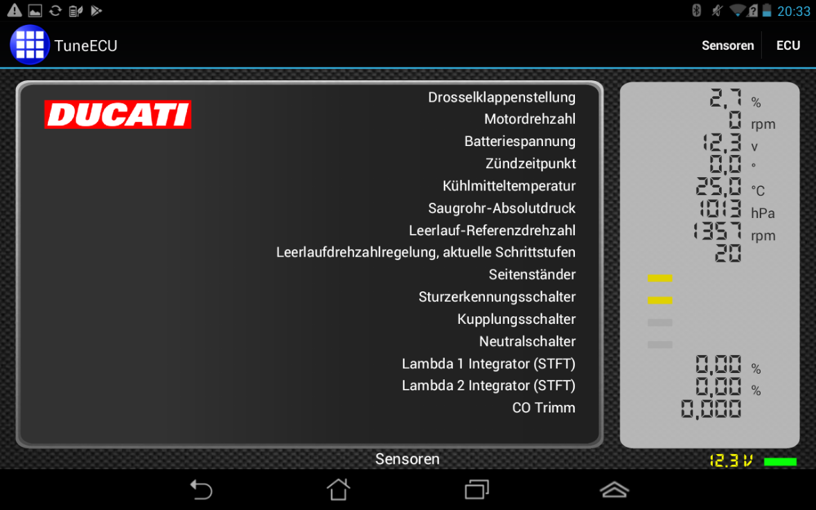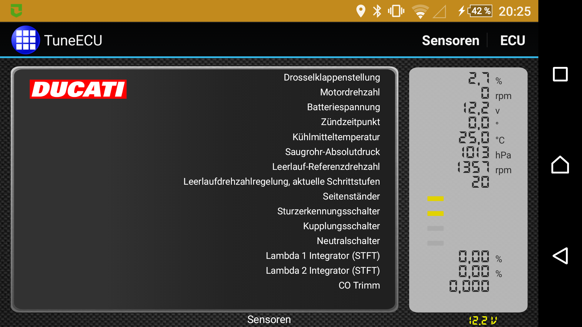 TuneECU ist eine Anwendung (Software), welche die Diagnose, das Testen und die Neuprogrammierung (1) der Motorsteuerung (ECU) für Triumph, KTM, Aprillia, Benelli, Ducati & Moto Guzzi Motorräder ermöglicht. Diese Anwendung erfordert ein USB/OBD2 Kabel mit FTDI Chipsatz oder einem Bluetooth-Adapter ELM327. *Warnung* aktuell gibt es viele BT-Adapter (Clones), Sie müssen die empfohlenen Adapter verwenden für TuneECU. (1) https://tuneecu.boards.net/thread/493/bikes-list-compatibility (2) https://tuneecu.boards.net/thread/494/bluetooth-adapter Es wird dringend empfohlen, die Website http://tuneecu.boards.net zu besuchen, bevor Sie diese Anwendung benutzen.