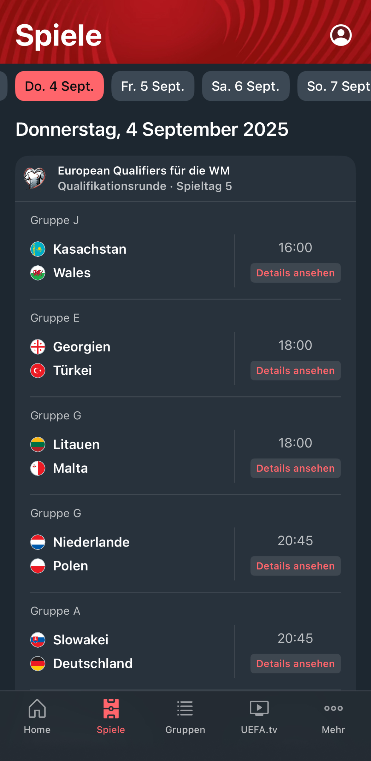 "Deine offizielle Heimat für den europäischen Nationalteam-Fußball! Verfolge das Beste des europäischen Nationalteam-Fußballs mit der offiziellen App, deinem unverzichtbaren Begleiter für die UEFA Nations League, die European Qualifiers für die FIFA-WM 2026, die UEFA Women's Nations League und die Women's European Qualifiers für die FIFA-WM der Frauen 2027 - sowie den Weg zur UEFA EURO 2028! Bleibe das ganze Jahr über auf dem Laufenden über die Spiele der Männer- und Frauen-Nationalteams. Mit der offiziellen App verpasst du keinen Moment des packenden europäischen Nationalteam-Fußballs! Entdecke die UEFA Nations League und European Qualifiers: Umfassende Berichterstattung - Erhalte Live-Updates von jedem Länderspiel in Europa. Schau dir die Spielpläne und Ergebnisse aller Partien der UEFA Nations League und der European Qualifiers auf dem Weg zur EURO 2028 an. Und verpasse kein einziges Ergebnis der Mannschaften, die zur FIFA-WM 2026 wollen! Verfolge den Weg aller Teams - Informiere dich über den Stand in den Gruppen und schau dir an, wie deine bevorzugten Männer-Nationalmannschaften in der Nations League und den European Qualifiers für die FIFA-WM 2026 abschneiden. Verpasse keinen Moment - Verpasse kein einziges Tor oder Schlüsselereignis dank Push-Benachrichtigungen in Echtzeit für Aufstellungen, Anstöße, Tore und Auslosungen. Packende Videos anschauen - Schau dir die Tore im Detail mit den Highlights am nächsten Tag an und genieße exklusive Video-Wiederholungen auf UEFA.tv. Außerdem kannst du auf UEFA.tv exklusive Fußballvideos in längerer Form anschauen, darunter ausführliche Highlights, vollständige Spiel-Wiederholungen und mehr! Eintauchen in Analysen - Detaillierte Statistiken, Formkurven, individuelle Teamseiten, Kader und Spielerprofile der Nationalmannschaften, die an der Nations League und den European Qualifiers für die FIFA-WM 2026 teilnehmen. Bleibe informiert - Checke die neuesten Live-Ergebnisse und Tabellen der Gruppen - und greife zu auf alle Spiele und Ergebnisse der europäischen Nationalteam-Wettbewerbe. Exklusive Inhalte freischalten - Schau dir Interviews mit Spielern an, genieße einzigartige Fotos vom Spielfeldrand und den Zuschauern - und greife zu auf UEFA.tv, um exklusive Fußballdokumentationen zu sehen und Blicke hinter den Kulissen zu werfen. Personalisiere dein Erlebnis - Passe deinen Feed und deine Benachrichtigungen an, indem du deine Lieblingsnationalteams aus den Wettbewerben der Männer und Frauen auswählst. Verfolge den Nationalteam-Fußball der Frauen: - Checke Live-Ergebnisse und -Statistiken auf dem Weg zum Höhepunkt der UEFA Women's Nations League. - Schau dir Highlights von allen wichtigen Spielen in der Women's Nations League an. - Verfolge live die Ergebnisse der Teams, die sich für die FIFA-WM der Frauen 2027 in Brasilien qualifizieren wollen. - Erlebe die besten Momente noch einmal und entdecke Inhalte von vergangenen Turnieren wie der UEFA Women's EURO 2025 in der Schweiz und der UEFA Women's EURO 2022 in England. Bleibe auf dem Laufenden über die Women's European Qualifiers für die FIFA-WM der Frauen 2027 und weitere Fußball-Action in Europa. Die App ist verfügbar auf Englisch, Französisch, Spanisch, Deutsch, Italienisch, Portugiesisch und Russisch. Lade dir noch heute die offizielle UEFA EURO & Nations League App herunter und genieße das Beste des europäischen Nationalteam-Fußballs der Männer und Frauen!"