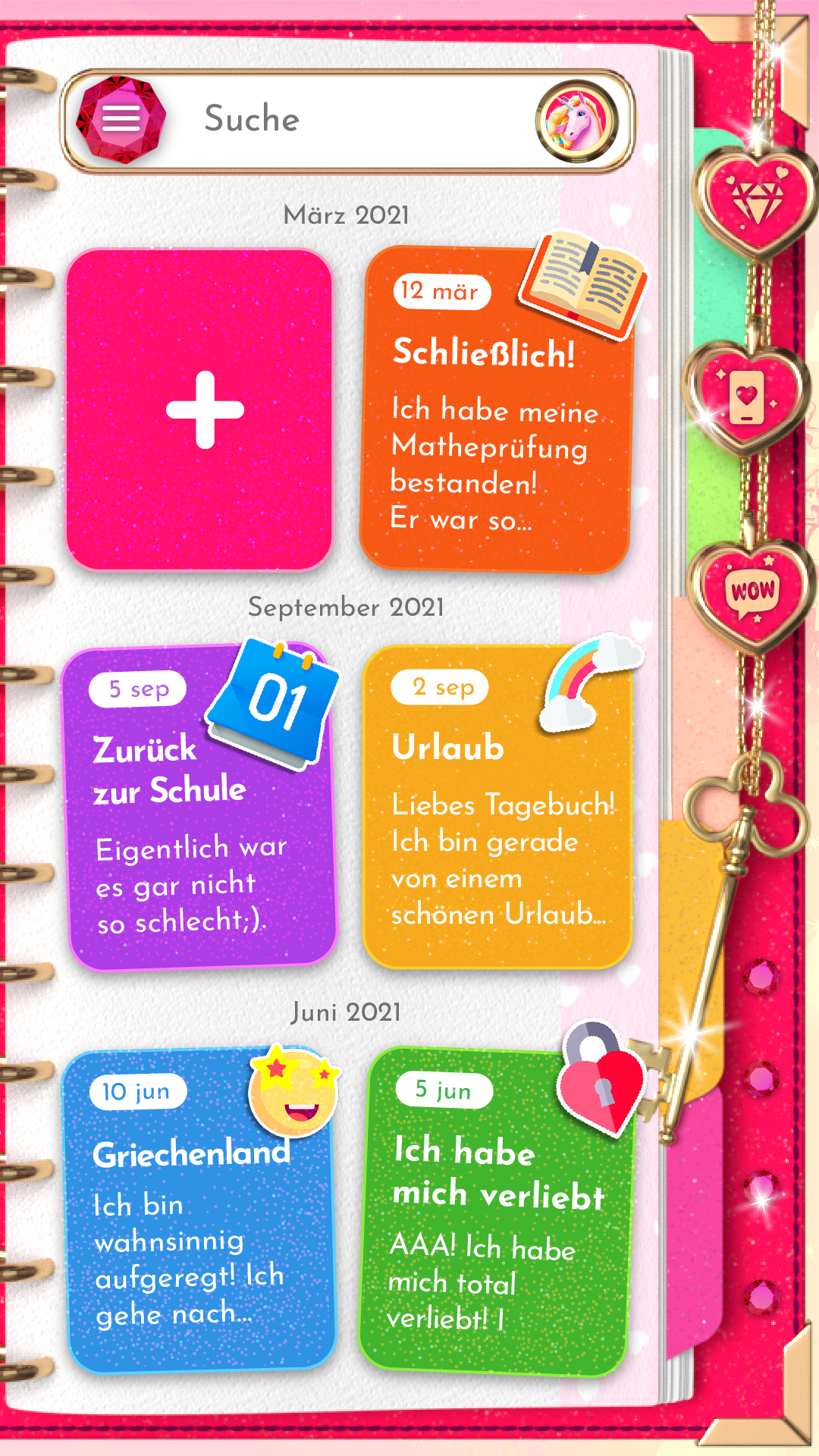 Willkommen im Einhorn-Tagebuch, einer kostenlosen, wunderschön gestalteten App für Ihr Mobiltelefon zum Speichern von Erinnerungen und Geheimnissen! Es ist ein besonderes Tagestagebuch für Mädchen und Jungen! Eine sichere und kostenlose App, mit der Sie alle Ihre Geheimnisse geheim halten können! Dieses Einhorn-Tagebuch mit Schloss kann mit einem Passwort oder einer PIN gesperrt werden, um volle Sicherheit zu gewährleisten, sodass alle Ihre Notizen sicher sind! Ganz gleich, ob Sie Ihr Geheimnis oder Ihren Traum mit Sicherheit geheim halten, vielleicht eine geheime Liebesgeschichte aufschreiben oder einfach nur Ihre Gefühle im Laufe der Zeit aufzeichnen möchten, Sie haben jetzt einen Freund, der Ihnen zuhört. Sie können es auch als Diättagebuch, Traumtagebuch, Reisetagebuch verwenden oder dort sogar ein Buch schreiben. Diese tägliche Tagebuch-App für Mädchen ist sehr anpassbar! Sie können Ihr süßes Lieblingseinhorn für den Startbildschirm auswählen und mit Ihren Notizen spielen – den Hintergrund ändern, coole Schriftarten auswählen, Fotos und Aufnahmen anheften und coole Symbole aus einer großen Auswahl an kostenlosen Aufklebern und Emoticons auswählen. Ihr magisches Tagebuch wird wie alles aussehen, wovon Sie träumen können, Sie werden es vom ersten Tag an lieben! Merkmale: - Zwei schöne Ansichten aller Ihrer Notizen in der App: Kacheln und Liste - Tagebuch mit Schloss bedeutet volle Sicherheit – legen Sie Ihr Passwort fest (mit PIN-Code, Fingerabdruck oder Gesichtserkennung) und halten Sie Ihre Geheimnisse geheim! - Erinnerung: Fügen Sie eine Frage und eine Antwort hinzu. Wenn Sie Ihr Passwort vergessen, haben Sie weiterhin Zugriff auf Ihre Notizen - Fügen Sie Fotos aus der Galerie Ihres Telefons hinzu oder machen Sie ein Foto direkt aus der App! - Viele süße kostenlose Aufkleber – finden Sie den, der zu Ihrem Tag passt, und pinnen Sie ihn an Ihren Eintrag! Viele schöne Aufkleber für Mädchen! - Viele coole kostenlose Emotionen – beschreibe deine Stimmung im täglichen Tagebuch mit Emojis - Hintergrundbilder – laden Sie schöne kostenlose ästhetische Hintergrundbilder herunter und passen Sie Ihr Mobiltelefon individuell an! - Klänge und Musik – fügen Sie Ihren Notizen mehr Gefühle hinzu - Coole Hintergründe – wählen Sie für jede gespeicherte Erinnerung den perfekten Look - Comics – lesen Sie über Einhorn-Abenteuer und treffen Sie süße Einhorn-Freunde – Kittycorn und Kiwi! - Teilen Sie Ihre Erinnerungen mit Freunden (per Messenger, WhatsApp, Facebook oder Instagram – ganz wie Sie möchten!) - Spielen Sie ein Puzzlespiel – setzen Sie kleine Teile zusammen, um ein Foto zu arrangieren! - Spielen Sie ein Memo-Spiel – trainieren Sie Ihr Gedächtnis, finden Sie zwei identische Karten und drehen Sie sie um! Probieren Sie es mit Freunden aus! - Spielen Sie das Spiel 2048 – streichen Sie über Blöcke, um neue Preise freizuschalten! - Suchen Sie nach dem Eintrag anhand von Schlüsselwörtern oder Daten im Kalender! - Wählen Sie eine Sprache: Englisch, Spanisch, Russisch. Die App ist auch auf Portugiesisch, Indonesisch und Französisch verfügbar. Sie können es auf Farsi, Arabisch und Koreanisch verwenden. Jetzt auch auf Japanisch, Deutsch und mehr! - Funktioniert sowohl online als auch offline - Es ist alles kostenlos! Laden Sie das Einhorn-Tagebuch herunter, tauchen Sie ein in die Traumwelt und beginnen Sie sofort mit dem Schreiben in Ihrem neuen süßen Notizblock! Erzählen Sie Ihren Freunden vom Einhorn-Tagebuch mit Schloss-App – sie werden es bestimmt lieben! Unicorn Diary is a free, secure app for saving memories and secrets. It offers customizable themes, games, and password protection. Suitable for kids and teens, it's available in multiple languages. Keep your notes private and enjoy a personalized diary experience.