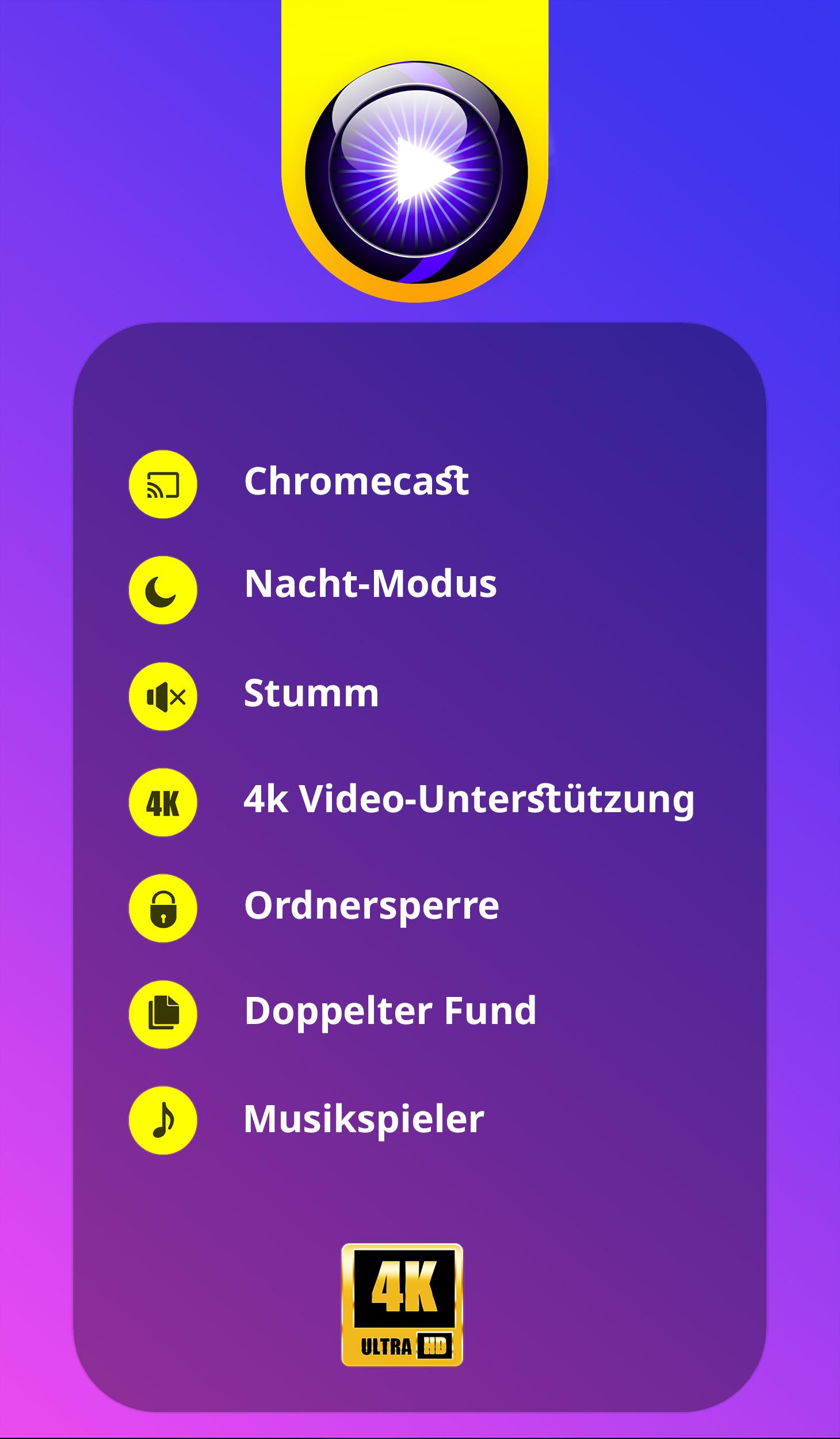 Atemberaubende, wunderschön gestaltete HD-Video-Player-App für Android mit leistungsstarken Funktionen. Sie kann alle Videoformate wiedergeben. Einschließlich 4K-Ultra-HD-Videodateien mit High Definition beste Benutzererfahrung.