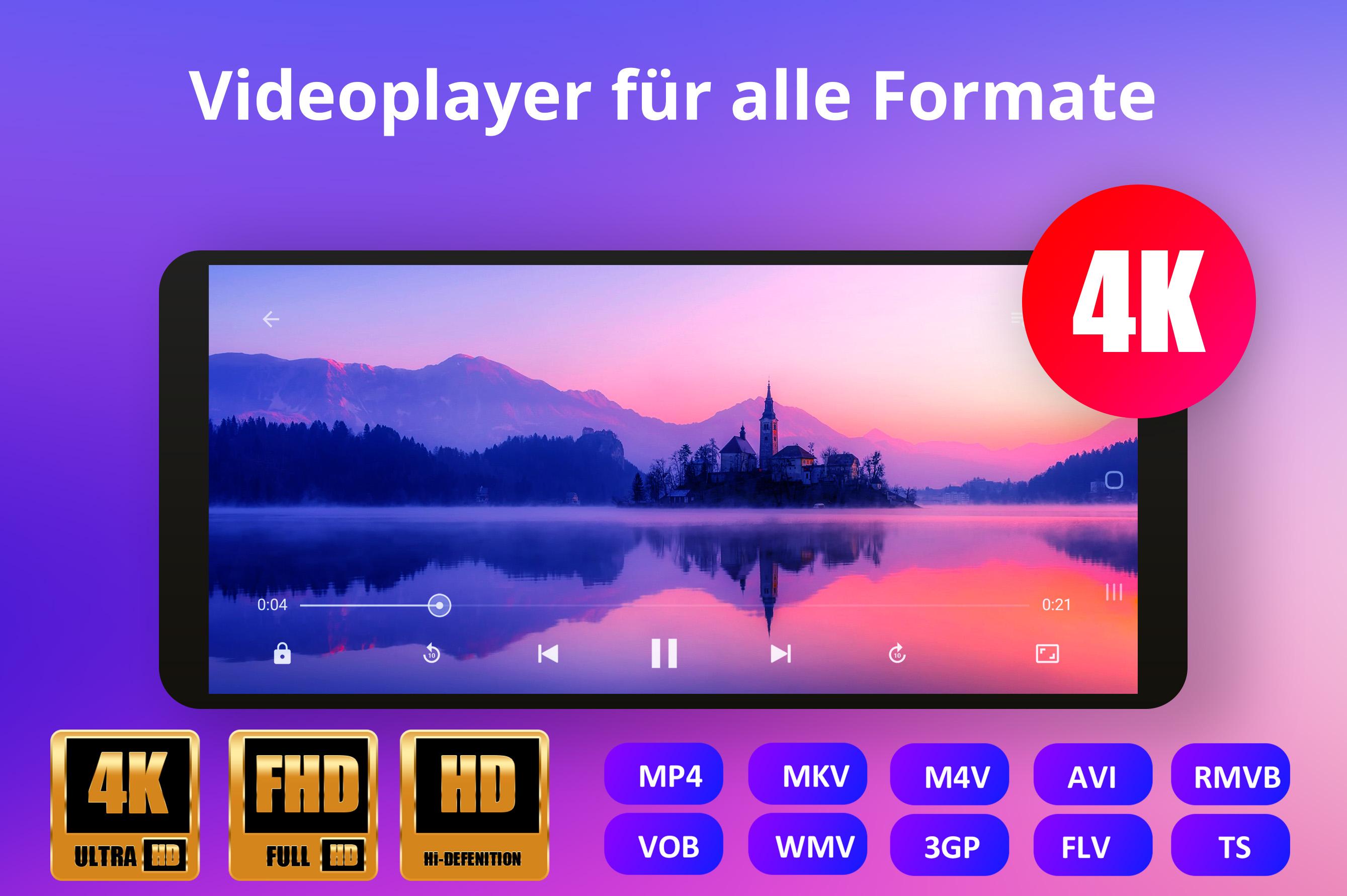 ● Der Videoplayer unterstützt alle Videoformate, einschließlich MP4, MOV, M4V, MKV, WMV, RMVB, FLV, AVI, 3GP, TS usw.