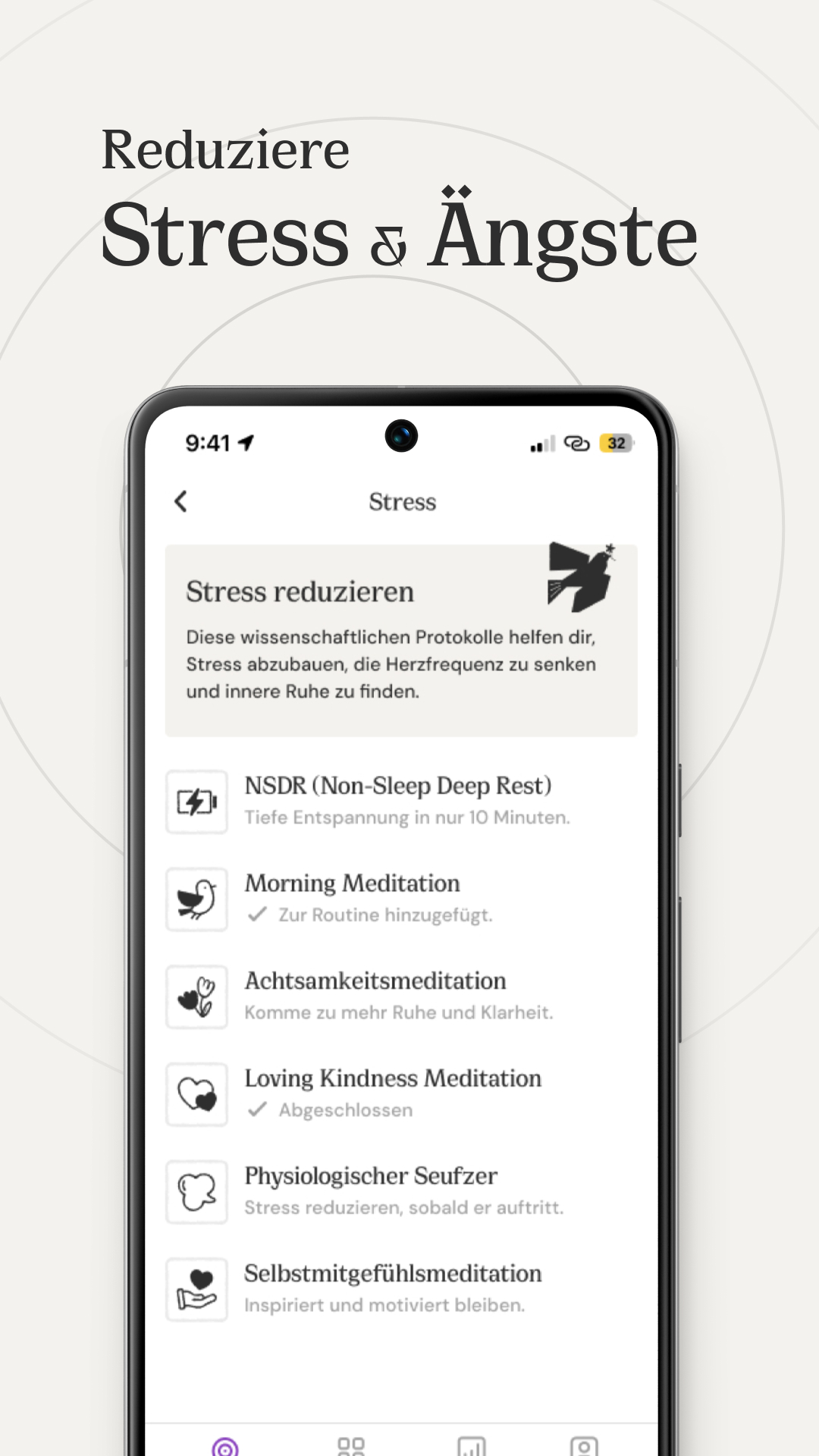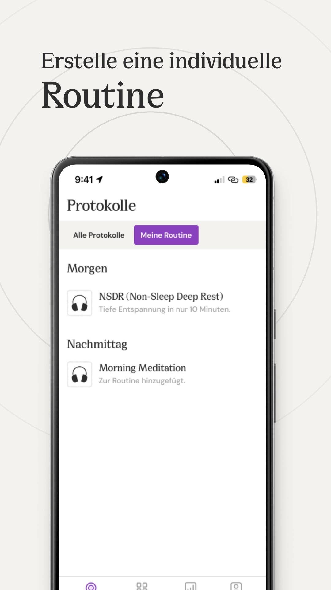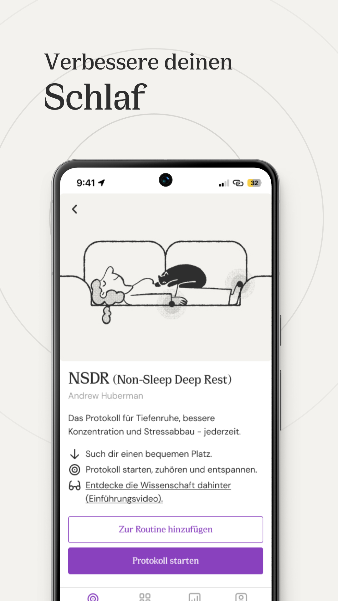 Wir stellen verschiedene digitale Hilfsmittel zur Verfügung, die helfen, schnell einzuschlafen, sich während der Nacht zu entspannen und jeden Morgen erholt und frisch in den Tag zu starten. Verwende Body Scan vor dem Schlafengehen, um gut zu schlafen, Sonnenlicht am Morgen nach dem Aufstehen, um den Tag zu beginnen, und NSDR, wenn du während deines hektischen Tagesablaufs ein kurzes Nickerchen brauchst.