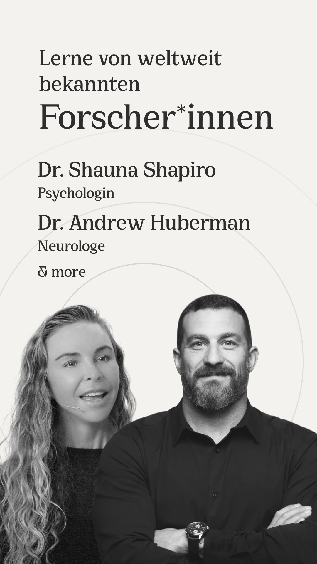 Zusätzlich zu unseren Protokollen haben wir mehr als 200 Inhalte, die du kostenlos ansehen und erlernen kannst, um dein Wohlbefinden zu verbessern. Wir behandeln zahlreiche Themen, von Neuroplastizität und Langlebigkeit bis hin zu körperlicher Leistung und Ernährung, kuratiert von Spitzenwissenschaftlern wie Andrew Huberman, David Sinclair, Shauna Shapiro und Michael Reid. Sie reichen von kurzen, 2-minütigen Episoden, die dir helfen, mehr über Ernährung oder Neurowissenschaften in verdaulichen Häppchen zu erfahren, bis hin zu stundenlangen Podcast-Episoden, in denen du in verschiedenste gesundheitsbezogene Themen eintauchen kannst.