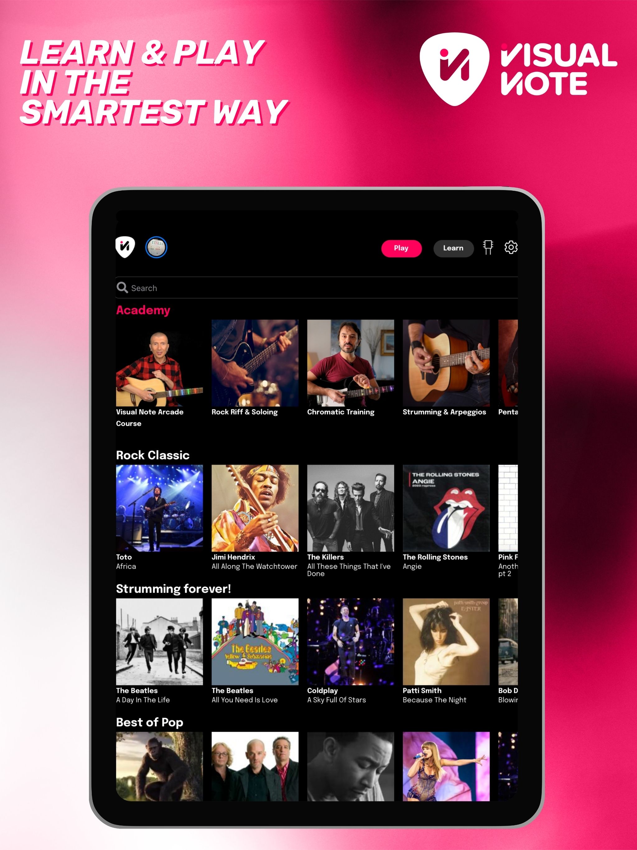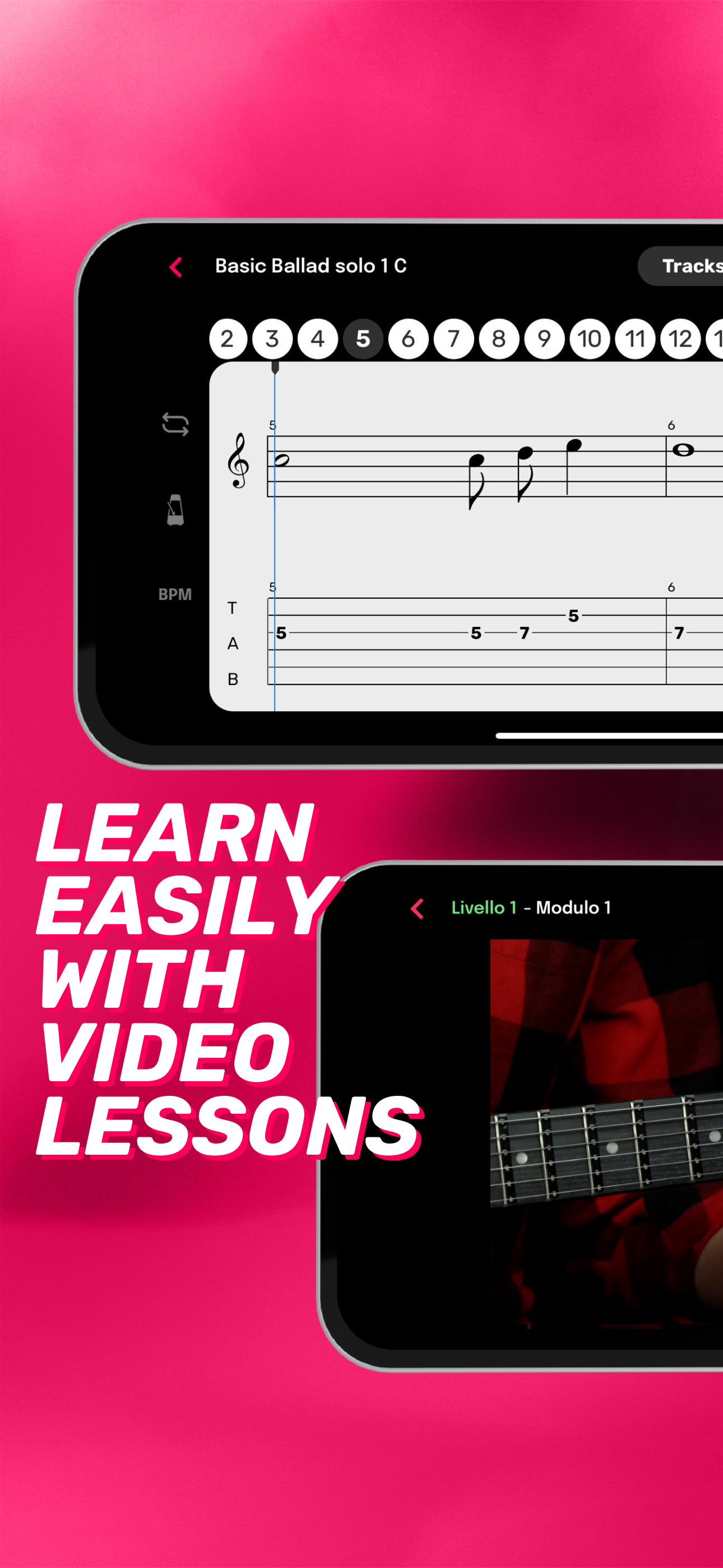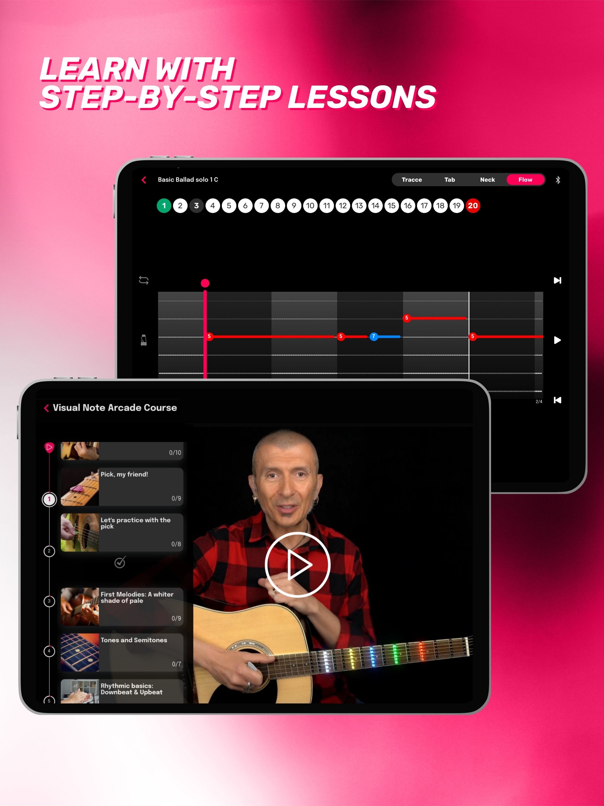 Mit Visual Note ist das Erlernen des Gitarrenspiels wirklich einfach und macht Spaß! Entdecken Sie ein komplettes Lernsystem, das an Ihren musikalischen Weg angepasst werden kann. Hunderte von Liedern zum Lernen Entdecken Sie eine riesige Bibliothek von Stücken zum Spielen und Lernen. Jede Menge Lektionen zum Lernen Lernpfade, die an Ihre Bedürfnisse angepasst sind. 6 Anzeigemodi Passen Sie Ihr Lernerlebnis mit der jeweils perfekten Oberfläche an. Handbuch für Akkorde und Tonleitern Lernen Sie Akkorde und Tonleitern, um Ihr Spiel zu verbessern. Unendlich viele Tracks zum Hochladen Laden Sie so viele .gp-Dateien hoch, wie Sie möchten, und genießen Sie sie mit der Leistung des Visual Note Players. Stimmen Sie Ihre Gitarre auf einfache und präzise Weise. LERNEN SIE WIE NIE ZUVOR Lernen Sie, wie, wann und wo Sie wollen, mit Schritt-für-Schritt-Kursen, die so gestaltet sind, dass Sie in Ihrem eigenen Tempo lernen können. Greifen Sie auf exklusive Inhalte zu, die von professionellen Musiklehrern und Gitarristen erstellt wurden. Erleben Sie einen innovativen und intuitiven Lernweg mit Kursen für verschiedene Fähigkeitsstufen. Nutzen Sie die Vorteile von Videolektionen und interaktiven Übungen für besonders effektives Lernen. Üben Sie die Musikgenres, die Sie lieben, und wiederholen Sie Akkorde, Tonleitern und Techniken innerhalb der App. Tauchen Sie mit den innovativen Player-Funktionen tief in das Erlernen von Songs, Riffs und Soli ein. Verlangsamen und wiederholen Sie die schwierigsten Stellen, um jede Passage mit Leichtigkeit zu lernen. SPIELEN SIE JETZT IHRE LIEBLINGSSONGS Wählen Sie aus einer großen Auswahl an Titeln und beginnen Sie sofort mit dem Spielen Ihrer Lieblingssongs. Wählen Sie Songs Ihrer Lieblingskünstler und lernen Sie sie im Modus Ihrer Wahl. Begleiten Sie sie, indem Sie sich die Akkorde ansehen, während Sie das Originalvideo anschauen, oder studieren Sie jede Passage, jedes Riff und jedes Solo eingehend. GENIESSEN SIE IHRE EIGENEN INHALTE Laden Sie .gp-Dateien hoch und nutzen Sie die Möglichkeiten des Visual Note Players, um jede Tabulatur zu lernen. VERBESSERN SIE IHRE LERNFÄHIGKEITEN Besitzen Sie ein Visual Note LED-Gerät? Verbinden Sie es über Bluetooth mit der App und lassen Sie die LEDs Ihre Finger intuitiv führen, um Akkorde, Tonleitern, Melodien, Songs und mehr zu lernen! Lernen Sie blitzschnell und erreichen Sie Ziele, die Ihre Vorstellungskraft übersteigen! MACHEN SIE IHRE AUFTRITTE EINZIGARTIG Verwenden Sie die dynamischen Lichteffekte von Visual Note, um Ihren Live-Auftritten eine besondere Note zu verleihen. Erstellen Sie Ihre eigenen Effekte oder verwenden Sie solche, die im Takt der Musik laufen, um Ihr Publikum zu fesseln. Mit Visual Note macht das Gitarre spielen lernen besonders viel Spaß! Laden Sie die App kostenlos herunter und probieren Sie alle Funktionen aus. Aktivieren Sie Ihr Premium-Abonnement, um alle ständig aktualisierten Inhalte freizuschalten.