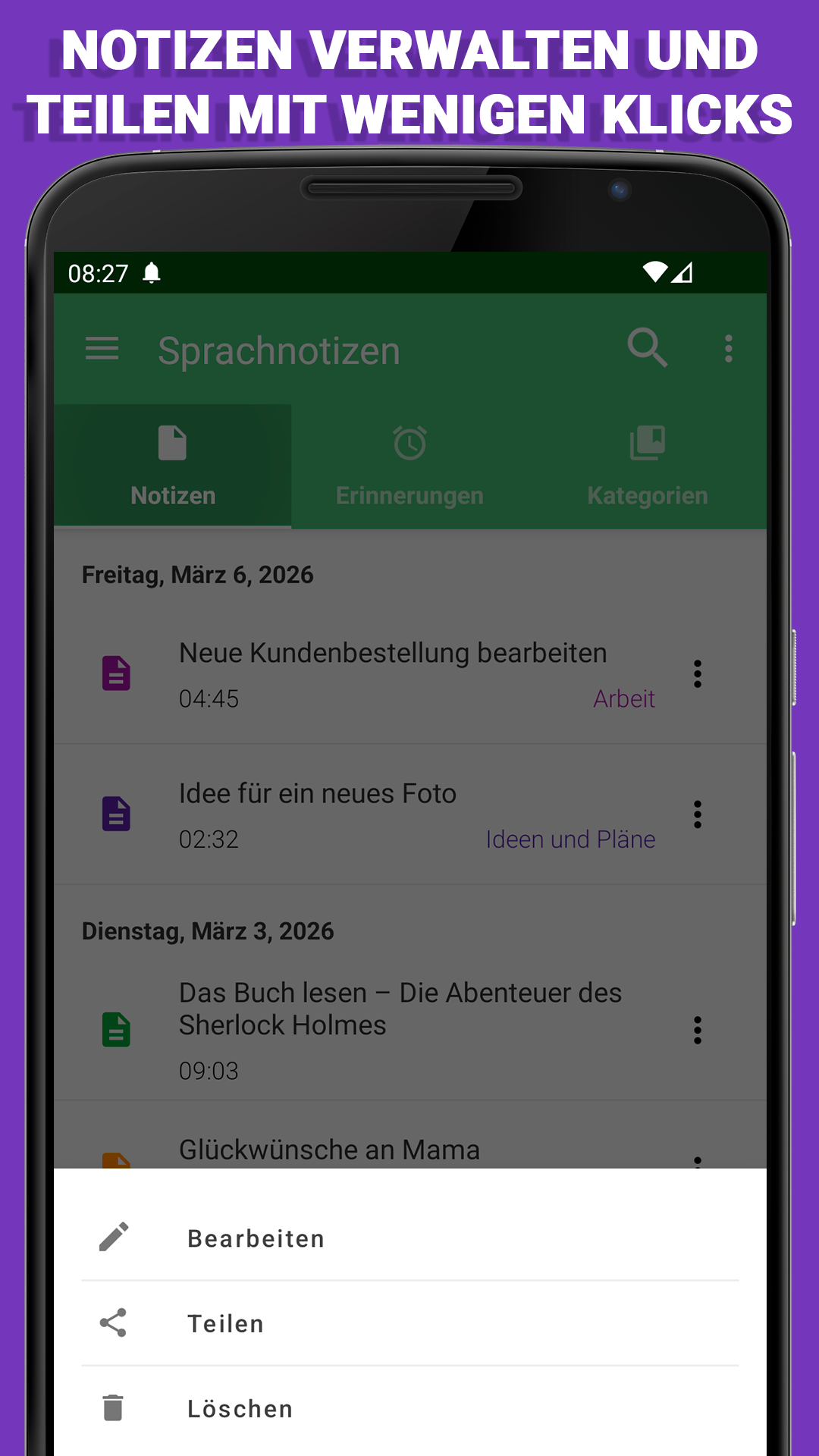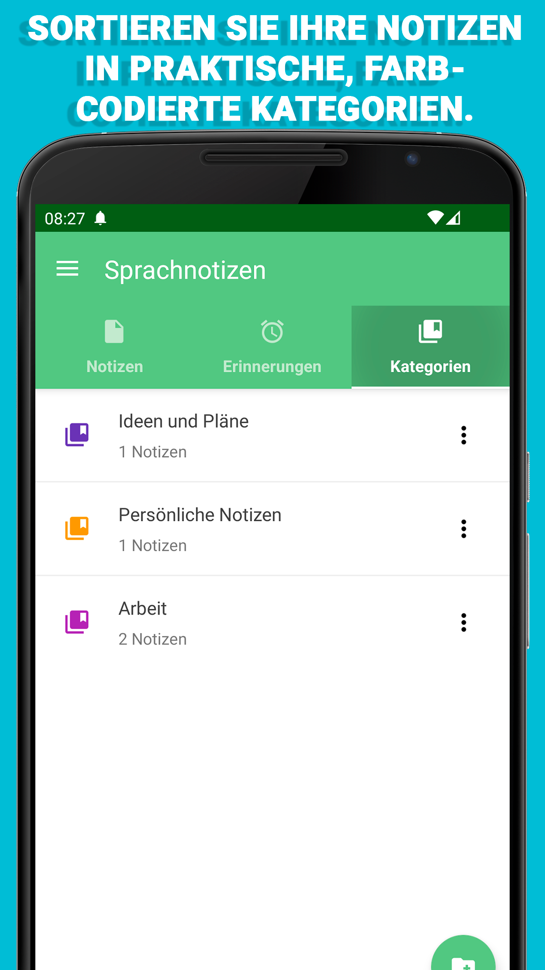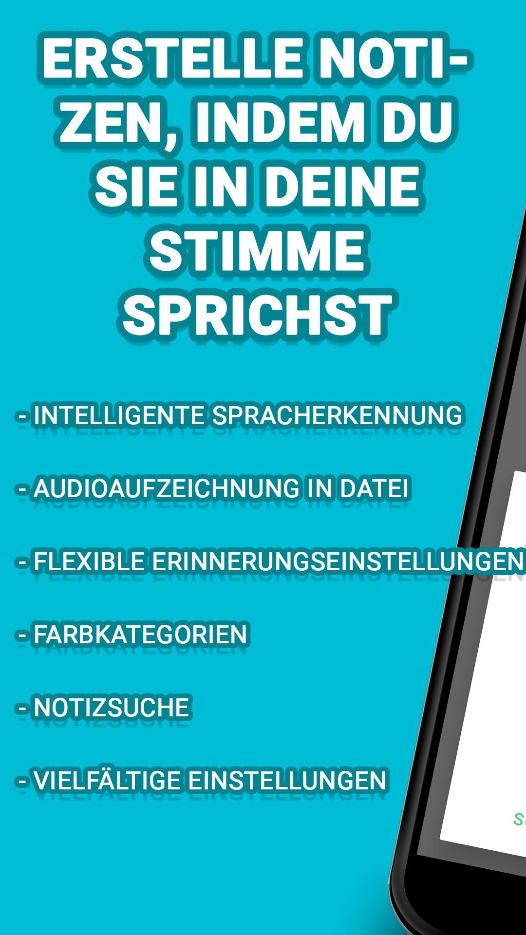 Eine App, mit der Sie schnell und einfach per Spracherkennung kurze Notizen oder wichtige Einfälle mit Erinnerungsfunktion aufnehmen können. Hatten Sie schon einmal eine spannende Idee, ausgerechnet im denkbar unpassendsten Moment? Jetzt gibt es eine Möglichkeit, solche Ideen aufzuzeichnen, damit Sie in Ihrem Kopf nicht verloren gehen. Notizen sind die beste Möglichkeit, unsere wichtigsten Ideen und Gedanken festzuhalten. Mit Voice Notes können Sie Notizen noch schneller aufzeichnen: Diktieren Sie Ihren Text einfach ins Mikrofon und die App erkennt, was Sie sagen. Notizen erstellen Dank der Spracherkennung sind Notizen schnell aufgenommen. Bei Bedarf kann der transkribierte Text dann per Zusatzfunktion oder mit einer virtuellen Tastatur bearbeitet werden. Oder Sie können Tonaufnahmen wichtiger Informationen aufnehmen und später persönlich anhören. Erinnerungen erstellen Richten Sie Erinnerungen für wichtige Notizen ein: Wählen Sie eine Zeit und legen Sie bei Bedarf einen speziellen Erinnerungston, einen Vibrationsalarm oder eine wiederholte Erinnerung fest. In den Einstellungen haben Sie die Auswahl aus einzigartigen Erinnerungstönen und können eine Zeit für eine wiederholte Erinnerung auswählen. Benutzerkategorien Sie können bequem eine beliebige Anzahl an Kategorien für Ihre Notizen anlegen. So finden Sie sie später per Filter leichter wieder. Wählen Sie aus unterschiedlichen Labels wie Familie, Arbeit oder Geburtstage. Oder Sie legen selbst welche an. Sobald Sie eine Notiz erstellt oder bearbeitet haben, können Sie aus den angelegten Kategorien wählen. Viele verschiedene Farbstile In den Einstellungen können Sie einen Farbstil nach Ihrem Geschmack wählen. Die App bietet eine große Auswahl. Es gibt sogar ein Profil in Schwarz/Weiß, für die, die ihr Interface kontrastreich mögen. Notizen teilen Sie können den Textinhalt einer Notiz oder gleich mehrere Notizen an sich selbst oder Freunde verschicken: Über Social Media, E-Mail etc. Export/Import Alle ihre Notizen können im maschinenlesbaren Format (JSON) oder als Plain Text (TXT) exportiert werden. Das erste Format können Sie nutzen, um Notizen von anderen Geräten zu importieren, beispielsweise beim Kauf eines neuen Telefons. Mit der App können Sie Notizen für Android-Telefone erstellen. Besonders wichtig ist die Funktion, mit der Sie Erinnerungen einstellen können. Damit können Sie sich selbst an Geburtstage erinnern. Ihr Freunde und Verwandten werden es Ihnen danken, wenn Sie rechtzeitig zum Geburtstag gratulieren oder Geschenke schicken. Setzen Sie einfach eine Erinnerung für morgen oder wann immer. Die Funktion ist perfekt, um sich selbst bequem daran zu erinnern, an wichtige Ereignisse zu denken oder Dinge für die Eltern zu erledigen. Unsere App ist auch eine ausgezeichnete Alternative zu eingestellten Erinnerungen auf dem Computer: Ihr Telefon haben Sie immer bei sich und verpassen so niemals eine Erinnerung. Mit unserer Online-Notizen-App können Sie Notizen erstellen, wo Sie auch hingehen. Dadurch, dass Ihr Telefon immer nur eine Armlänge entfernt und die App komplett kostenlos ist, sind die Möglichkeiten schier unendlich. Kostenpflichtige App-Abos sind lediglich eine freiwillige Unterstützung für die Entwickler. Besuchen Sie unsere Website, um die neuesten Support-Artikel zur App zu lesen, Fragen zu stellen oder Verbesserungsvorschläge für Folgeversionen zu hinterlassen.