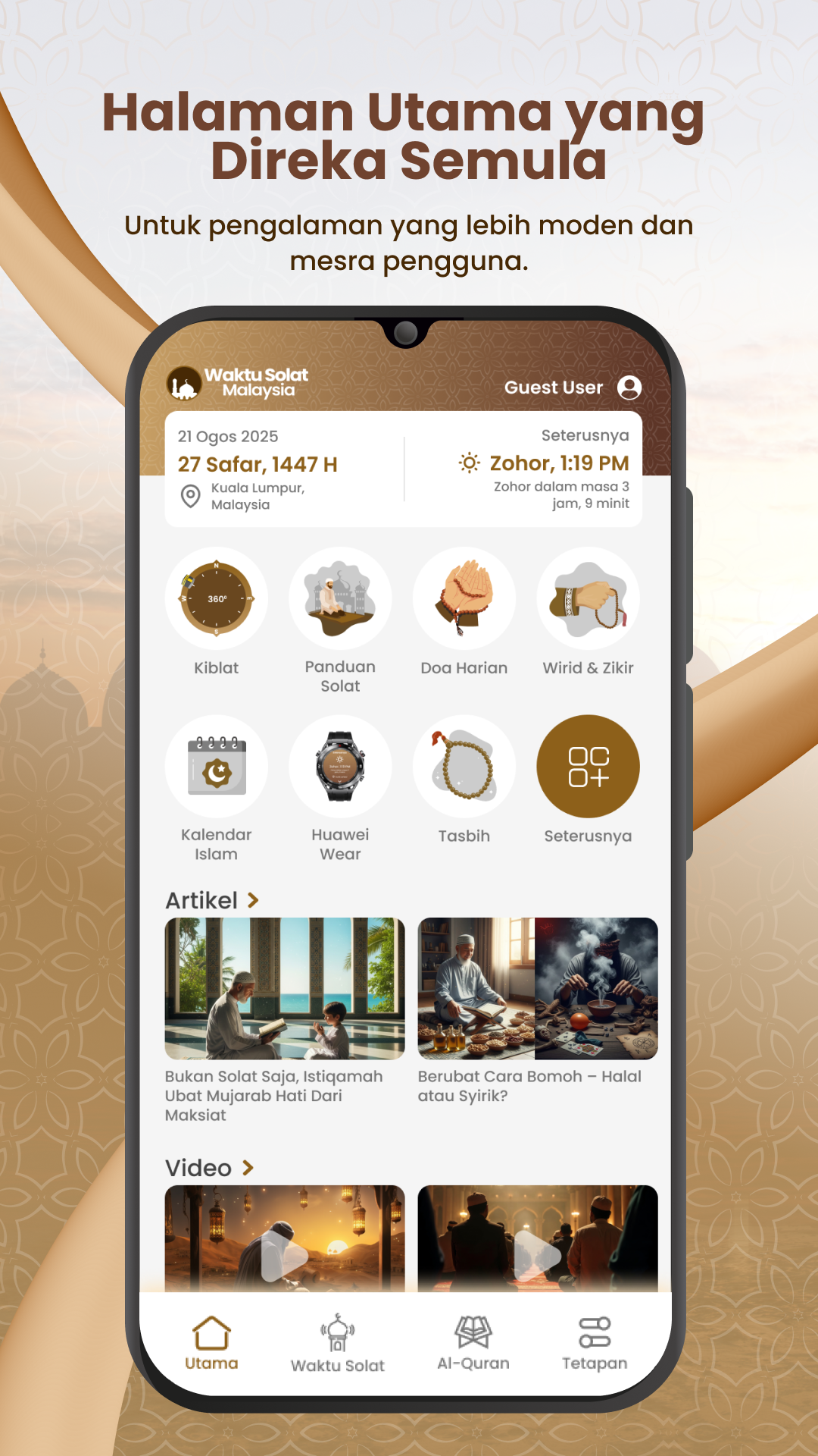 Gebetsführer – Ein digitaler Leitfaden, der die Grundlagen von Solat Fardu abdeckt. Es enthält auch Informationen zu verschiedenen Aspekten des Gottesdienstes und erleichtert so die Erfüllung religiöser Pflichten.