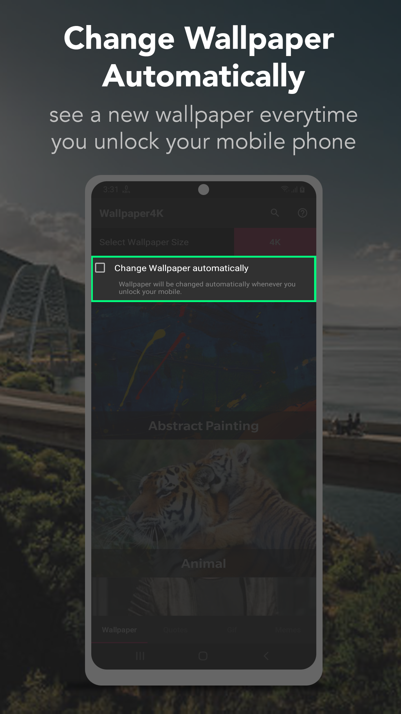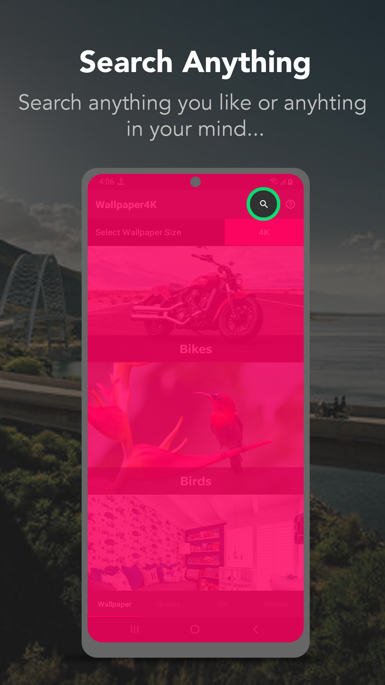 Die exklusive Sammlung hochwertiger 4K-HINTERGRUNDBILDER ist für Sie da. Verschönern Sie Ihr Handy mit unserer einzigartigen 4K-HINTERGRUNDBILDER-APP. Tausende hochwertige 2K-, 4K- und 8K-Hintergrundbilder, Zitate, GIFs und MEMEs in vielen verschiedenen Kategorien. Sie können die Qualität der Hintergrundbilder von HD auf 4K bis 8K ändern, je nachdem, was Sie am meisten bevorzugen. Wenn Ihnen unsere Hintergrundbilder aus den aufgelisteten Kategorien nicht gefallen, machen Sie sich keine Sorgen, denn wir haben eine spezielle Suchoption nur für Sie. Klicken Sie einfach auf die Suchschaltfläche und Sie erhalten Bilder von A bis Z in allen Kategorien. Wir haben auch eine spezielle Filter- und Zuschneidefunktion exklusiv für Sie hinzugefügt. Laden Sie Bilder herunter oder geben Sie sie für Ihre Freunde und Familie frei, damit Ihr Telefon besser, heller und auffälliger aussieht. Wir wissen, dass Sie mehr interessante Dinge zu tun haben, als nur eine endlose Liste von Hintergrundbildern durchzusehen. Vermeiden Sie den Ärger und klicken Sie auf die Option AUTO WALLPAPER CHANGE. Und sehen Sie jedes Mal ein neues Hintergrundbild, wenn Sie Ihr Mobiltelefon entsperren. Wir alle lieben es, ZITATE zu lesen. Manchmal macht es unseren Tag, es verändert unsere Stimmung, manchmal kann es uns auch motivieren. In dieser App bieten wir einen speziellen Bereich für Zitate, MEMEs und GIFs. Wir glauben, dass Sie dies mit Ihren Freunden und Ihrer Familie teilen können, um Ihre Gefühle auszudrücken. Also warte nicht ... Last but not the list- - Verleihen Sie Ihrem Heim- und Sperrbildschirm einen fantastischen Look. - Sei dabei, die Freude mit deinen Freunden zu teilen. - Wir teilen unsere Kontaktdaten in der App. - Wir würden uns freuen, Ihre Bewertungen und Vorschläge zu dieser App zu hören. - Jetzt herunterladen und Spaß haben ..