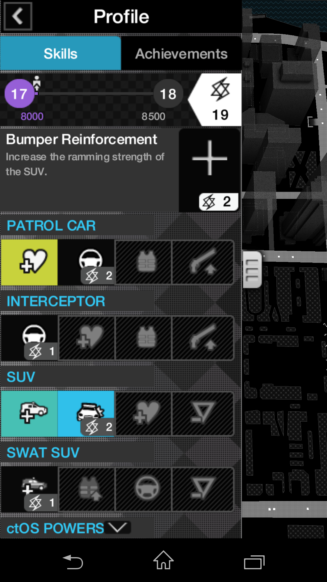 - Setze diese Skill-Punkte ein, um dein Polizei-Arsenal und deine ctOS-Fähigkeiten aufzurüsten.