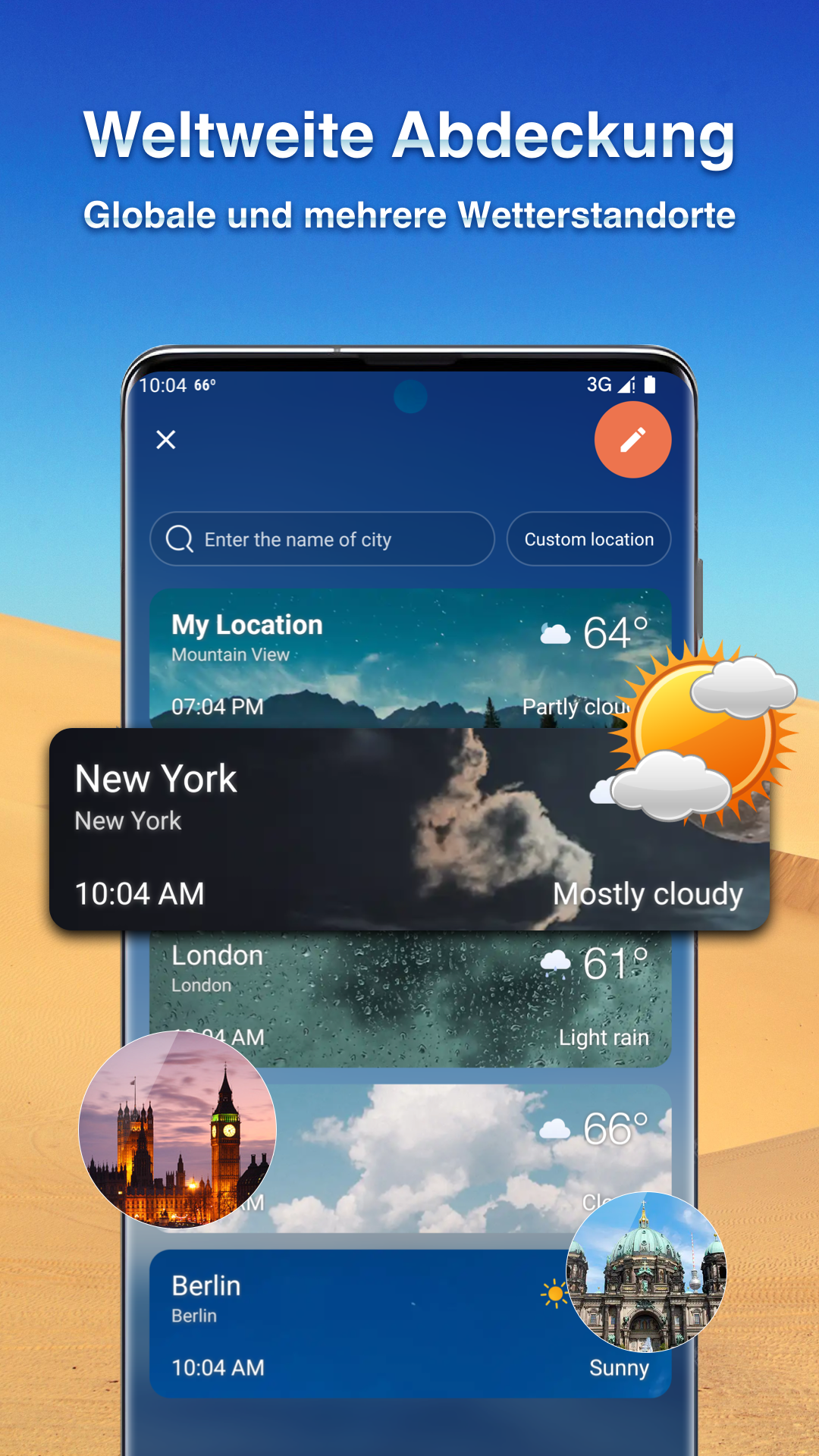 - Planen Sie eine Reise, möchten Sie das Wetter in Ihrer Heimatstadt überprüfen, möchten Sie das Wetter in der Stadt überprüfen, in der Ihre Familie lebt? Fügen Sie einfach eine beliebige Stadt auf der Welt hinzu und sehen Sie sich das Echtzeitwetter in dieser Stadt an