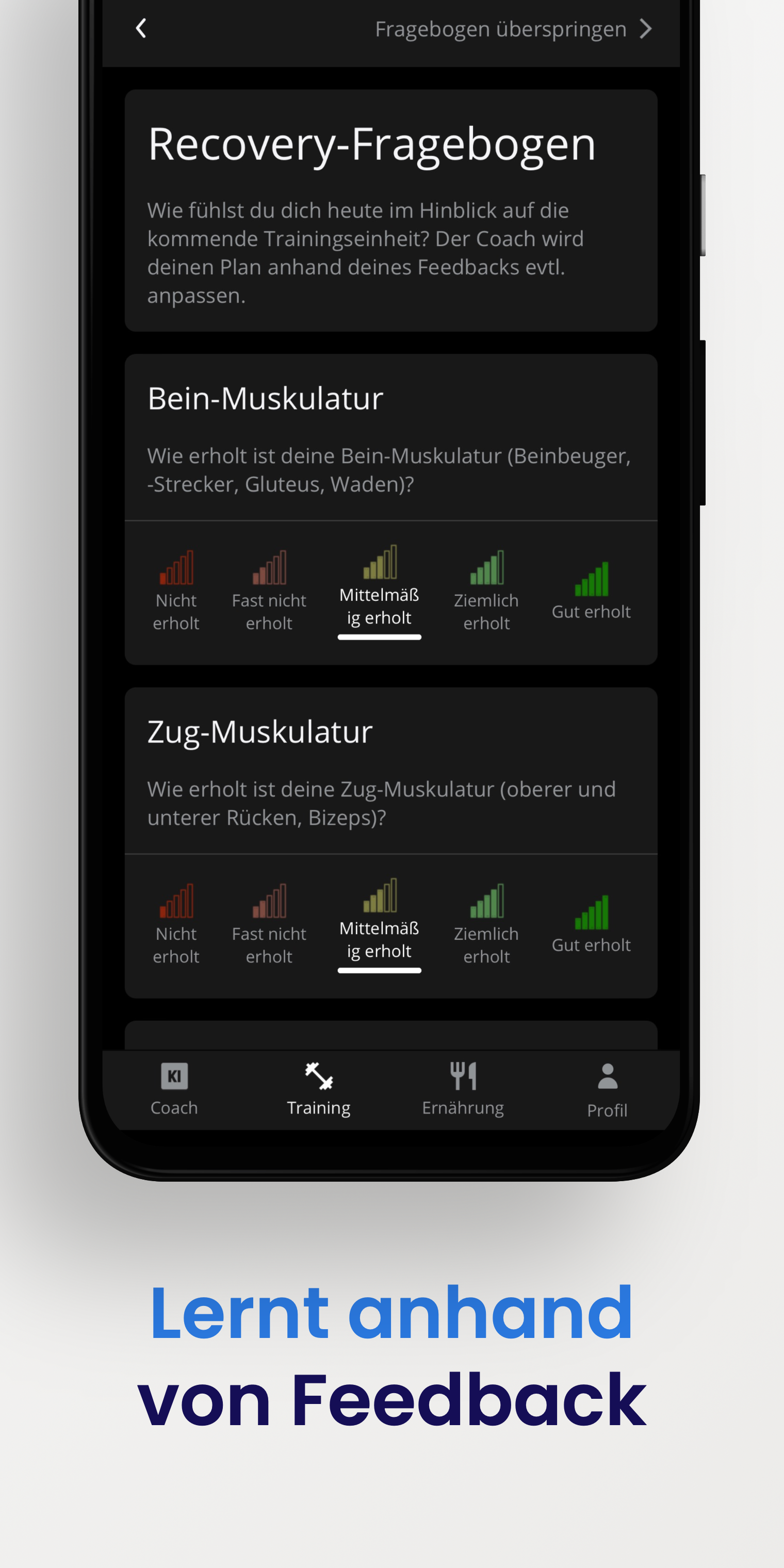 WIE FUNKTIONIERT DIE TRAININGSPLANUNG?Zu Beginn müssen einige Fragen beantwortet, welche die Künstliche Intelligenz nutzt, um eine Vielzahl an Parametern zu bestimmen, wie z.B. die optimale Übungsauswahl, Trainingsvolumen, -Intensität und -Frequenz. Diese Parameter bilden wiederum die Basis für die Erstellung des individuellen Trainingsplans. Außerdem kann der Nutzer den Plan weiter anpassen, darunter die Anzahl an Trainingstagen oder die Übungsauswahl. Zudem hat er die Möglichkeit Feedback zu geben, bspw. zur Intensität der Übung oder zur Erholung der einzelnen Muskelgruppen. Dadurch kann die Künstliche Intelligenz den Plan bei Bedarf anpassen und immer weiter dazulernen. Je länger der Nutzer mit der App trainiert, umso besser kann der Coach einschätzen, wie der Nutzer auf unterschiedliche Trainingsstimuli reagiert.