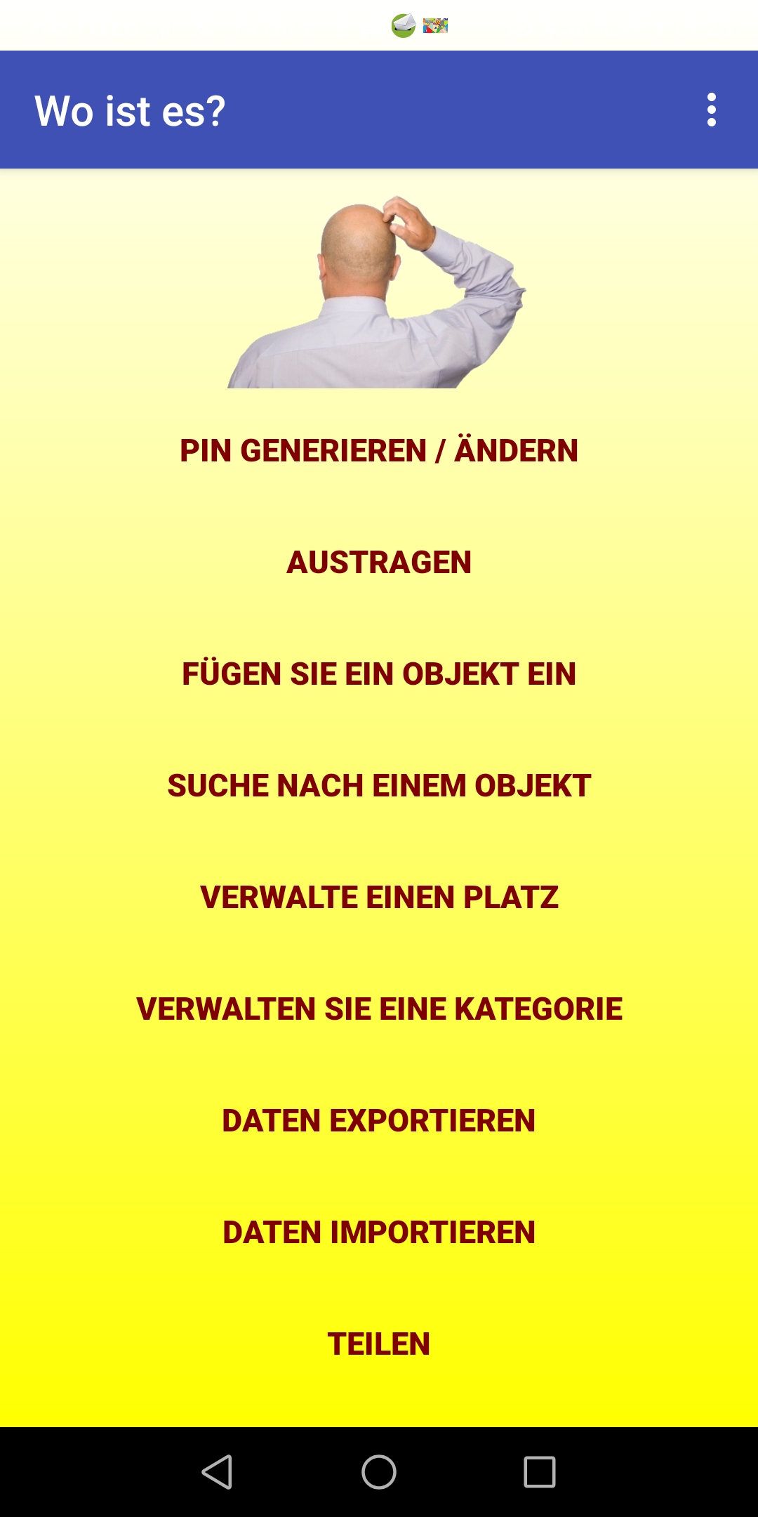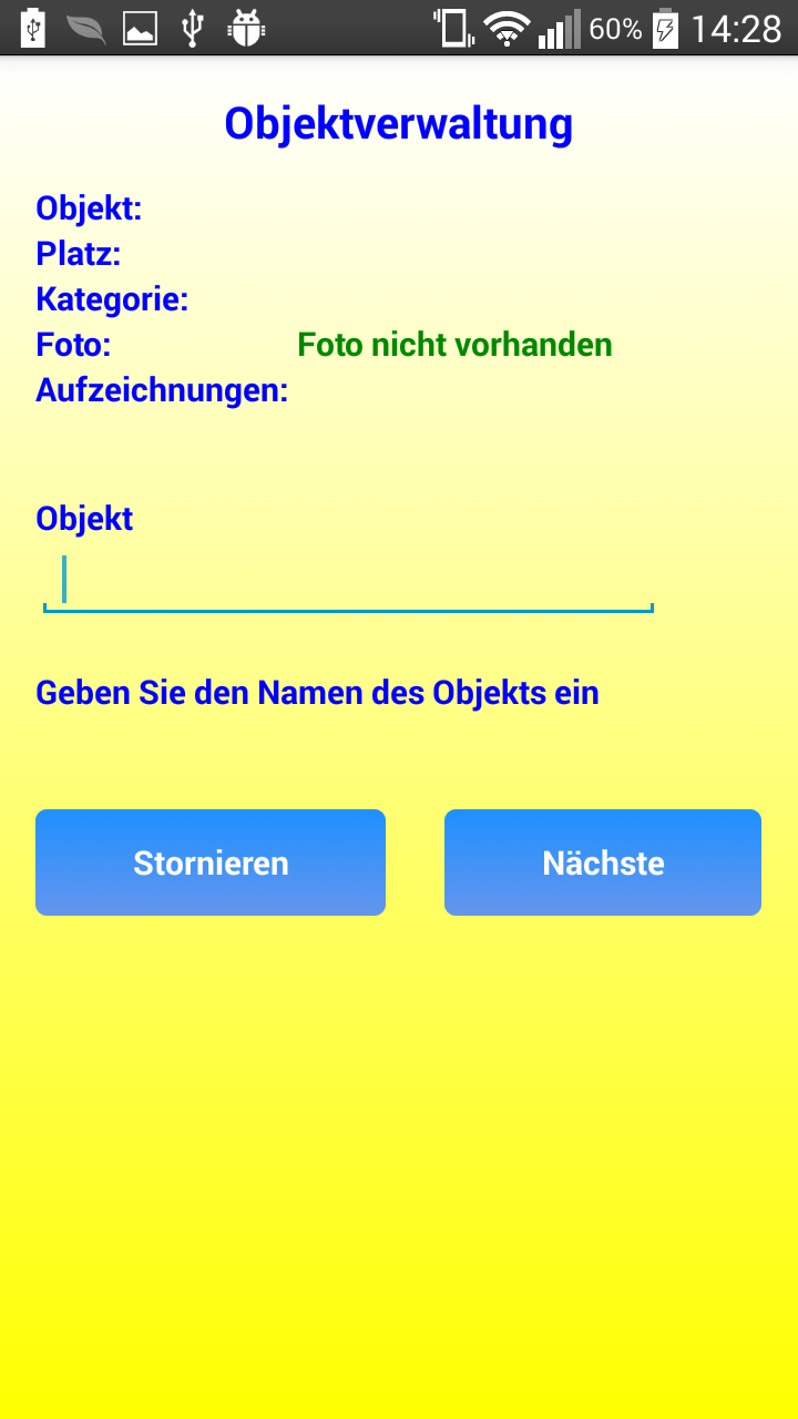 Jedem für Sie wichtigen Objekt ordnen Sie einen Namen und den Ort zu, an dem es sich befindet Sie sind dabei zu behalten (der Ort kann auch ein virtueller Ort sein); Außerdem, Optional können Sie ein Foto kombinieren, zusätzliche Hinweise, die kann nach einiger Zeit und einer Kategorie, zu der sie gehören, nützlich sein des Objekts (zum Beispiel: wertvolle Objekte, affektive Objekte usw.).