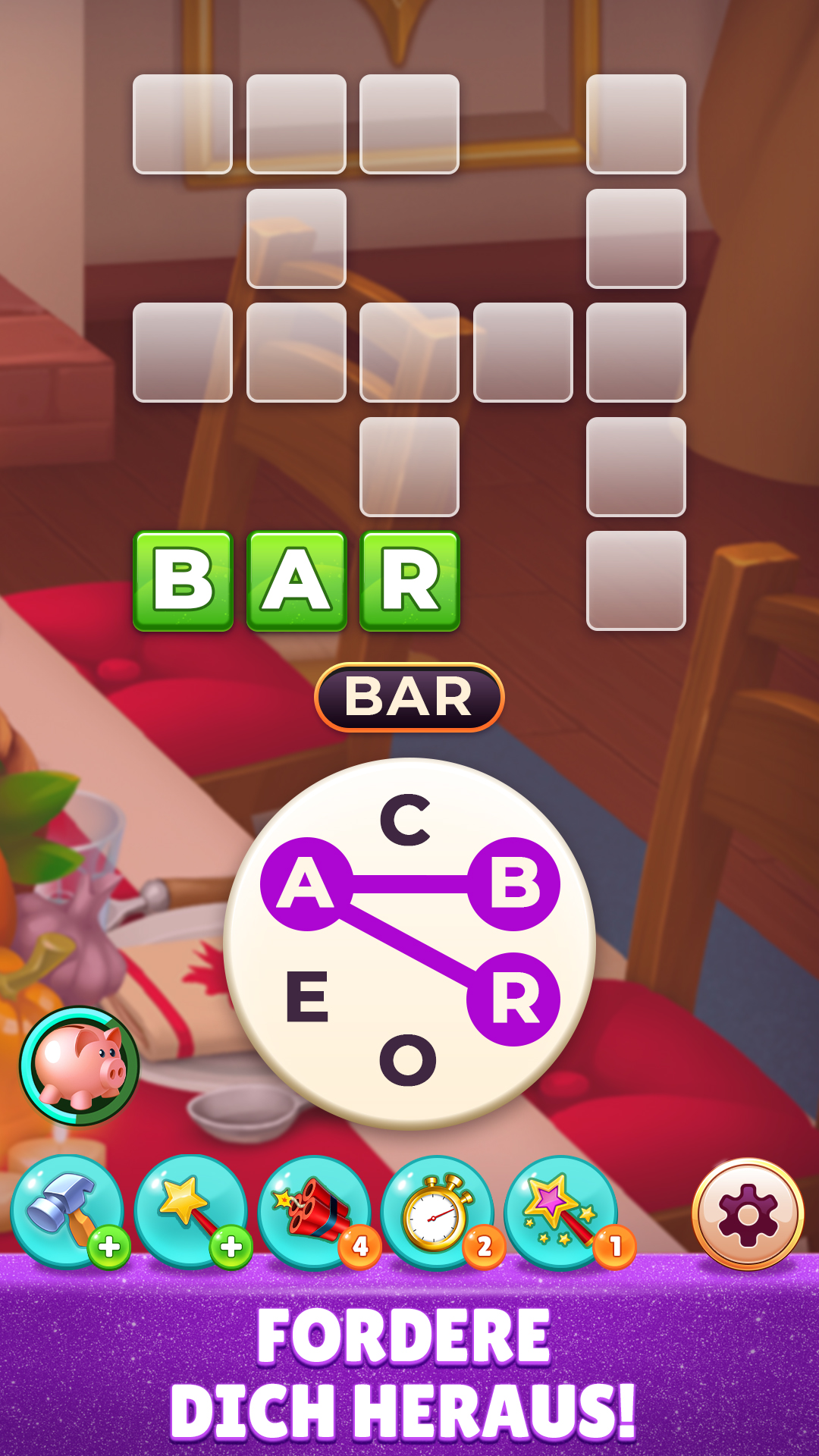 Booster - Wenn Sie jemals Probleme beim Lösen eines Worträtsels haben, tippen Sie auf das Feuerwerk oder den Hammer, um Rätselbuchstaben zu enthüllen, oder sprengen Sie ein ganzes Wort mit Dynamit weg. Vergessen Sie nicht, dass der Zauberstab auch nur einen Fingertipp entfernt ist.