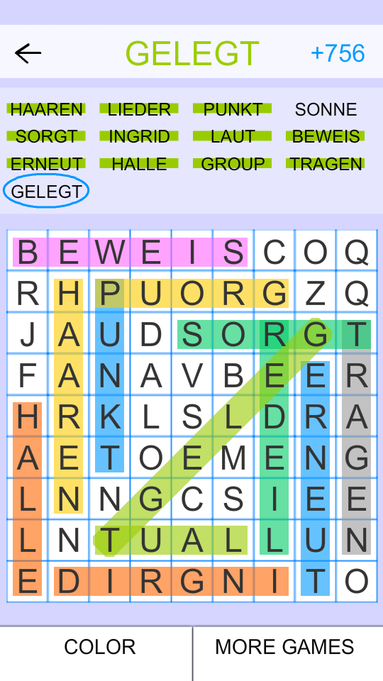 Wie zu spielen: Es wird eine Liste von versteckten Wörter angezeigt, die Sie auf dem Brett finden müssen! Legen Sie den Finger, um ein Wort wählen Sie einfach auf einen beliebigen Buchstaben auf dem Brett und verschieben Sie sie in benachbarten Buchstaben horizontal, vertikal oder diagonal! Es wird eine aktuell ausgewählte Wort am oberen Rand des Bildschirms für Ihre Hilfe und eine bessere Orientierung angezeigt. Finden Sie alle Wörter so schnell wie möglich und gehen für Highscores! Sie können sogar die Hintergrundfarbe ändern - nur die Schaltfläche Farbe in der linken unteren Ecke drücken.