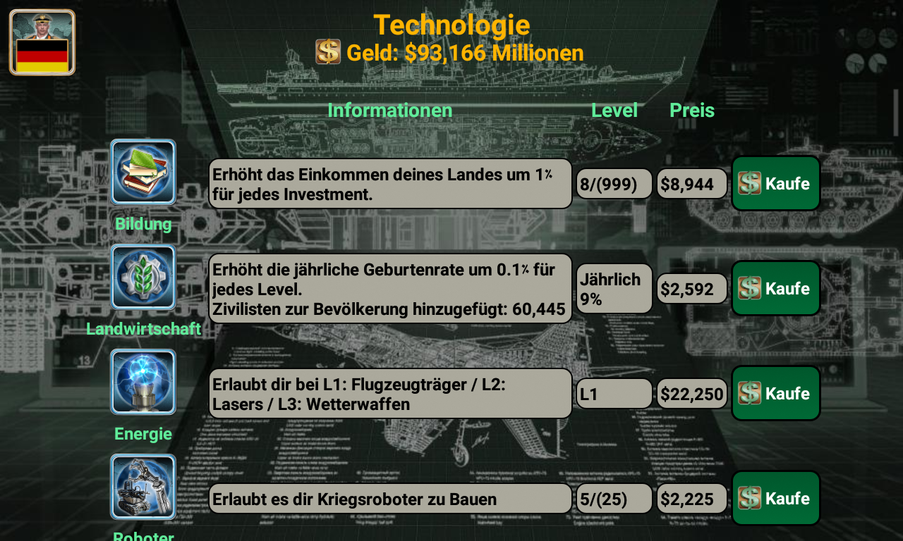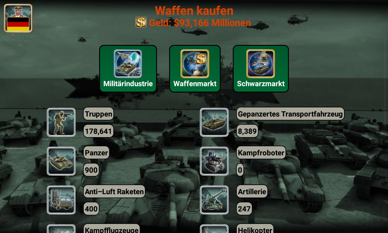 Rüsten Sie sich mit einer Vielzahl von Waffen aus, darunter Söldner, gepanzerte Personentransporter, Panzer, Artillerie, Luftabwehrraketen, Hubschrauber, Kampfjets, Schiffe, U-Boote, Kampfroboter, unbemannte Luftfahrzeuge, Flugzeugträger und ballistische Raketen.