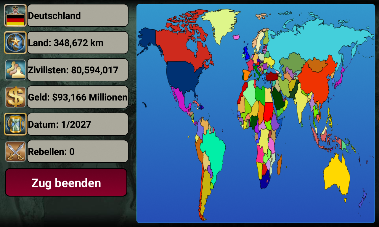 Weltreich ist ein rundenbasiertes Strategiespiel, bei dem Sie die Kontrolle über eines von 180 Ländern übernehmen und sich bemühen, ein Imperium aufzubauen. Nutzen Sie Diplomatie, Krieg und wirtschaftliche Macht, um Ihre Feinde zu erobern und zum obersten Führer aufzusteigen.