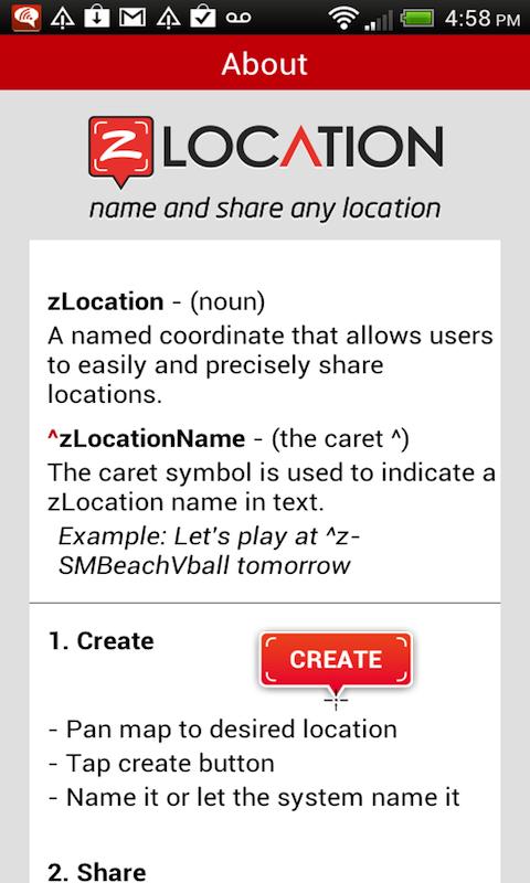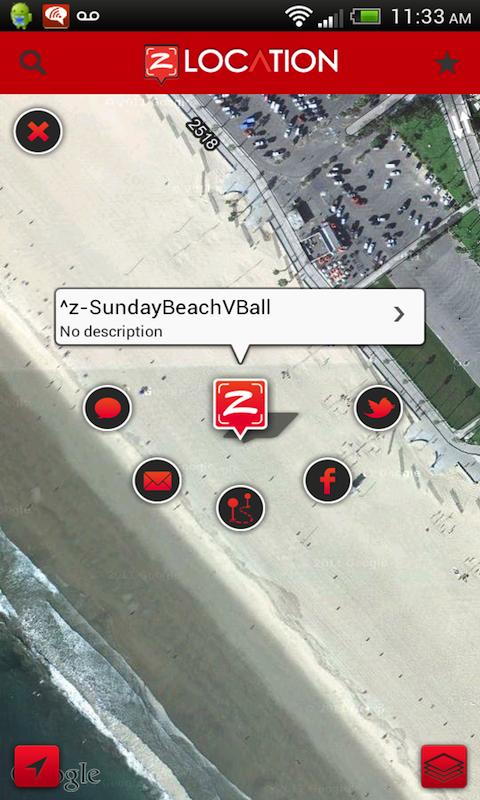 Once you've created a zLocation its name is saved in the zLocation system and points to the location you picked. Then you share the zLocation by name with friends via SMS, email, Twitter, Facebook, over the phone or on printed materials.