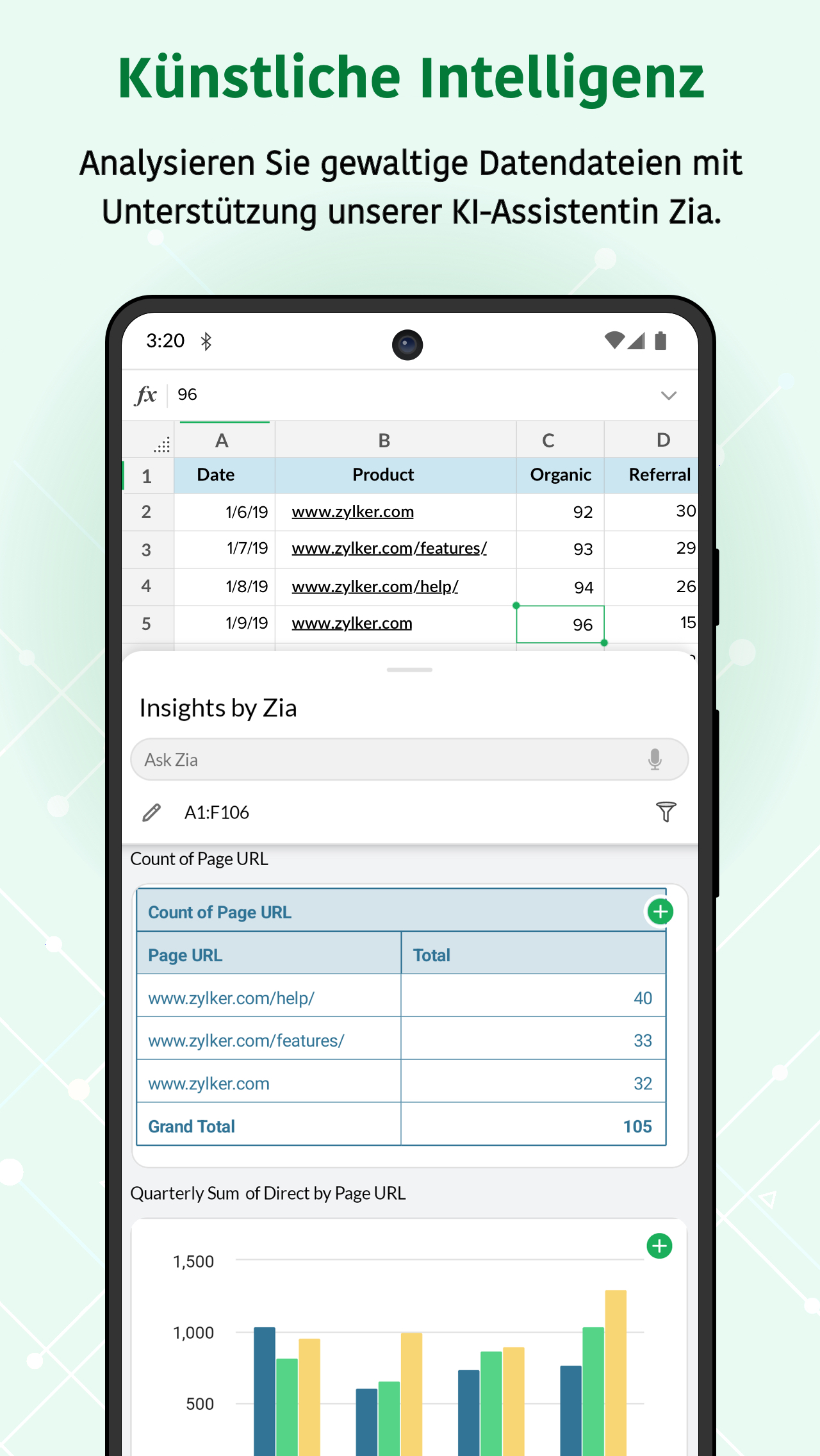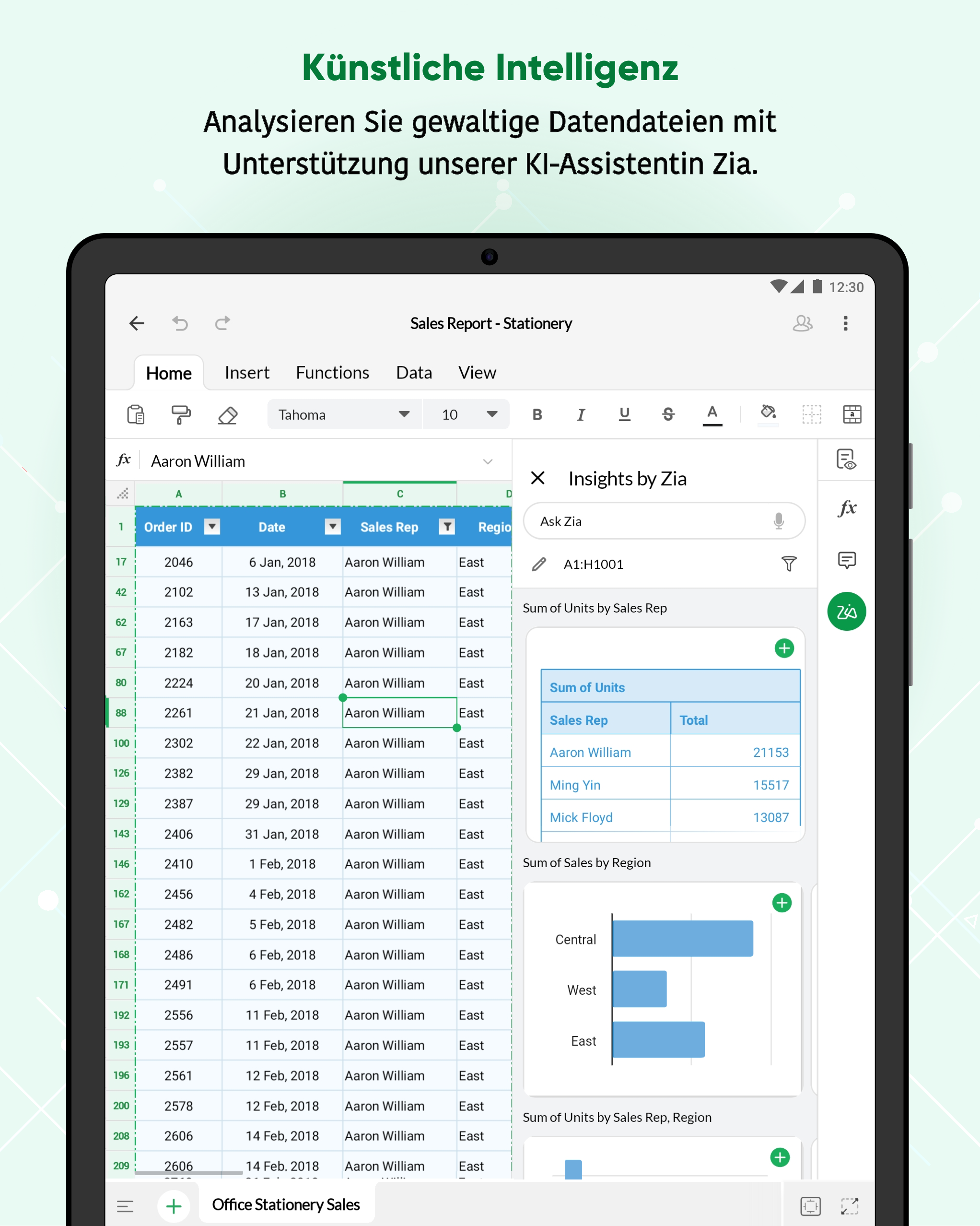 Überlassen Sie Zia, unserer hauseigenen künstlichen Intelligenz, die Schwerarbeit–lassen Sie Diagramme und Pivottabellen automatisch erstellen, holen Sie sich clevere Datenanalysevorschläge und Antworten auf Ihre Fragen per Sprachbefehl.