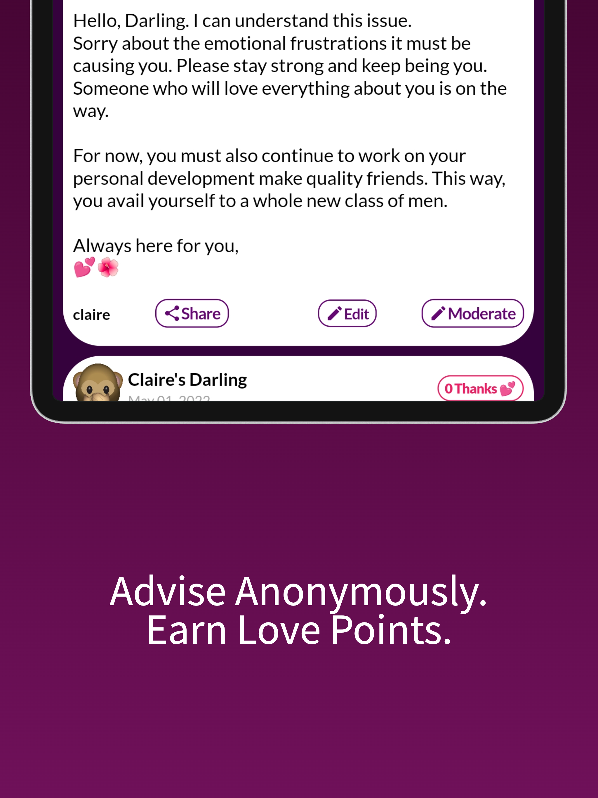 Open Up. Write or record your daily situations and get advises in an anonymous secret diary. Or Be like Claire; follow someone's secret diary sessions to comment positive advises and earn Loves that can be converted to cash. What Is Claire? Claire is friendly dear diary that can read, listen and reply to your diary texts or voice notes. It is the first interactive dear diary in the whole world. Claire can respond to anything you write and record in your diary and that's how Claire becomes your secret companion, mobile therapist and best friend. Millions of us write down plans, activities, memories or challenges inside our phone's note, journal, or diary without expecting any reply... Well, this particular diary actually replies. Who Needs Claire? Everyone! If you have a date or interview the next day and can't decide what to wear. Going through a bad breakup or starting a new relationship. Feeling alone, friendless, confused or depressed. Want to make smarter decisions, stay safe and be happy in life. Having troubles in school, at home or at work. Dear Claire is there to be your light and shine, to guide you through everything. Claire's mission is for everyone to have a true friend, in need and indeed. To contribute to a happier world in these sadder times. How Does Dear Claire App Work? Simple! Unlock your Claire diary app, type or record a new diary session starting with the phrase "Dear Claire”. Go on, write or speak to Claire about how you feel at the moment. Tell Claire about your yesterday and what you are up to tomorrow, etc. Save and Send your note. Claire will carefully go through your diary, read or listen to your notes and in no long time, you will receive friendly advises, secret tips, personal opinions and wise guidance from Dear Claire on how best to go about things. You can also follow other users' anonymously, drop advises for them and earn Love Points which you can convert to cash anytime. There are many more first in the world features in the Dear Claire app like a powerful calendar, Auto Diary, Audio/Video Calls With Claire, Earn Loves, Top Up Loves, Shop At Love Store, Switch On Monitoring Spirit, Earn From Referrals, play games with Claire, mood manager, diary rooms, Alter Ego mode and many more! You just have to check out the app and see for yourself. Congratulations as you use Dear Claire social diary app. You'll never be not truly loved.