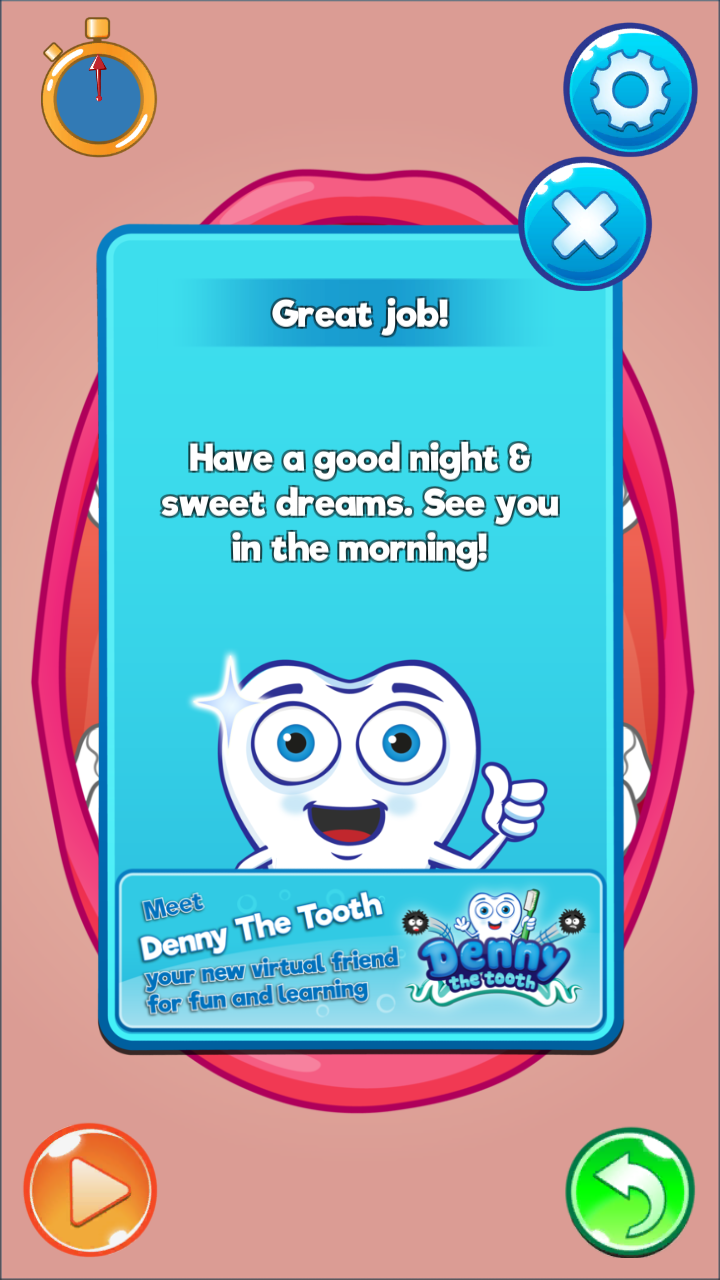 Denny® Timer is a visually instructive, animated timer that teaches children how to brush their teeth properly and thoroughly during the recommended 2-minute time. Denny® Timer also makes brushing teeth more fun! • You can select a regular or electronic tooth brush. • Denny and animations guide you during brushing teeth – a proper, careful brushing keeps your teeth healthy! • You can set Denny® Timer to remind you to brush your teeth at the desired time in the morning and evening – Denny is a handy helper for the daily routine! Denny® Timer has been developed in co-operation with dental health experts. Our research results highlight that 90% of children, who use Denny® Timer, learnt to brush their teeth better, longer and more carefully!