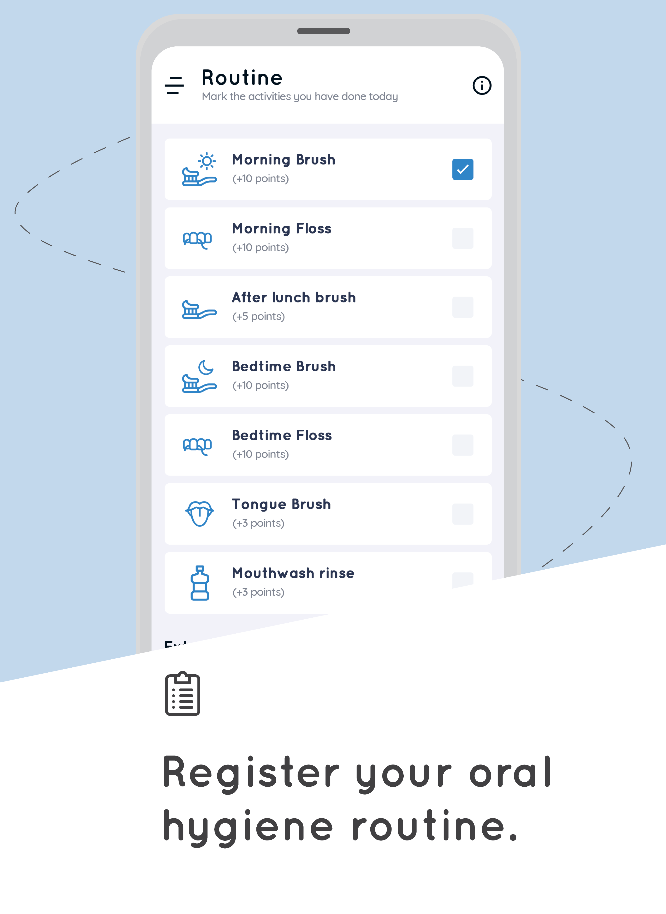 ☆ Track multiple Oral Hygiene habits: brush your teeth, floss, mouthwash rinse, and tongue brush.