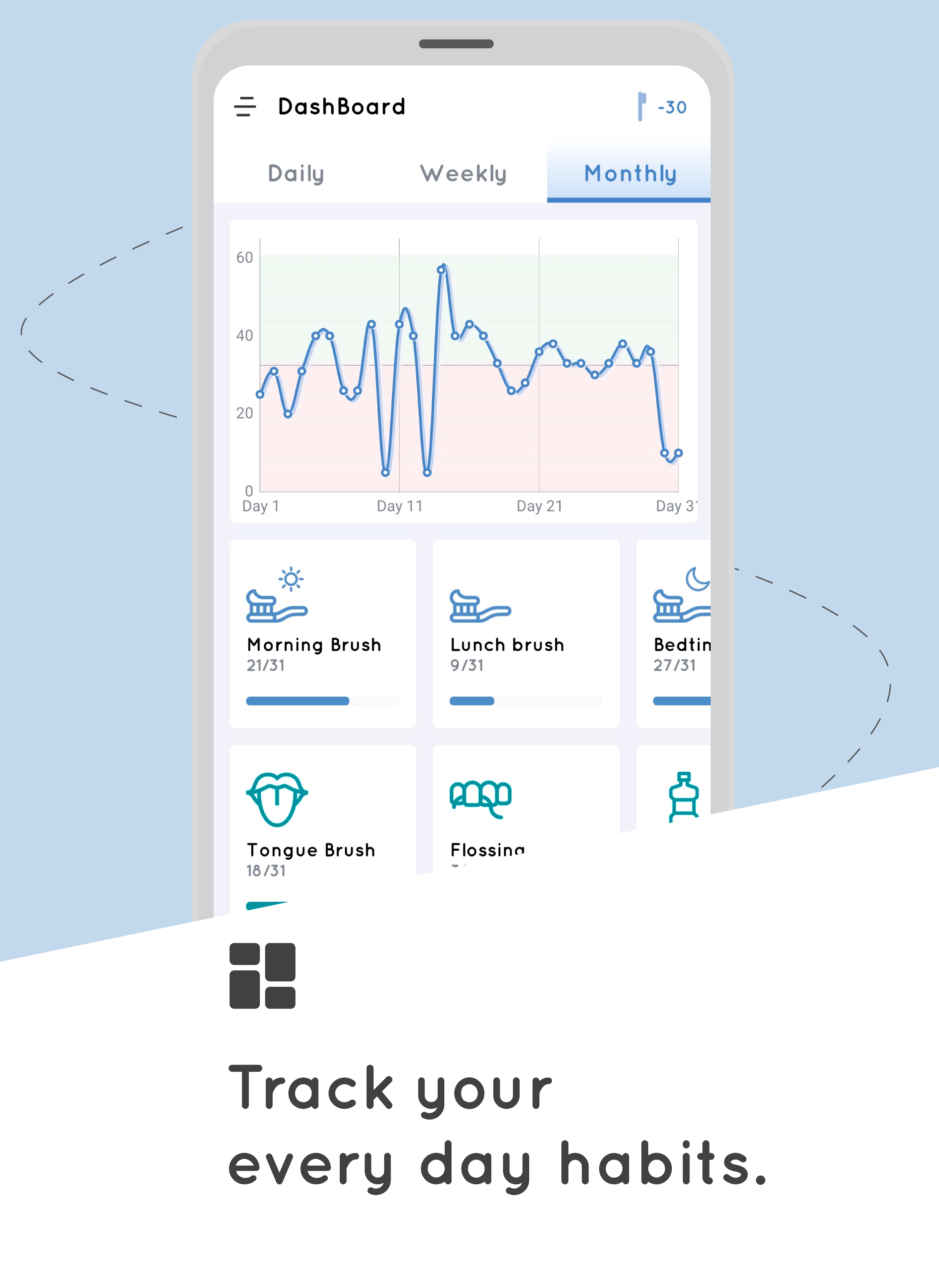 ☆ Dashboard with 1-day/1-week/1-month statistics, easy to understand if your daily oral care is adequate or lacking.