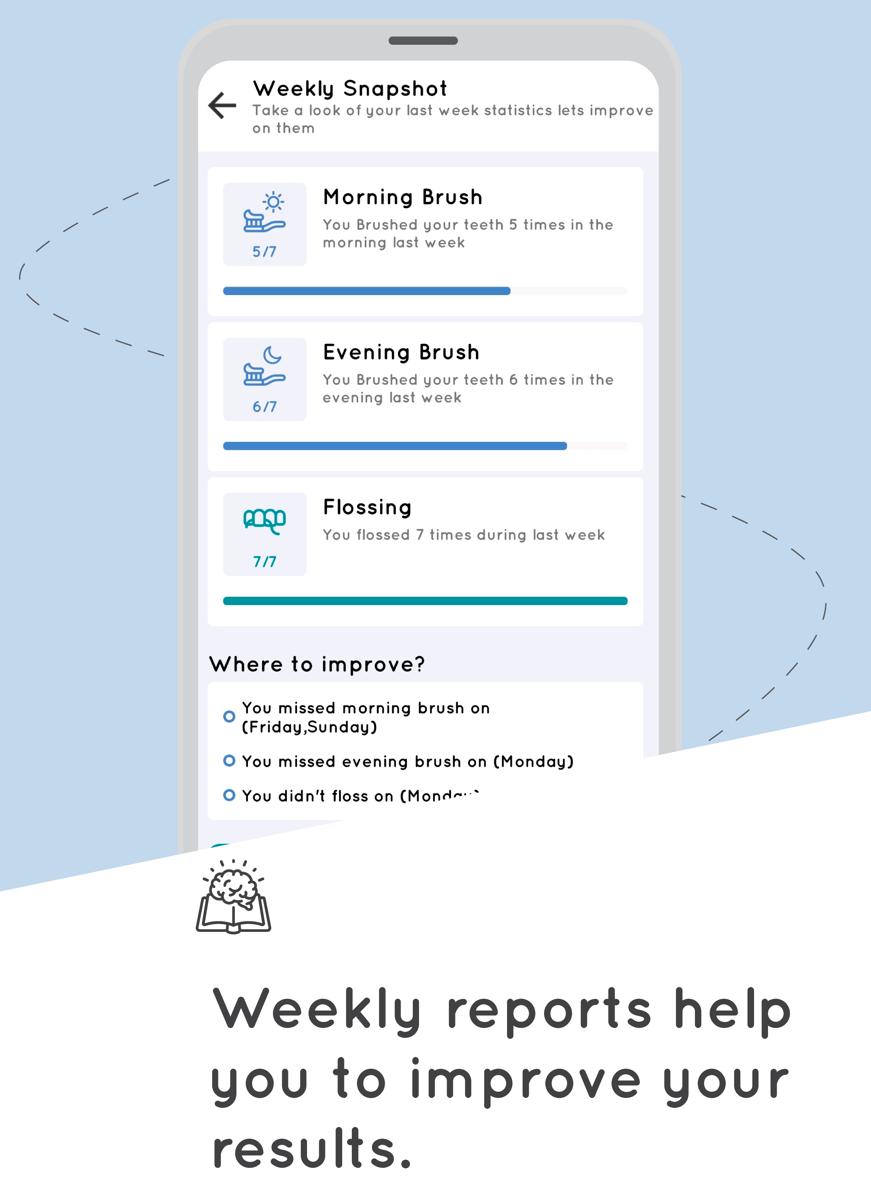 ☆ Receive weekly reports of your performance and detailed suggestions on how to improve your dental care.