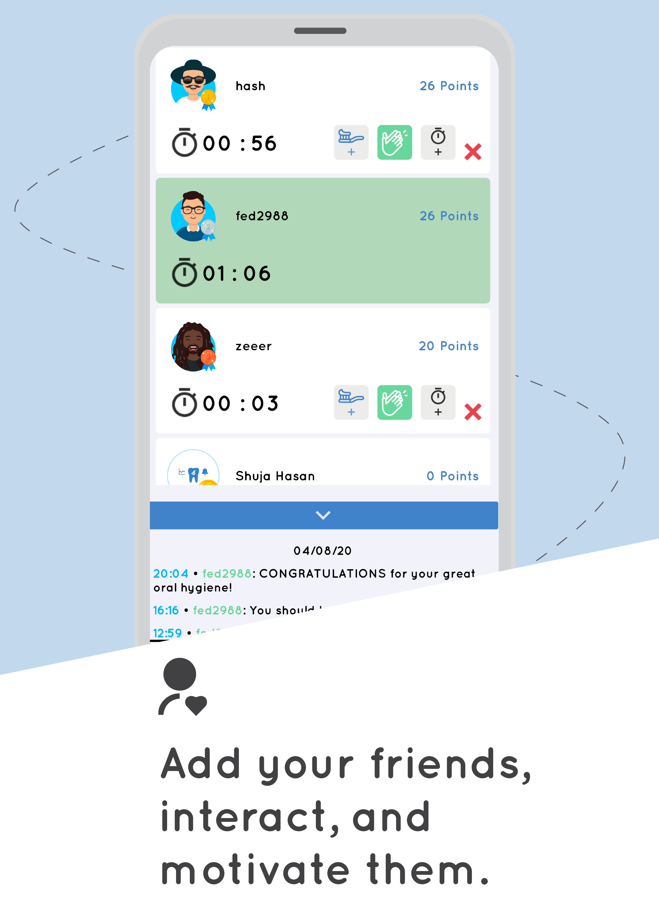 ☆ Add your friends, interact with them, and motivate each other to better habits of health for your teeth.
