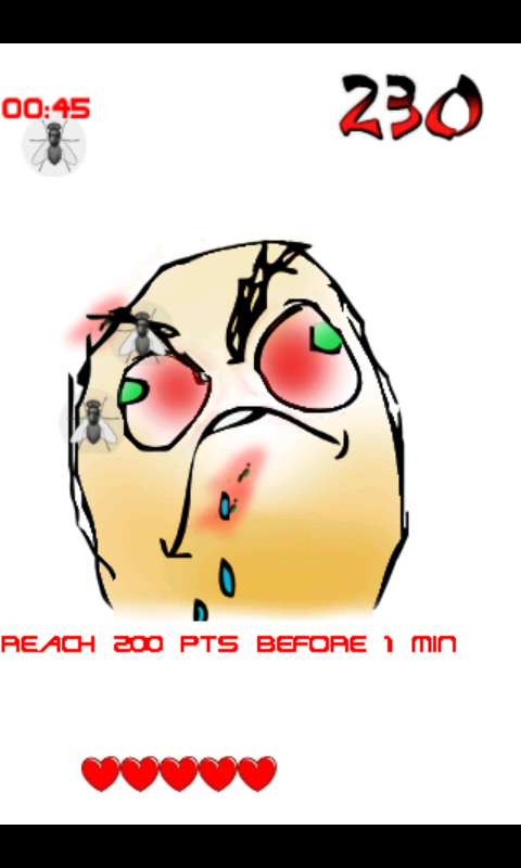 STRIKE Rage Meme TO MAKE HIM ENRAGED ! WOUNDS APPEAR ALL OVER HIS FACE Derp & Forever Alone NEW: FLY VERSION : Help Rage guy to get off all those flies that make him crazy and make the highest score in this fun and trash game ! Be careful not to hit Rage guy if you don't want to lose 1 life and 10 points. When you hit him, he screams, and shake his head Time is limited and if the score reaches "0" the game is over. - Dynamic injuries! - interactive strike system with "shaking screen" and vibrator - Challenge mode - 8 different moods - will you succeed to calm him down ? FREE UDAPTE -- Feedback are welcome , we consider each of your remarks for improve this game NEW : FOREVER ALONE