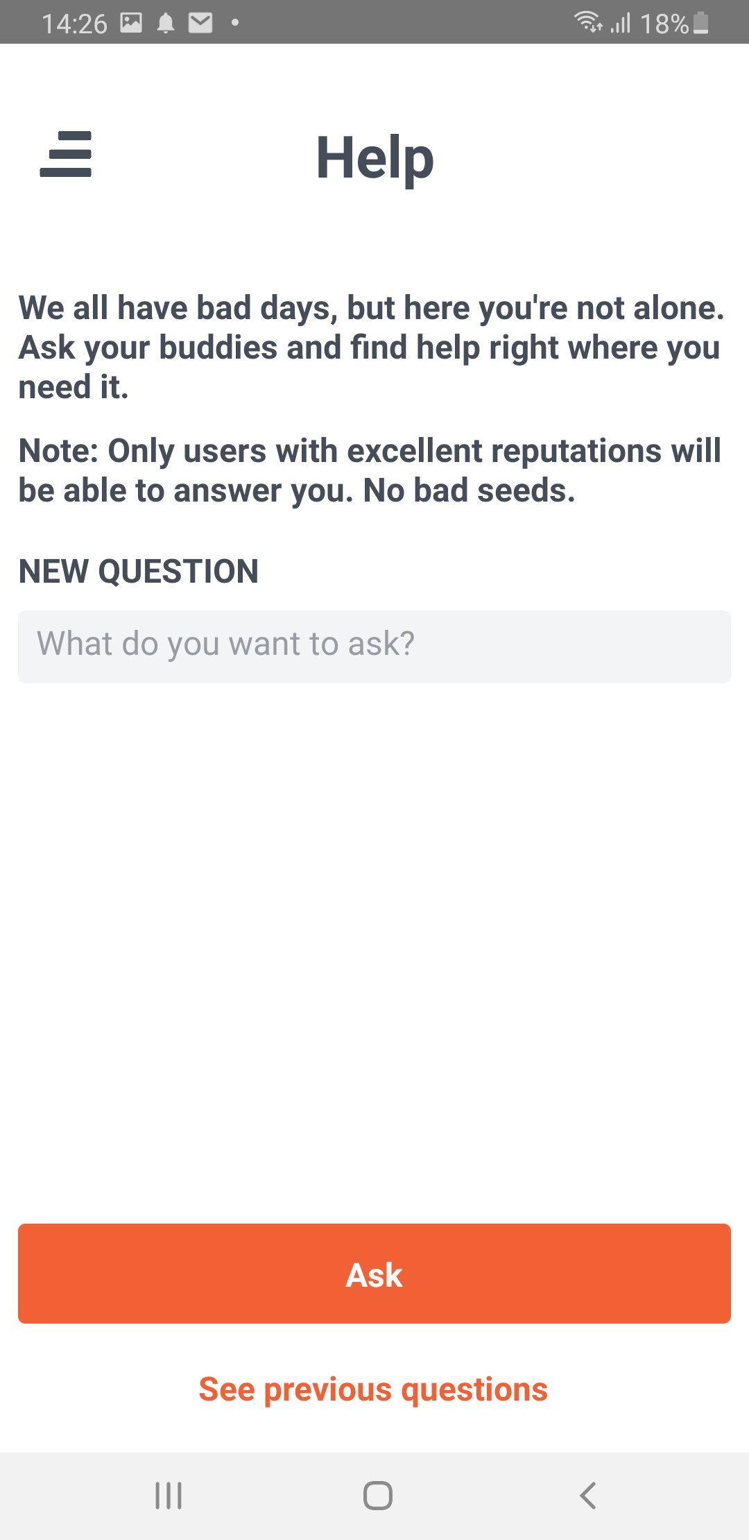 - use the cry for help button when you're really down and depressed or if you just had a binge eating episode. Only users with excellent reputation will be able to answer you. No bad seeds.