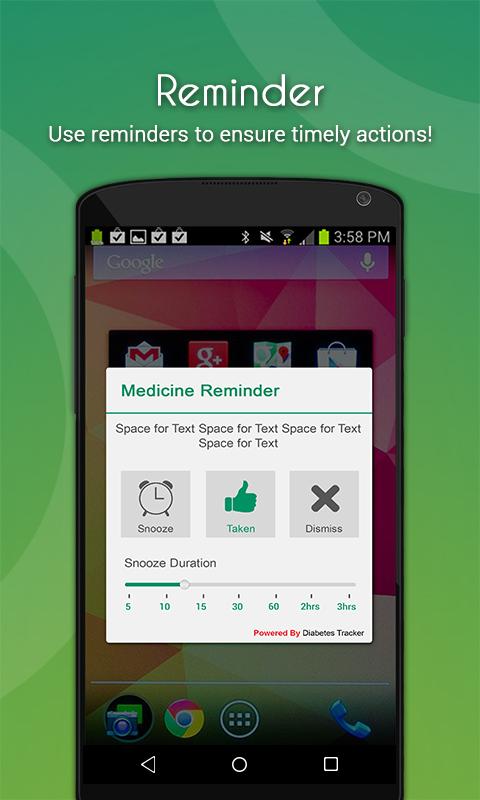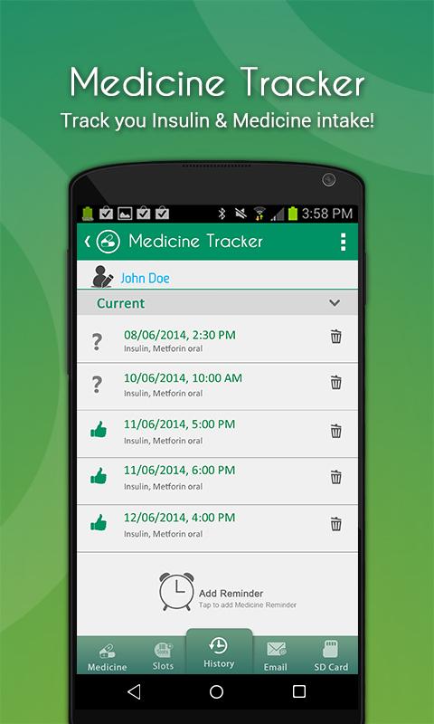 Medicine Tracker: Keep a track of your Insulin intake and all your Medicines. Schedule reminders to track the medicines that are taken and those that are dismissed.