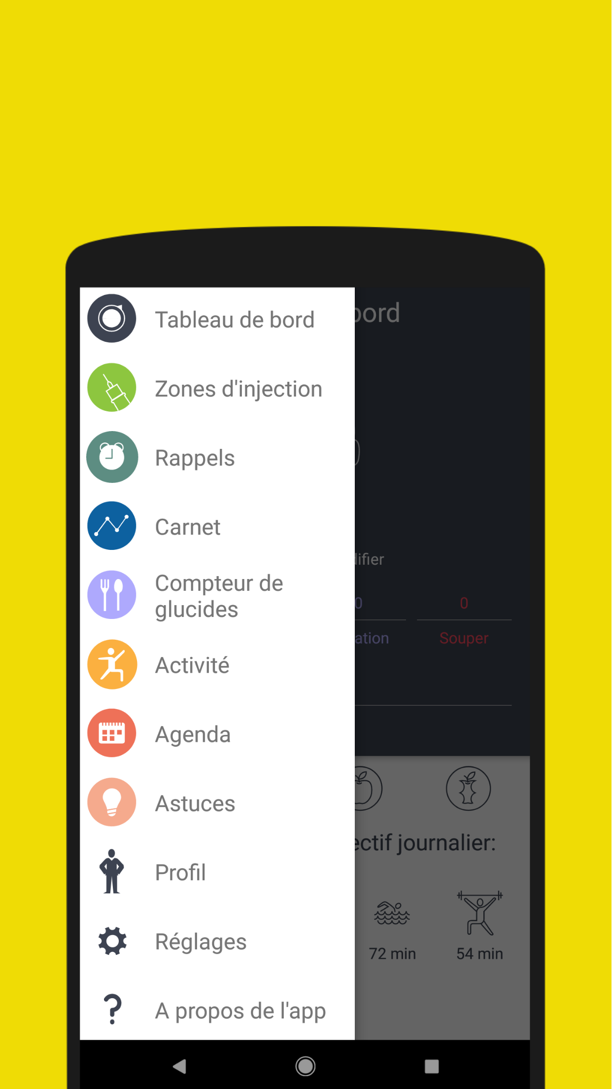 Diabetes24 est une app qui été conçue pour les personnes atteintes de diabète, en fonction de leurs besoins. Cette app hyper complète vous aidera à gérer votre diabète dans la vie de tous les jours. En un coup d’œil, analysez votre nombre de pas, la quantité de glucides ingérés, vos rappels en cours ainsi que vos derniers relevés glycémiques. - Configurez des rappels pour vos injections ou la prise de vos médicaments. - Suivez l’historique de vos relevés glycémiques en ayant la possibilité de les partager avec votre médecin. - Créez vos repas selon vos envies et suivez facilement votre consommation de glucides au fil de la journée! - Souvenez-vous des zones utilisées pour vos injections grâce au tracker d’injection. - Consultez nos conseils et astuces sur le diabète et la vie de tous les jours. - Allez toujours plus loin avec le compteur de pas! Fixez-vous des objectifs et suivez vos performances jour après jour.