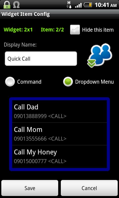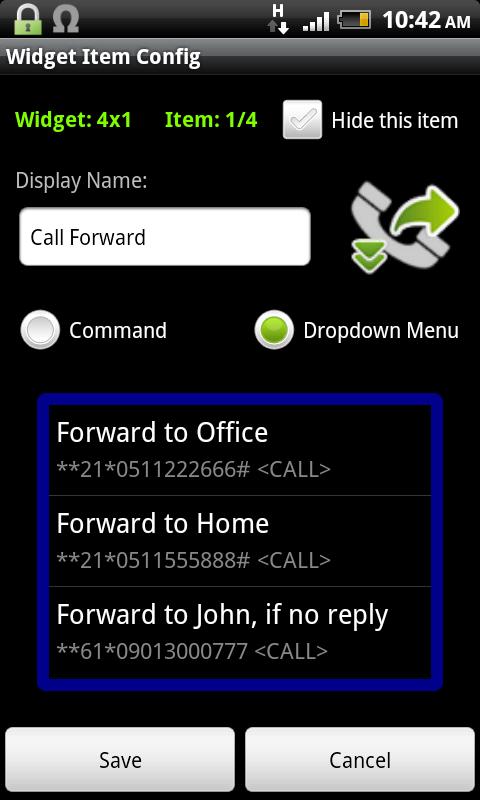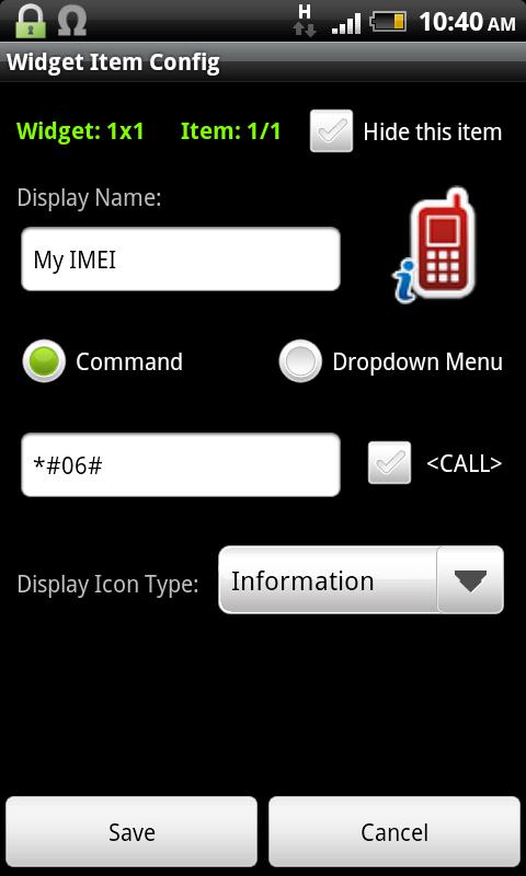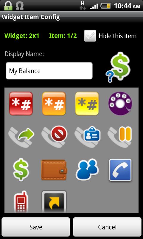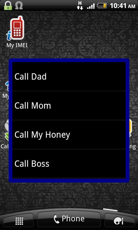 Dialpad Shortcut Widgets – The widgets that provide a shortcut to the Dialpad. In short, all things you can do with the dialpad, you can create a shortcut on the home screen to make it easy to access, by using this app. You can make a shortcut to call a phone number, shortcut to activate/deactivate or to check the status of the supplementary services like call forwarding, call barring... with a single click. Or you can make a shortcut for the USSD command (e.g for balance checking) or MMI command (Man-Machine Interface, e.g *#06# for IMEI, *#*#4636#*#* …). There are 3 widgets with different sizes (1x1, 2x1 and 4x1), that provide a total of 7 widget items. However you can practically create unlimited number of items by setting the widget item as the “Dropdown Menu”. 1. Main GUI: - Here you can see 3 widgets with different sizes. - Click on the widget item to configure it. - Click “Preview with Homescreen Wallpaper” check box to see how the widgets will display on the real home screen. - After configuring the widget items, exit the app and back to the home screen, long tap on the home screen, select Widgets and then select “Dialpad Shortcut 1x1”, “Dialpad Shortcut 2x1” or “Dialpad Shortcut 4x1” to make it usable. 2. “Widget Item Config” GUI: - Here you can configure the widget item such as name, icon image, icon type. - You can set the item action when the user taps it on the home screen. Select “Command” radio button and enter command string that immediately executed, or select “Dropdown Menu” to display the menu. - With the “Dropdown Menu”, you can add the new menu items by select the menu “Add Menu Item”. To edit the existing menu item, click on it. Long click on the menu item to delete it. - In the Command field, you can enter the phone number (to call a person), the USSD string (e.g for balance checking, ask your mobile operator for the USSD syntax), or the MMI command (e.g *#21# {CALL} for call forwarding status, or *#06# for the IMEI...) - Select the {CALL} check box if you want to enter the command string in the dialpad followed by pressing the “Call” button. Otherwise leave it unchecked. - Select “Hide this item” to make the item invisible. For the MMI Command reference, please use my app “Advanced Call Settings” on the Google Play (https://play.google.com/store/apps/details?id=org.vndnguyen.advcallsettings) and switch to the “Reference Mode” (menu Operation - Reference Mode), select the appropriate services to get an MMI command. Any comment or suggestion are very welcome. Please visit: http://forum.xda-developers.com/showthread.php?t=2069948 v1.1.5: - Add Android Hidden Codes, Phone Manufacturer's Hidden Codes and VinaPhone USSD Commands in the Command Reference menu.