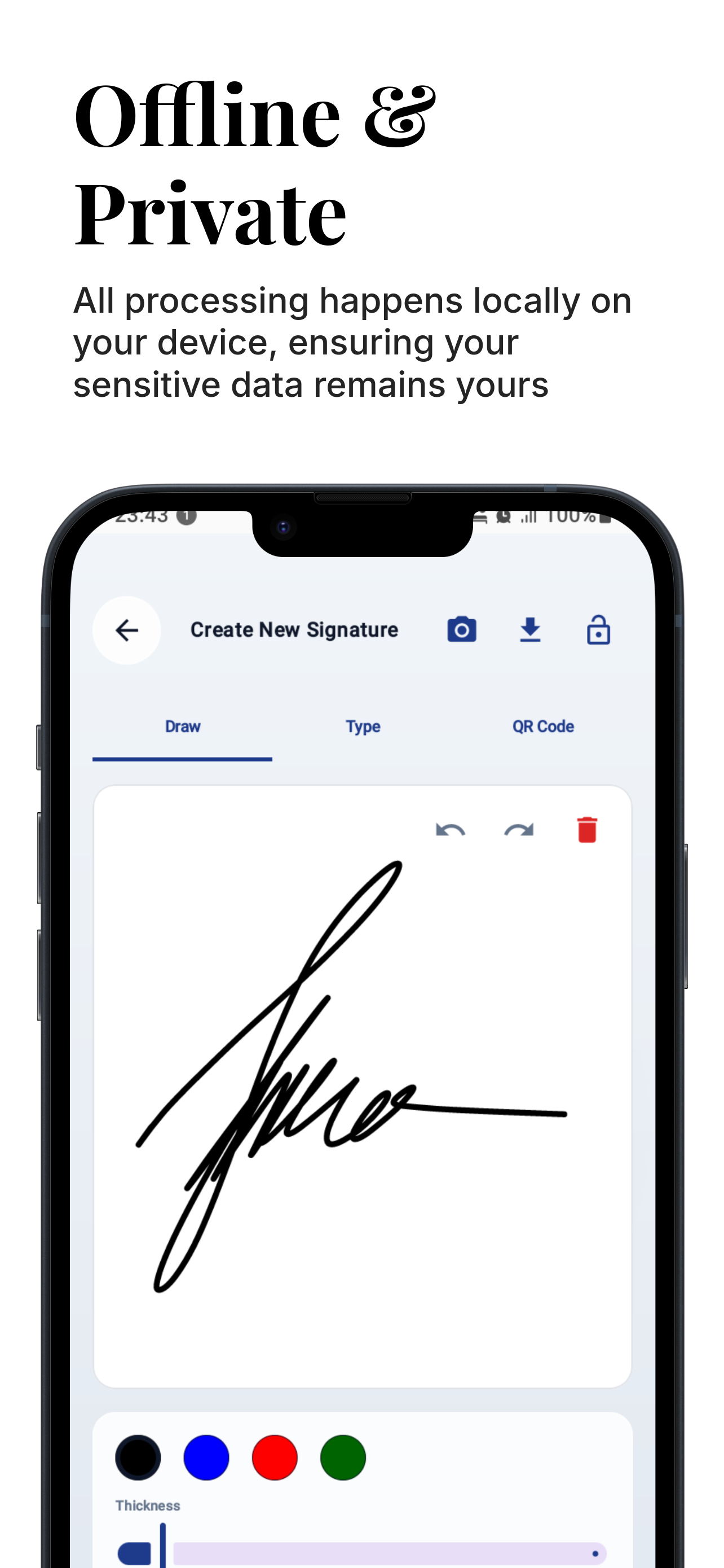 ✍️ Sign Documents Like a Pro Digital Signature Maker is the ultimate Offline-First Digital Signature & PDF Editor designed for professionals, freelancers, and enterprise users who demand security, speed, and privacy. No subscriptions, no cloud uploads, and no internet required—your sensitive contracts never leave your device. Whether you need to sign a contract, fill out a tax form, or stamp an invoice, Digital Signature Maker provides a beautiful "Liquid Glass" interface powered by cutting-edge technology to get the job done in seconds. 🚀 KEY FEATURES 🔒 100% Offline & Private Digital Signature Maker is built with a "Privacy First" architecture. Unlike other e-signature apps, we do not upload your documents to the cloud. All processing happens locally on your device, ensuring your sensitive data remains yours. • No Cloud Sync Required • Works completely without Internet • GDPR & CCPA Friendly by design 🛡️ Defense-Grade Security Protect your digital identity with biometric authentication. • Biometric Lock: Secure your signature creation with Fingerprint or FaceID. • PIN Protection: Fallback PIN security for devices without biometrics. • Encrypted QR Codes: Generate secure QR signatures containing encrypted metadata that only authorized scanners can verify. ✍️ 3 Professional Ways to Sign Create your perfect digital signature with our versatile tools: Draw: Use our smooth, pressure-sensitive ink engine (Bezier curves) that feels like a real pen. Type: Convert your name into a professional cursive signature using exclusive fonts. Scan-to-Sign: Have a wet-ink signature you love? Snap a photo, and our AI instantly removes the background to create a transparent digital asset. 📄 Powerful PDF Editor Turn your phone into a mobile office. Edit PDFs with precision tools that rival desktop software. • Drag & Drop: Easily place signatures, text, and stamps anywhere on the document. • Precision Sliders: Use X/Y/Scale sliders for pixel-perfect positioning—no more struggling with fat fingers blocking the view. • Multi-Page Support: Seamlessly navigate and sign multi-page contracts. • Zoom & Pan: High-performance rendering handles large blueprints and legal documents with ease. 🛠️ Enterprise Toolset Everything a business user needs, built right in: • Digital Rubber Stamps: Mark documents as "APPROVED", "CONFIDENTIAL", "DRAFT", "URGENT", and more. • Sticky Notes: Add yellow sticky notes for comments and annotations. • Date Picker: Insert the current date or choose a custom date with a single tap. • Rectangle Tool: Highlight key clauses or redact sections with box shapes. ✅ Legal Validity & Audit Trail Ensure your documents stand up in court. Digital Signature Maker automatically appends a Certificate of Completion page to every signed PDF. • Digital Fingerprint: Calculate a SHA-256 cryptographic hash of the document. • Tamper Proof: Proves exactly when the document was signed and that it hasn't been altered since. • Metadata: Records timestamp (UTC), device model, and verification QR code. 🌟 WHY CHOOSE THIS APP? • Modern UI: Experience the sleek "Liquid Glass" design that makes work feel effortless. • Dark Mode: Fully optimized "Night Glass" mode for signing documents in low light. • No Account Needed: Download and start signing immediately. No signup, no login walls. • Lightweight: A powerful PDF engine that won't bloat your storage. Permissions Notice: • Biometrics: Used strictly to lock/unlock the signature creation screen. • Storage: Required to save your signed PDFs and export signatures to your Gallery. • Camera: Used only for the "Scan-to-Sign" feature to capture your physical signature. Digital Signature Maker respects your privacy. We do not track your document contents or signature data.