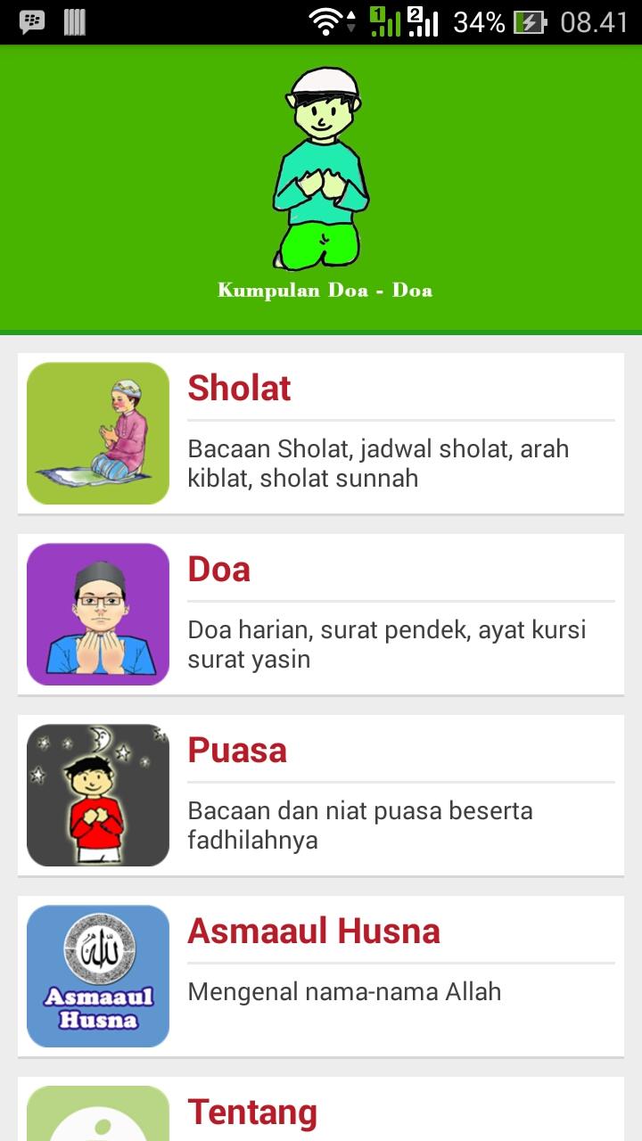 Kumpulan doa-doa harian meliputi : - doa makan - doa sesudah makan - doa sebelum tidur - doa bangun tidur - doa masuk rumah - doa keluar rumah - doa niat puasa - doa masuk wc - doa keluar wc - doa masuk masjid - doa mandi - doa qunut - doa menempuh ujian - doa sesudah sholat - doa sebelum dan sesudah belajar - dan doa islam lainnya Aplikasi ini merupakan koleksi dari doa-doa sehari-hari yang cocok untuk diperkenalkan kepada anak-anak. Selain dilengkapi dengan gambar yang menarik, dalam setiap doa menggunakan tulisan Arab untuk mengenalkan bacaan dan terjemah dalam Bahasa Indonesia lengkap dengan suara pembaca do'a (Audio). selain itu aplikasi ini dilengkapi dengan asmaaul husna, kata-kata mutiara islami, kumpulan surat-surat pendek yang dilengkapi dengan suara, bacaan shalat fardhu, shalat sunnah, shalat jenazah juga terdapat surat yasin serta ayat kursi beserta terjemahannya yang memudahkan pengguna untuk membaca yasin dan ayat kursi serta terdapat fitur jadwal shalat dan petunjuk arah kiblat. "bangga akan karya indonesia dan terus berdoa dan bersyukur"