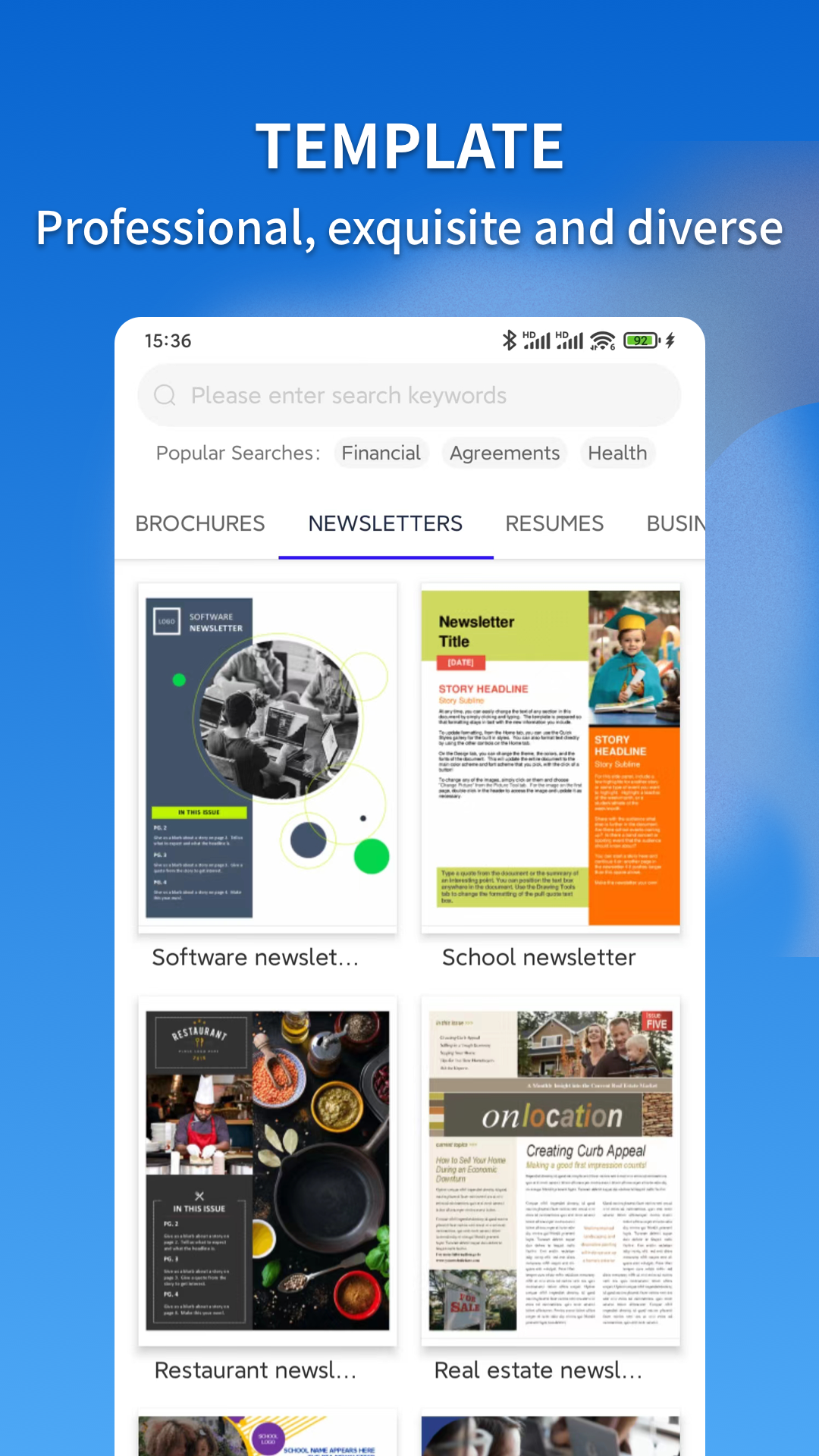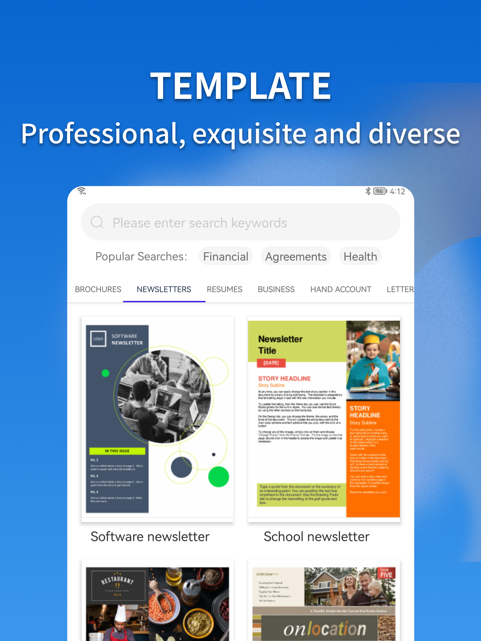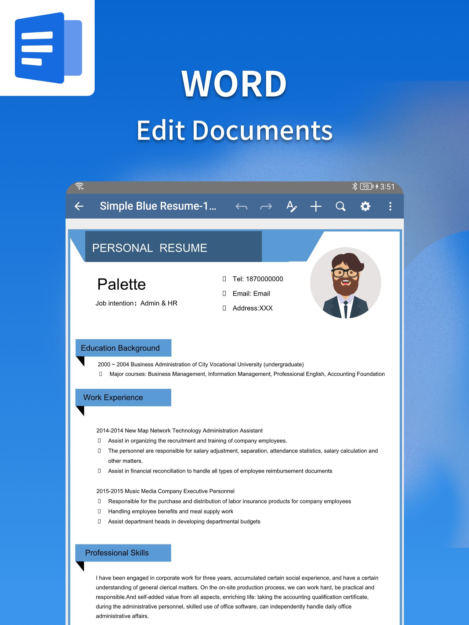 The document editor provides you with a variety of document templates, sheets templates and slides templates, including: personal resume templates, work summary templates, labor contract templates, lease contract templates, part-time contract templates, work report templates, etc. You can easily use templates to edit documents in documents, sheets, and slides, making your mobile office more efficient.