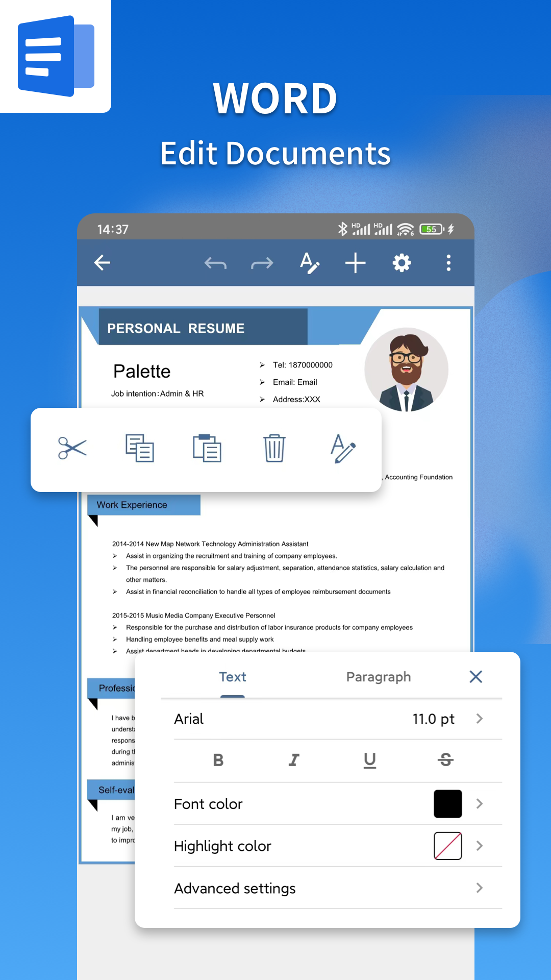 Document Editor is a smart office software for mobile phones. You can view, edit, create and manage documents, sheets, slides, pdf, notes, notepad and other documents on your mobile phone. Document Editor supports docs, docx, wps, wpt, dot, rtf, xls, xlsx, et, ett, xlt, dps, dpt, ppt, pot, txt and other file formats. OCR text recognition and image recognition help you easily convert images into text, and file management and document editing help you easily edit documents, sheets, slides, and pdf documents in your mobile phone.