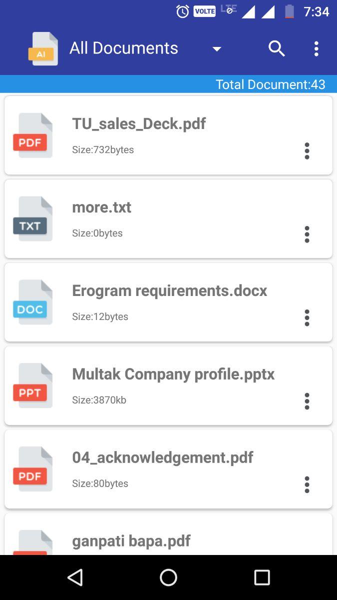 Document Manager 2017 Free app to manage Document Files. Direct List of Documents available in mobile storage. Manage Documents, Filter or Short Document Files, Document Viewer 2017 Free. Document Management in your mobile. Shortlist xls, pdf, doc, txt files in your mobile. In this app manage PDF, Text, Microsoft Word, Microsoft Excel and Microsoft PowerPoint documents at one place. This is very simple and user friendly app. Get list of all documents available in your smart phone at single place. Easily delete & share Bunch of documents.Search any document from the list. You can read & manage any document any time anywhere. Categorize these lists of documents in to PDF Files, Text Documents, MS Word, MS Excel, MS PowerPoint. Open pdf file, view pdf file, text file viewer, txt file view, pdf viewer. free pdf viewer. sort pdf files. FEATURES: - List PDF, XLS, PPT, DOC, TXT Files - Open files direct - Filter By File Type - Short files by Name, Date, Size - Search file, rename, delete - Share Files Txt manager text files manager xls files manager pdf files manager ppt files manager pdf viewer ppt viewer viewer for excel files viewer for pdf files pdf manager pdf file file manager for word files word files manager pdf reader office files manager list pdf files list excel files office manager docs manager 2017 document files manager file manager download Document Management manage scan document scanned document can manage in this app. this is very easy document manager text files manager