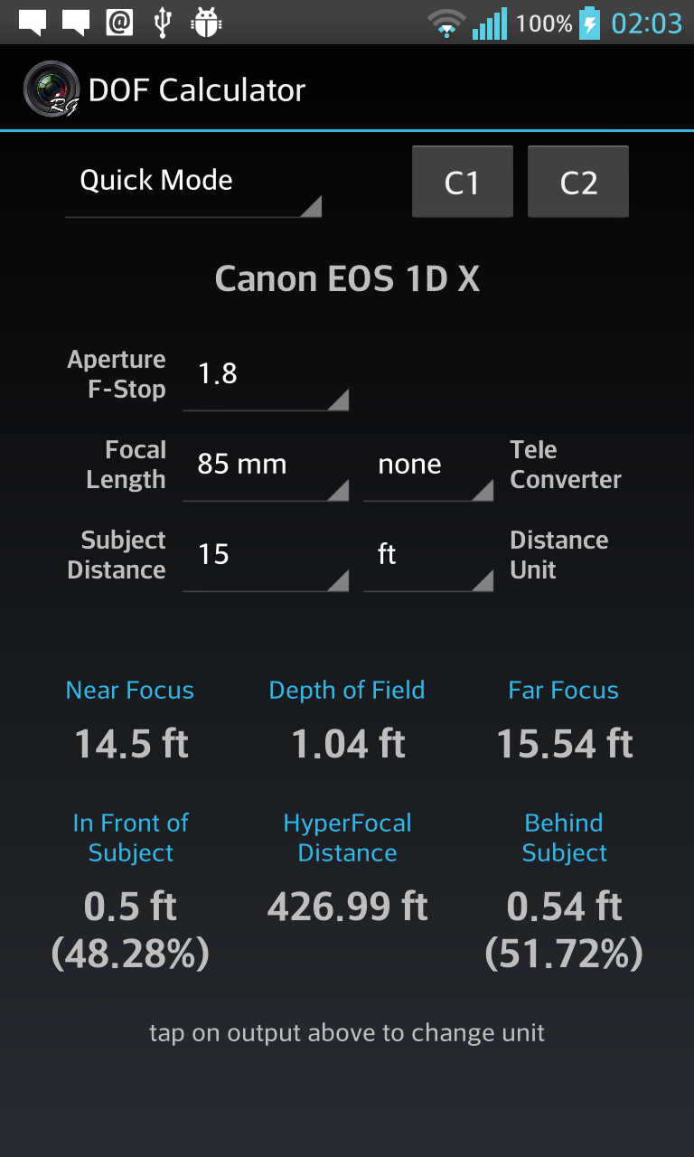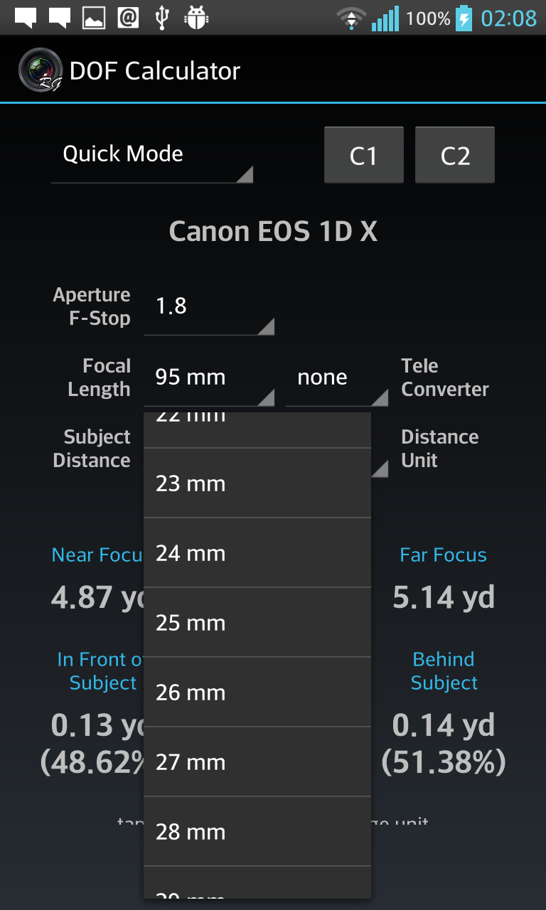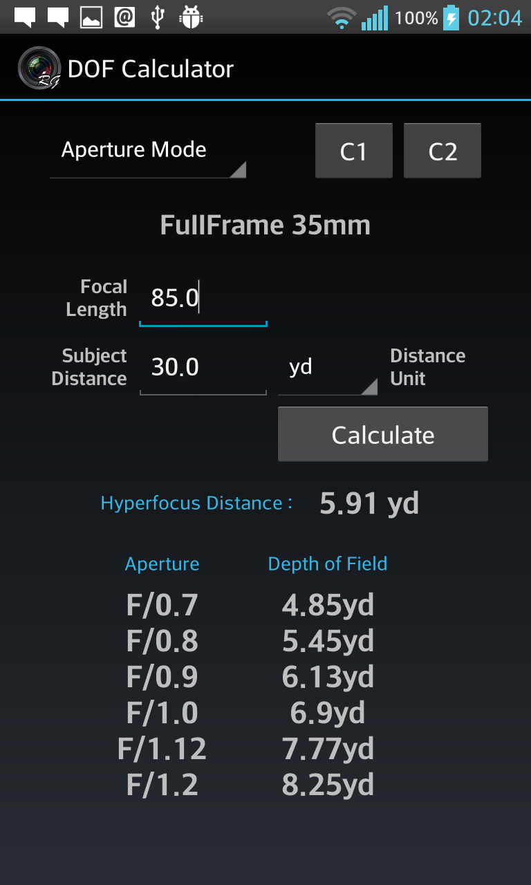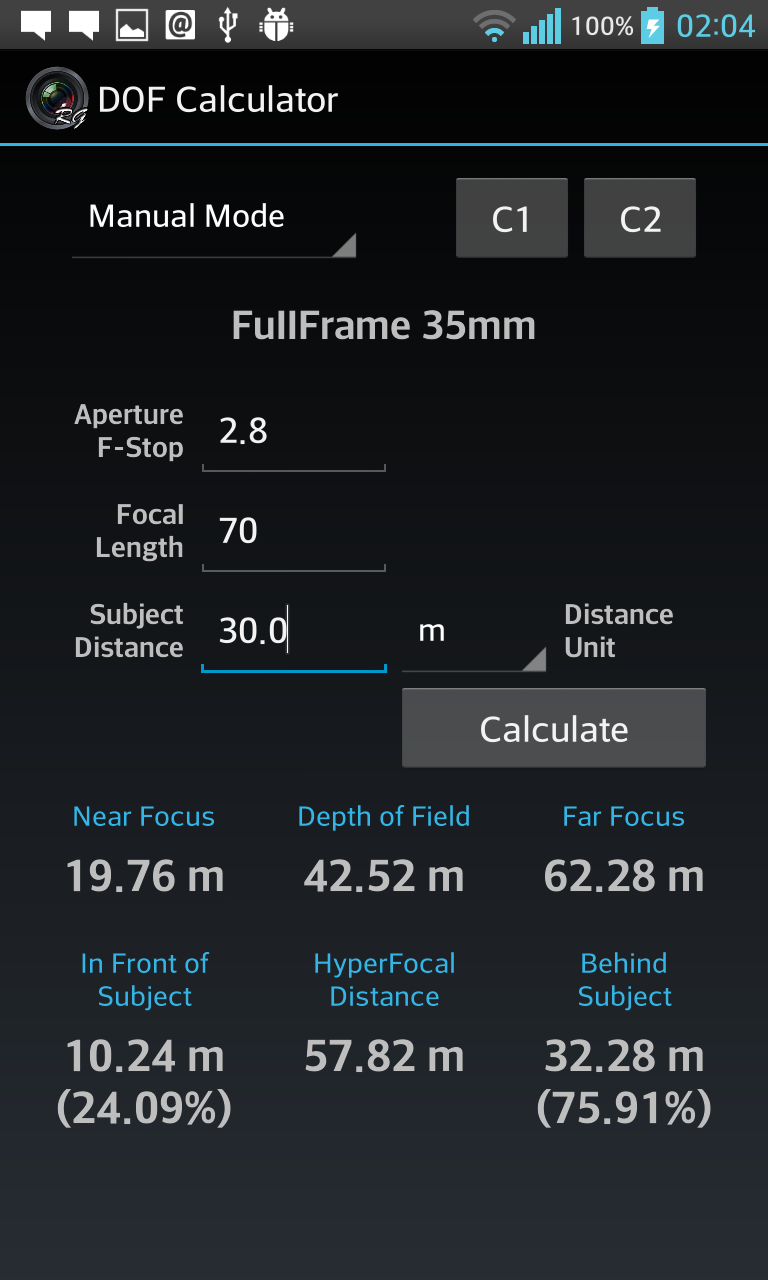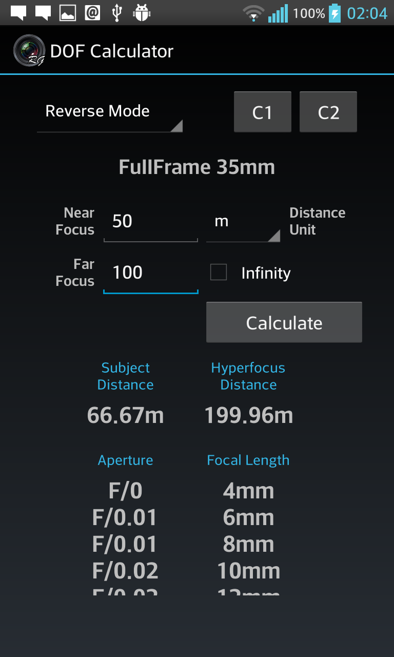 Depth of Field Calculator for Photographers. Calculates Hyperfocal Distance, Near Focus Limit, Far Focus limit, and Depth of Field (DOF). Has option to select teleconverters, automatically corrects focal length and apertures. Also supports Custom 1 and Custom 2, user editable custom settings for quick retrieval, ideal for multiple camera setup. Includes 1)Quick Mode ( with dropdown menus) 2)Manual Mode ( with edit boxes ) 3)Reverse Mode 4)Aperture Mode Quick Mode, lets user select most common settings using drop down menus for easy, quick and convenient selection. Manual Mode lets user enter values manually for maximum flexibility and professional users. Reverse Mode, takes Near Focus and Far Focus distance values and calculates all the possible combination of focal lengths and apertures to achieve the entered values. Aperture Mode lets user select Camera, Focal length, and Subject Distance, and calculates resultant depth of field against all aperture values. Supports more than 200 SLRs, DSLRs and Compact Cameras from Canon, Nikon, FujiFilm, Kodak, Olympus, Panasonic, Pentax, Samsung, Sigma, Sony, Four Third System, 35mm Film, Medium Formats, Large Formats, Blackmagic Cinema, Red, Super 16, Super 35, and many more Last used settings are automatically saved. SHORT CLICK on text to change its unit (meters, cm, feet, inches, etc) LONG CLICK on C1 C2 to edit saved values. This app contains Ads. Download DOF Calculator Pro for Ads Free and Permissions Free version.