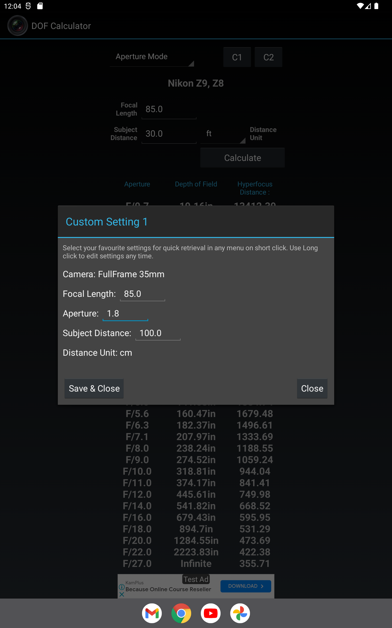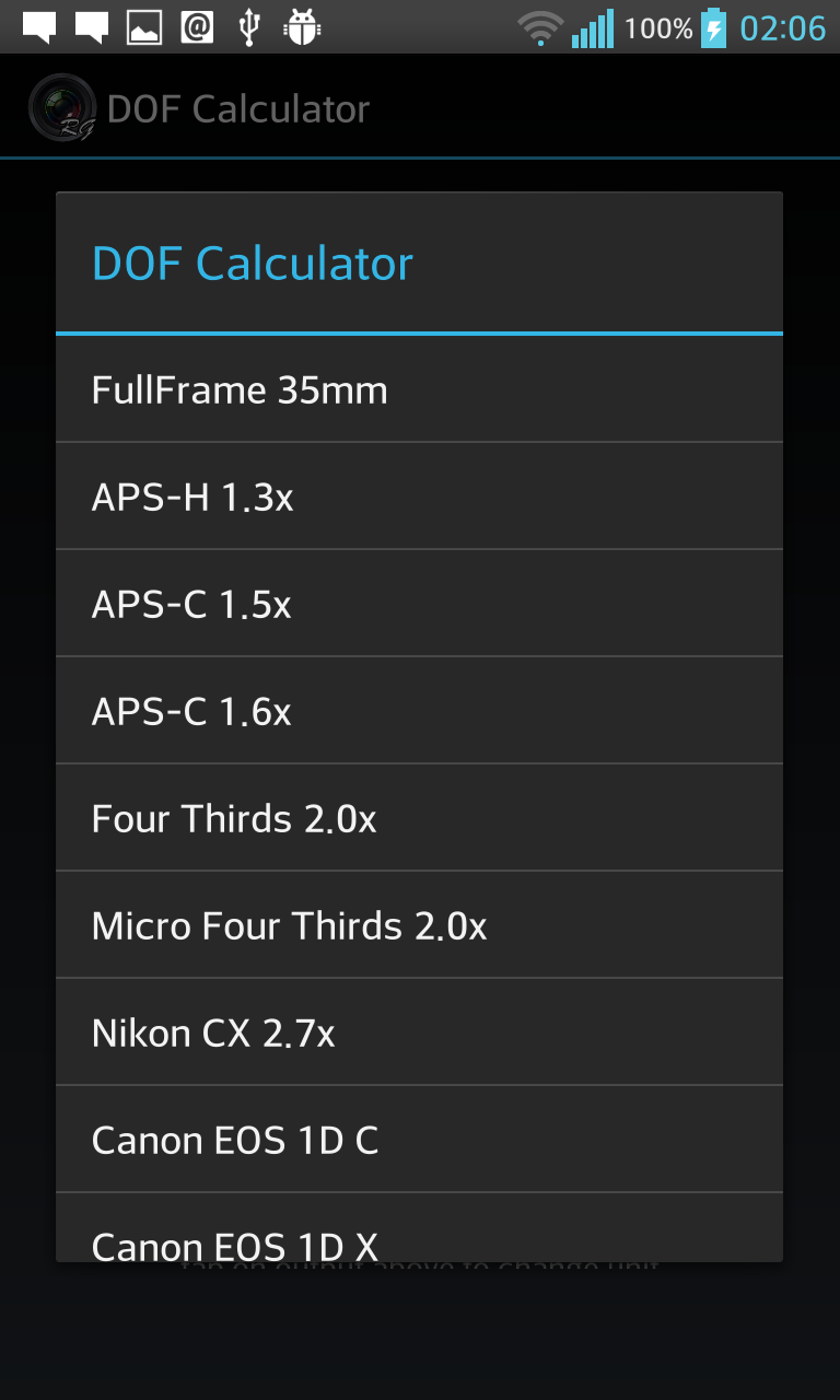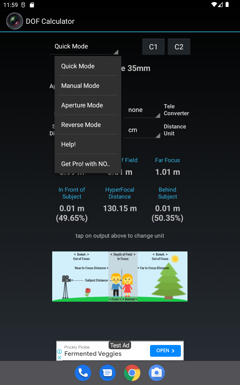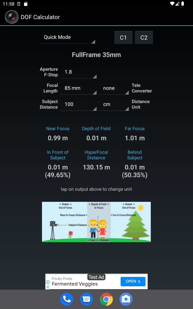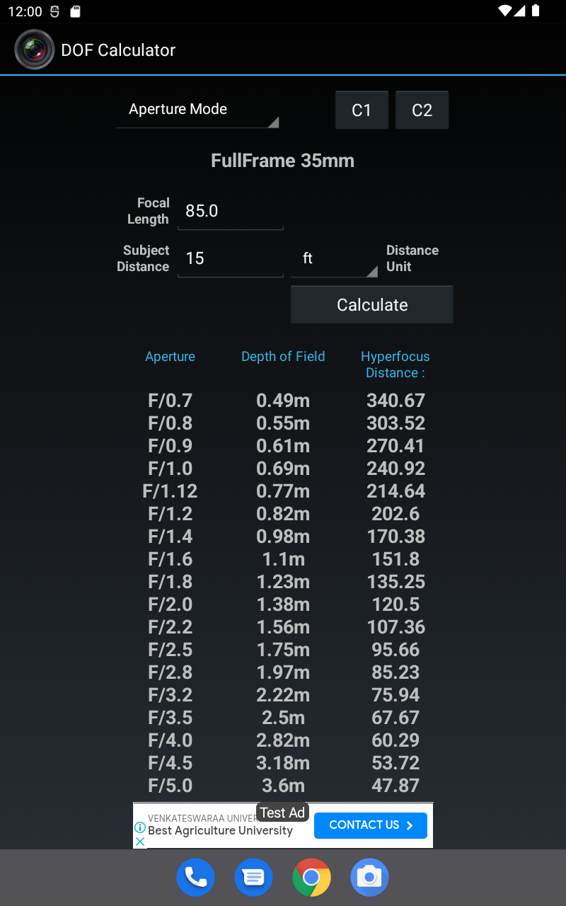 Depth of Field Calculator for Photographers. Calculates Hyperfocal Distance, Near Focus Limit, Far Focus limit, and Depth of Field (DOF). Has option to select teleconverters, automatically corrects focal length and apertures. Also supports Custom 1 and Custom 2, user editable custom settings for quick retrieval, ideal for multiple camera setup. Includes 1)Quick Mode ( with dropdown menus) 2)Manual Mode ( with edit boxes ) 3)Reverse Mode 4)Aperture Mode Quick Mode, lets user select most common settings using drop down menus for easy, quick and convenient selection. Manual Mode lets user enter values manually for maximum flexibility and professional users. Reverse Mode, takes Near Focus and Far Focus distance values and calculates all the possible combination of focal lengths and apertures to achieve the entered values. Aperture Mode lets user select Camera, Focal length, and Subject Distance, and calculates resultant depth of field against all aperture values. Supports more than 200 SLRs, DSLRs and Compact Cameras from Canon, Nikon, FujiFilm, Kodak, Olympus, Panasonic, Pentax, Samsung, Sigma, Sony, Four Third System, 35mm Film, Medium Formats, Large Formats, Blackmagic Cinema, Red, Super 16, Super 35, and many more Last used settings are automatically saved. SHORT CLICK on text to change its unit (meters, cm, feet, inches, etc) LONG CLICK on C1 C2 to edit saved values. This app contains Ads. Download DOF Calculator Pro for Ads Free and Permissions Free version.