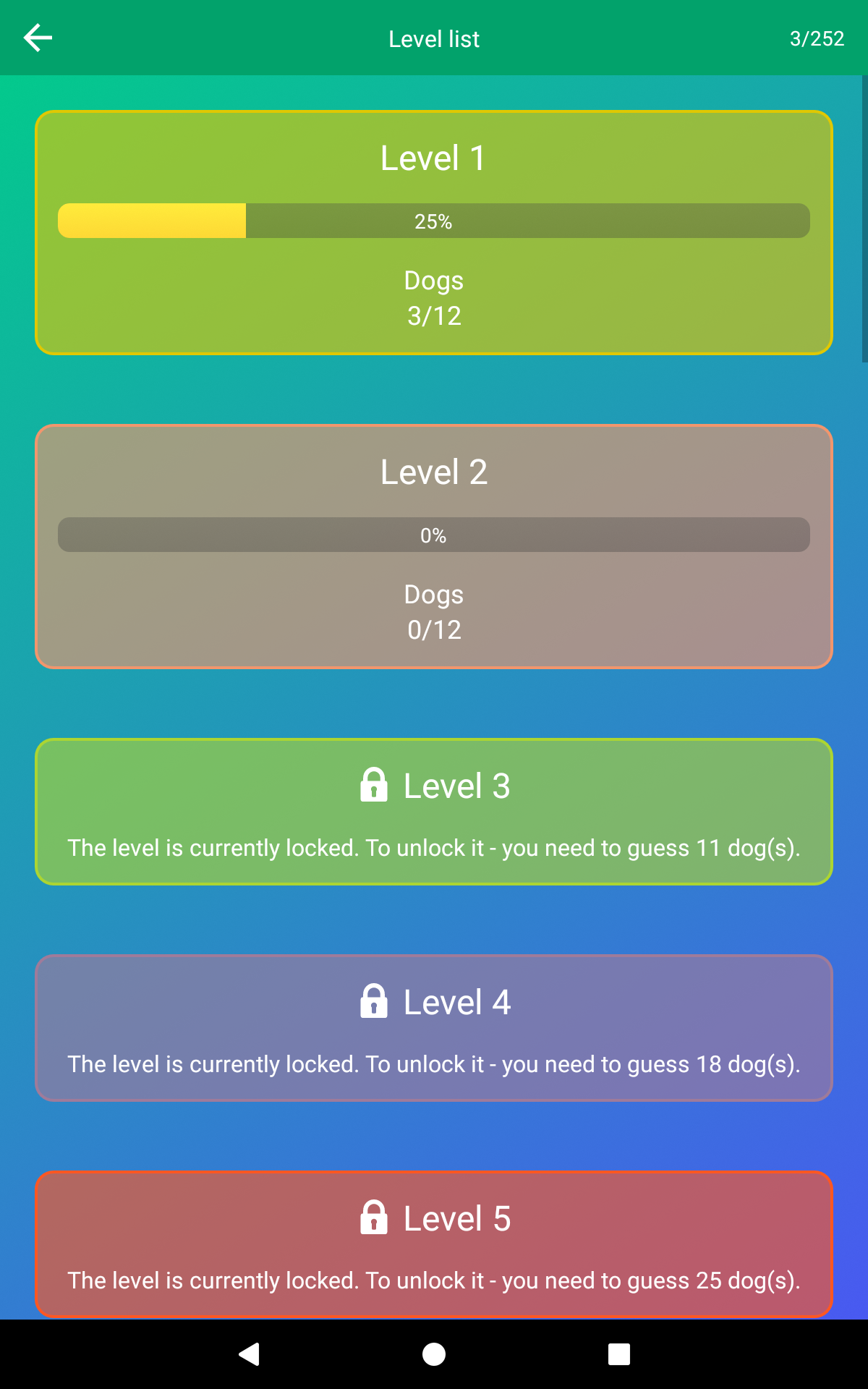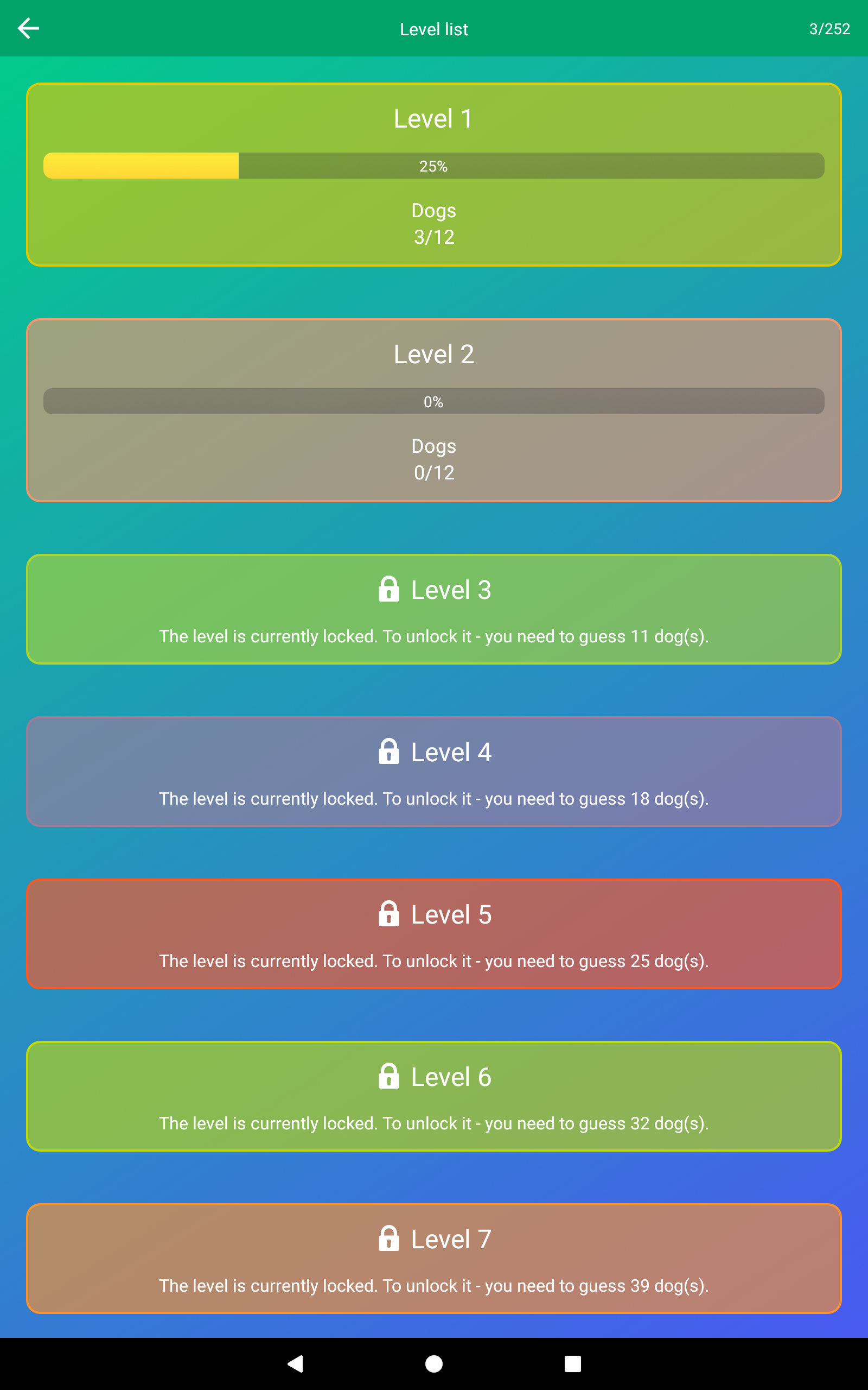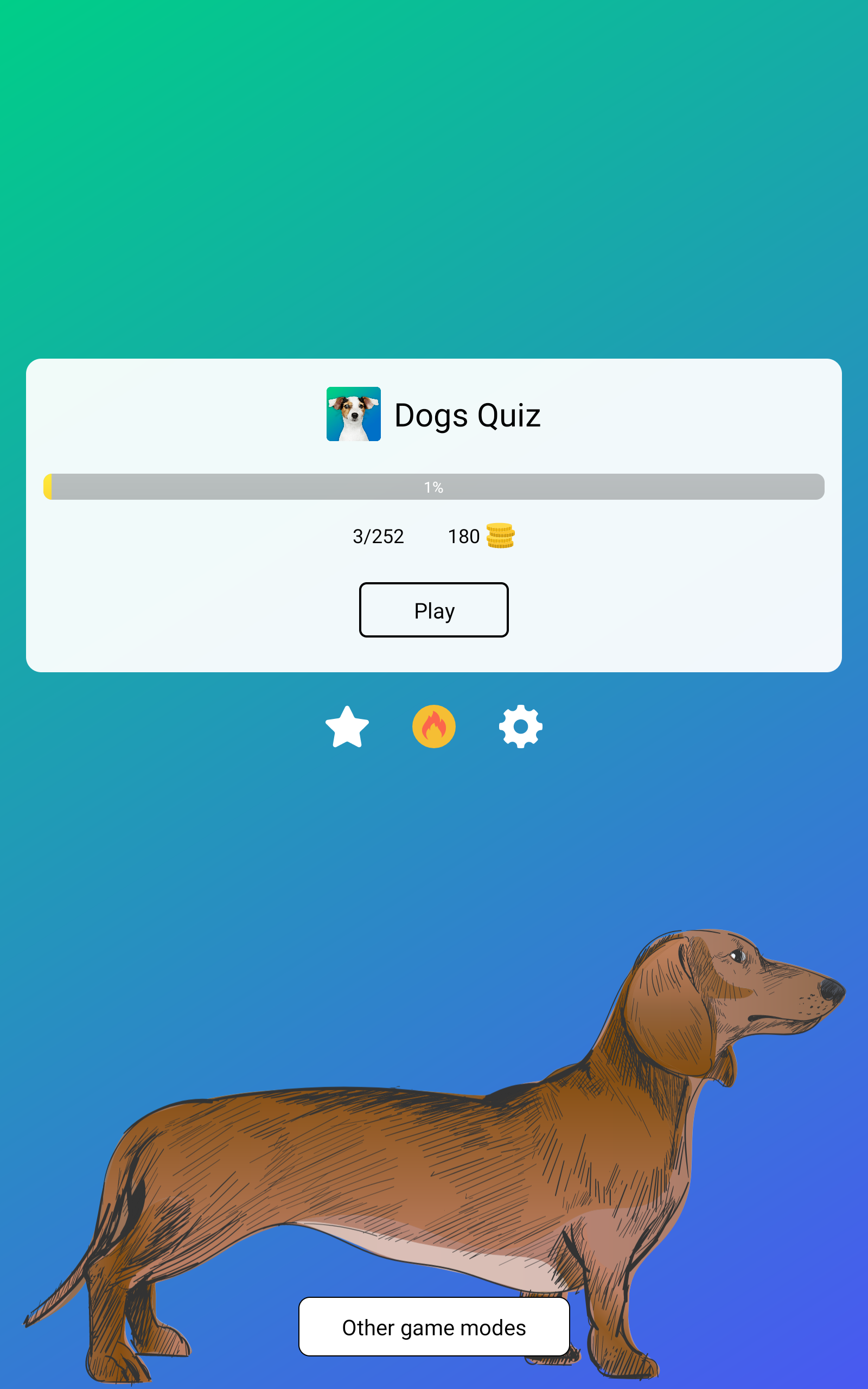 Do you like dogs? Do you think you know everything about them? Challenge yourself and guess all the famous dog breeds in this application! The game has more than 20 levels and more than 250 questions. Do you know how the Yorkshire Terrier looks like? Can you guess the Border Collie from the photo? Can you tell the difference between Siberian Husky and Akita? Do you know the difference between the Airedale Terrier and Welsh Terrier? They are very similar! This quiz will help you to understand these details, will help increase your knowledge about various dogs and learn a lot! 🐶 GAME MODES 🐶 The quiz has one main mode and 3 additional ones. You will always find what to do. ★ THE MAIN MODE. Here you need to go through more than 20 levels and guess from the photo all the dog breeds represented in the game. From the most famous (Dachshund, Poodle, German Shepherd) to more rare (Hygen Hound, Picardy Spaniel, Galgo Español). You need to guess the breed of the dog by letters, if it is difficult, then you can take hints. Challenge yourself and complete the game 100%! ☆ THE MODE «Arcade». This is an additional mode. In it you need to guess the breed of the dog, opening as few parts of the picture as possible. The fewer parts you will open, the more points you will get! ☆ THE MODE «Guess the Dog». This is also an additional game mode. Here you need to guess from the photos as many dogs as possible in a minute and make the fewest number of mistakes. ☆ THE MODE «True or False». The last additional mode. In it you need to compare the picture with the name of the breed and answer true or false. You can also compete with other players in additional game modes. Collect as many points as possible in each mode and take the first position! If you only want to study dog breeds, and not compete with others, then choose the "Free Mode" and play without haste and for your pleasure! 🐶 APPLICATION FEATURES 🐶 ☆ The application has a large number of dog breeds with photos. ☆ Many levels and game modes. ☆ Daily bonuses for entering the game and completing new levels. ☆ There are statistics for each level and the game as a whole. Complete everything 100% and become a true expert of dogs! ☆ There are useful hints which will help you in difficult situations. ☆ Do you want to know more about the dog breed? Just click on the button below the photo, and you will see the built-in Wikipedia, where you can find answers to all your questions. ☆ Competitive game modes! Win and be the first in the leaderboard! ☆ Do you want to take a look at the photo better? Just click on it! ☆ Simple and intuitive interface. ☆ You can play the game on both the phone and the tablet. ☆ You do not need the Internet to play. It may be needed only to access Wikipedia and enlarge the pictures. ☆ The application has been translated into 13 languages! You can change the language of questions in the settings. Learn new breeds of dogs and repeat knowledge in a playful way with this application! 🐶 Background psd created by rawpixel.com - www.freepik.com Dog vector created by rawpixel.com - www.freepik.com